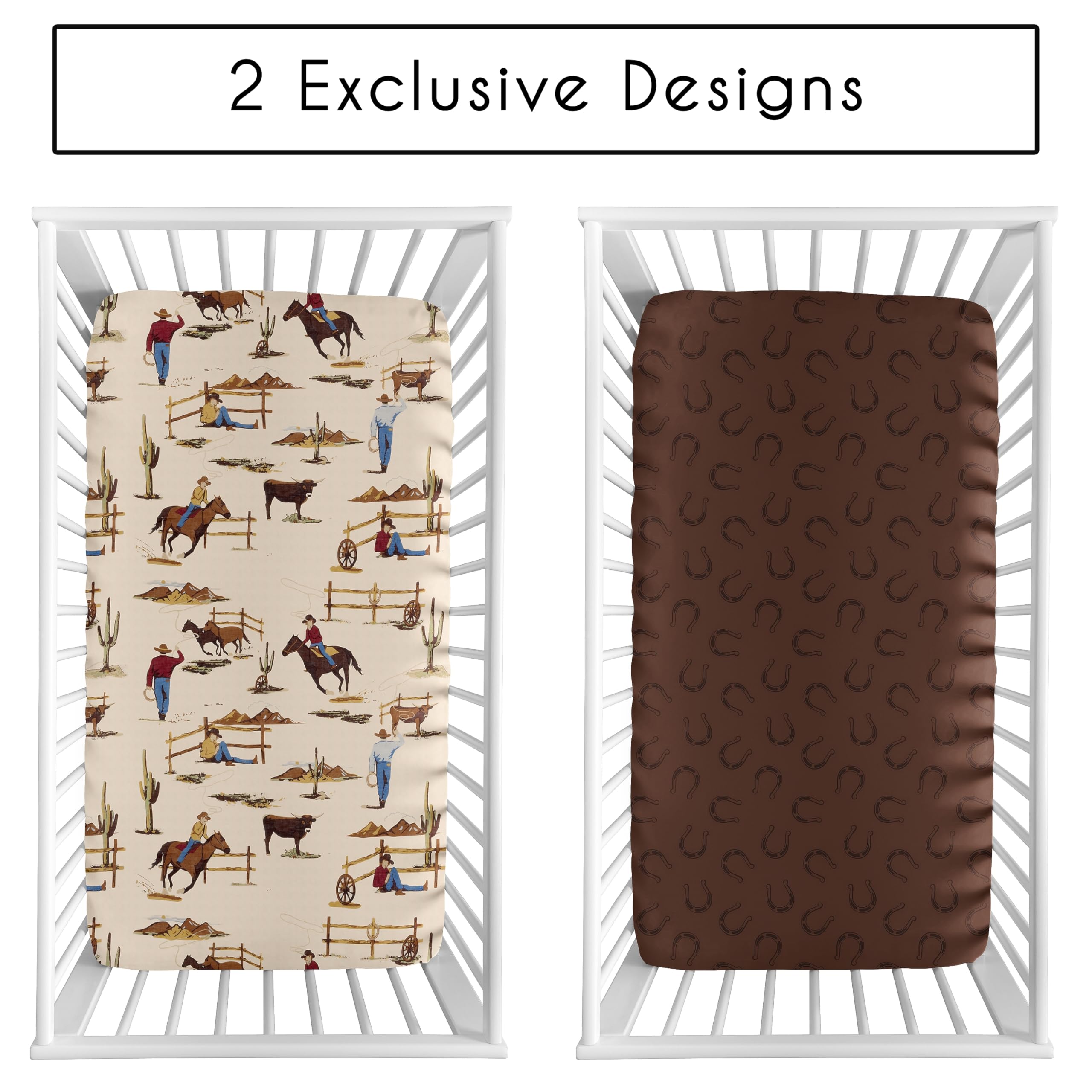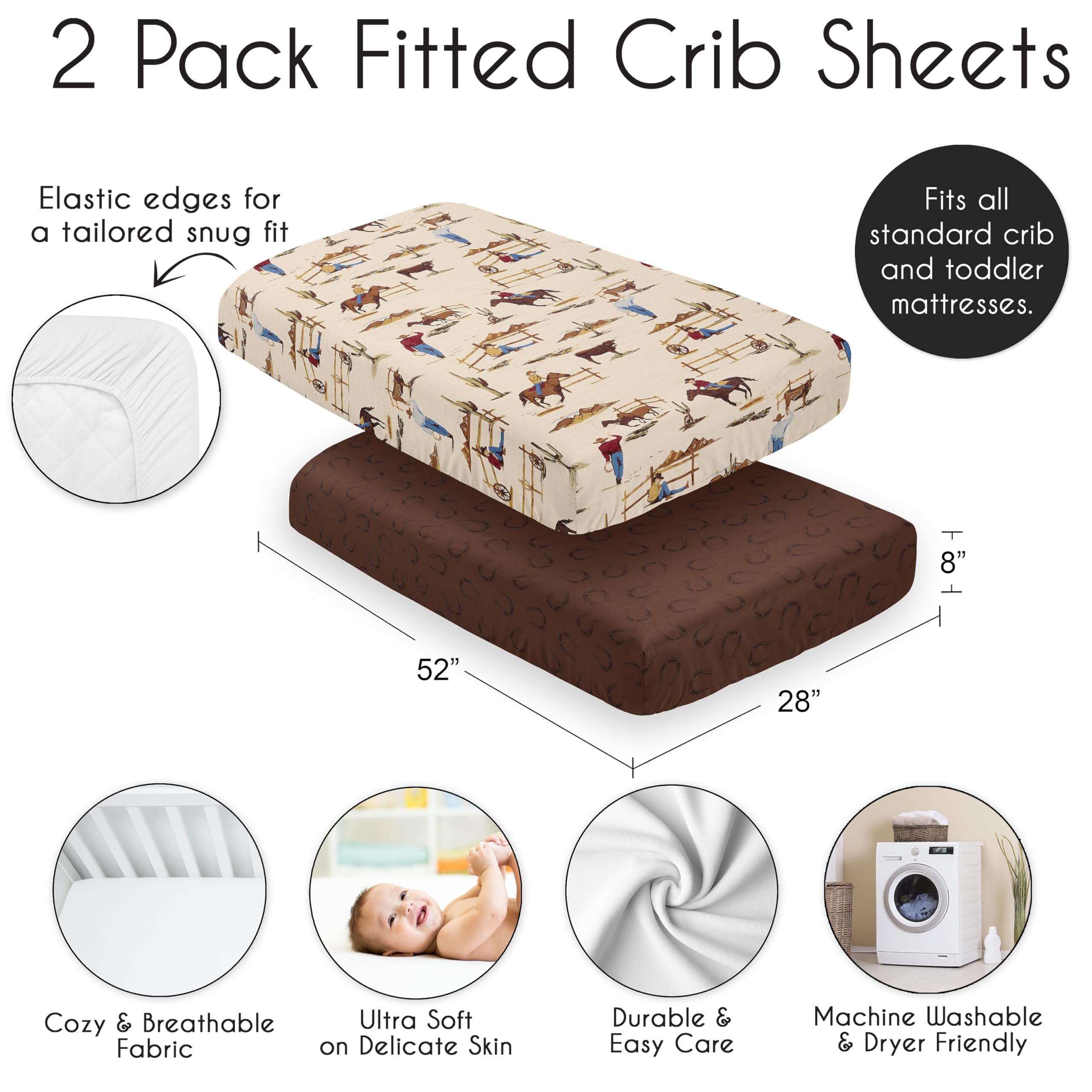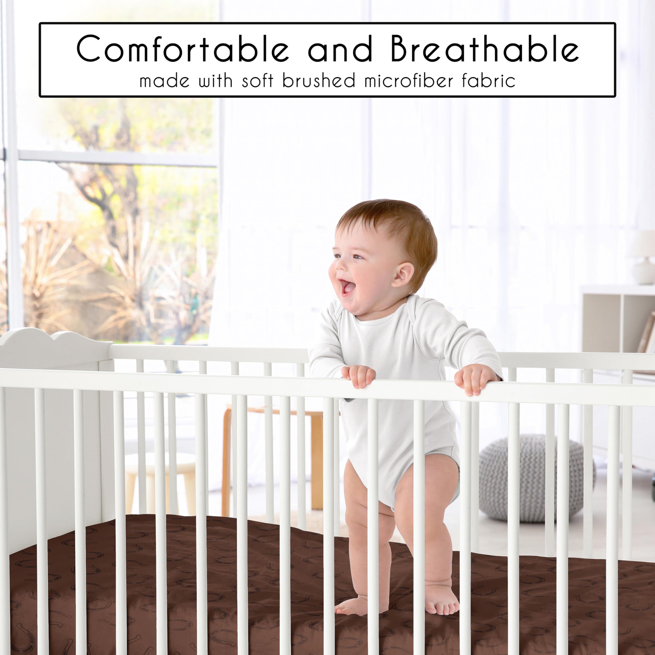 SNUG FIT: Includes: (2) Baby Crib Sheets: 52in. x 28in. x 8in. Our newborn standard crib sheets fit snugly, with premium elastic sewn around the entire bottom edge for a secure fit on most standard sized cribs & toddler beds, to reduce shifting. This microfiber cribsheets set features an exclusive design of a brown horseshoe print paired with neutral taupe illustrations of wild western country cowboy farm animals & horses print & is gentle on delicate skin to foster a soothing sleep environment.