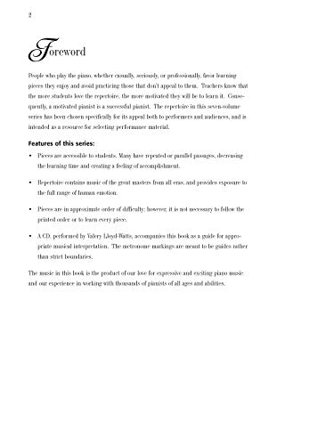 This new series features carefully selected performance repertoire of the great masters from all eras. Each piece is accessible to students and creates a feeling of accomplishment. Diverse in style and expression, each selection features melodic, rhythmic, or harmonic patterning to allow for ease in teaching and memorization. The CD, performed by Valery Lloyd-Watts, provides a powerful auditory tool for musical interpretation. Valery Lloyd-Watts studied at the Conservatory of Music in Toronto and the Royal College of Music in London. She earned a Master of Music degree from the University of Wisconsin, where she studied with Paul Badura-Skoda. She co-authored the text Studying Suzuki Piano: More than Music, which was endorsed by Dr. Suzuki.