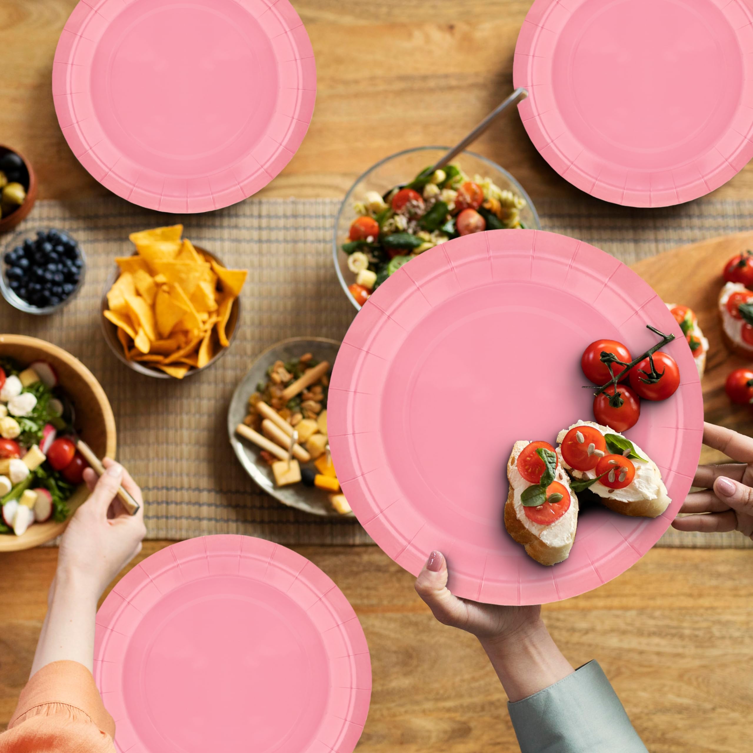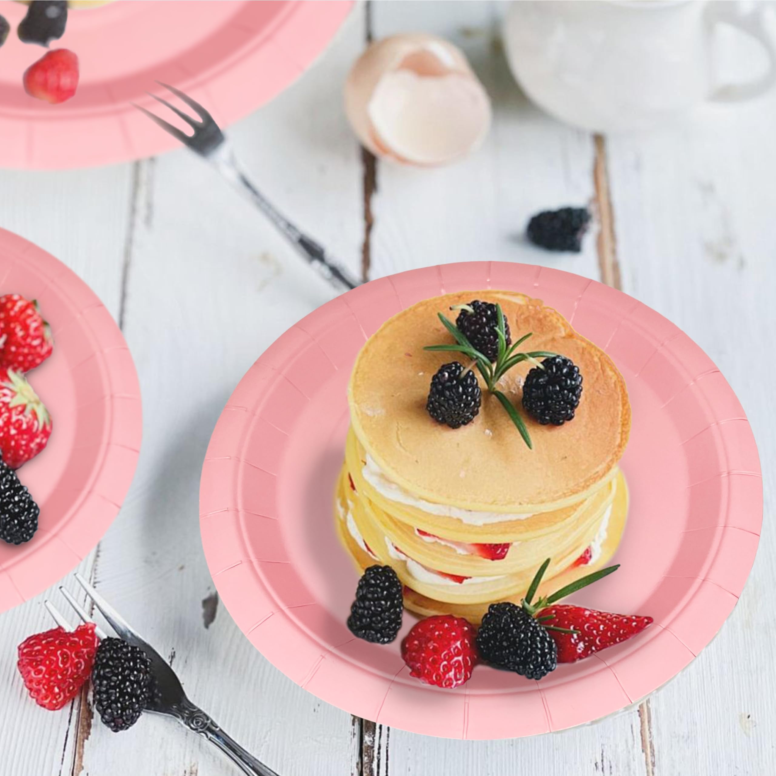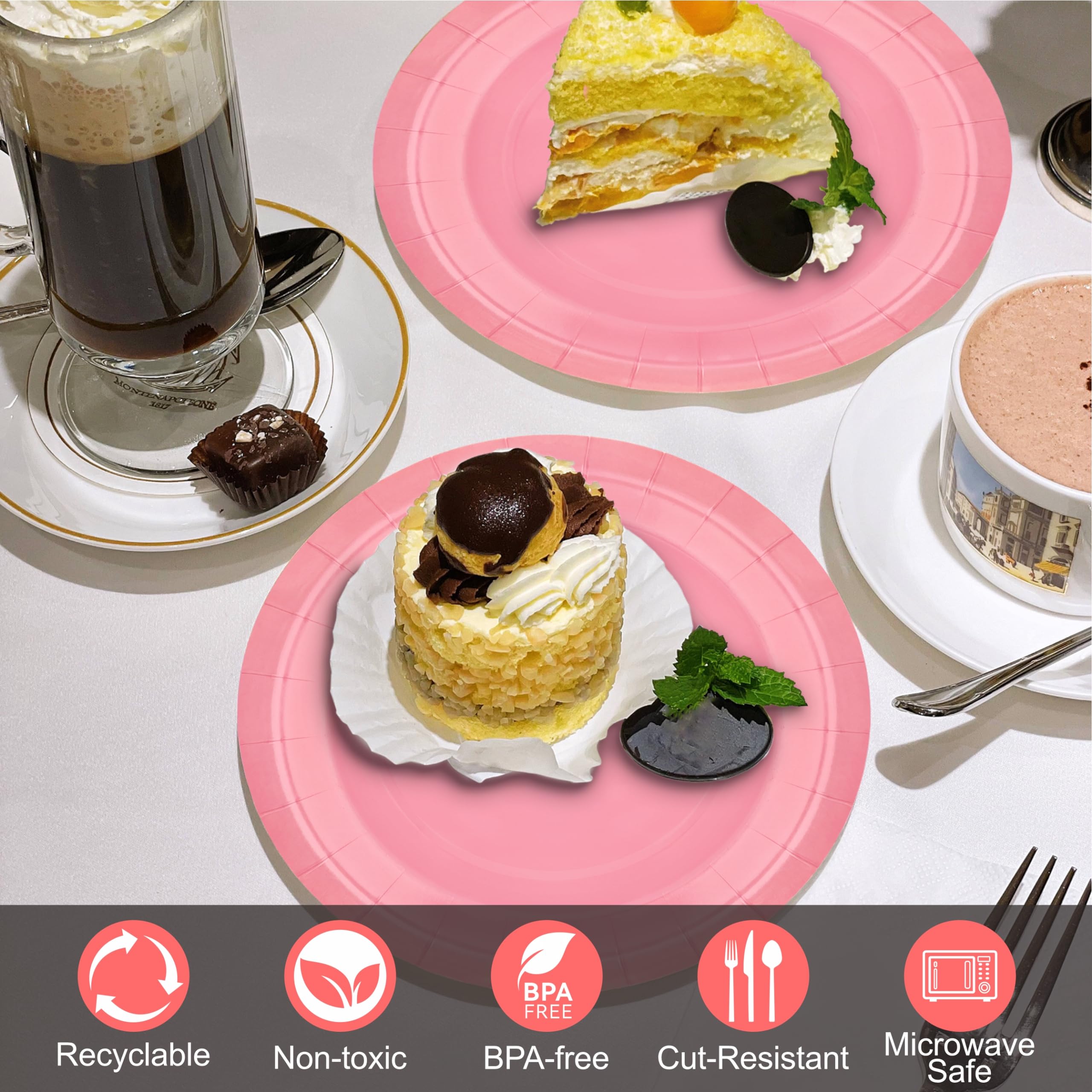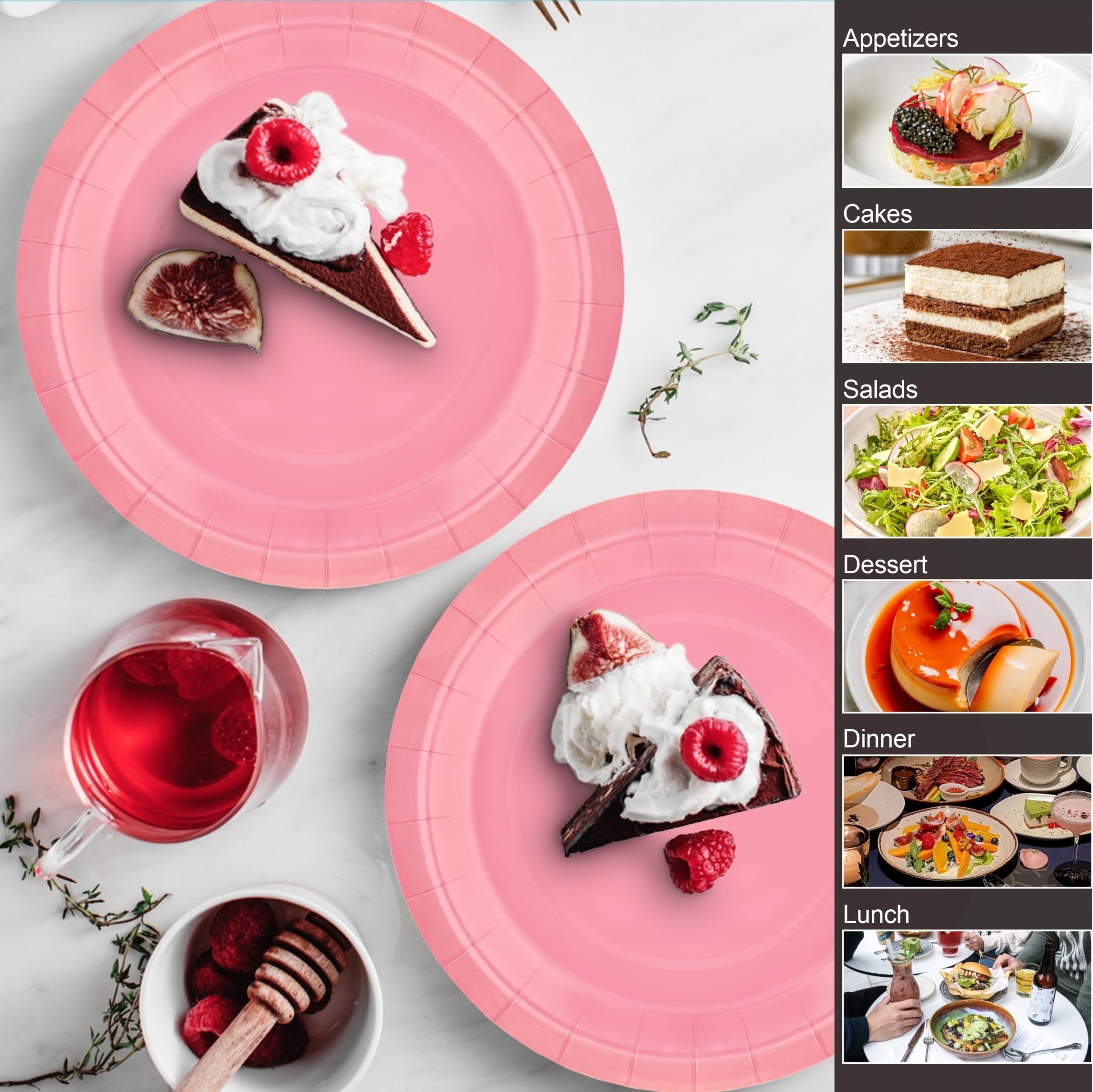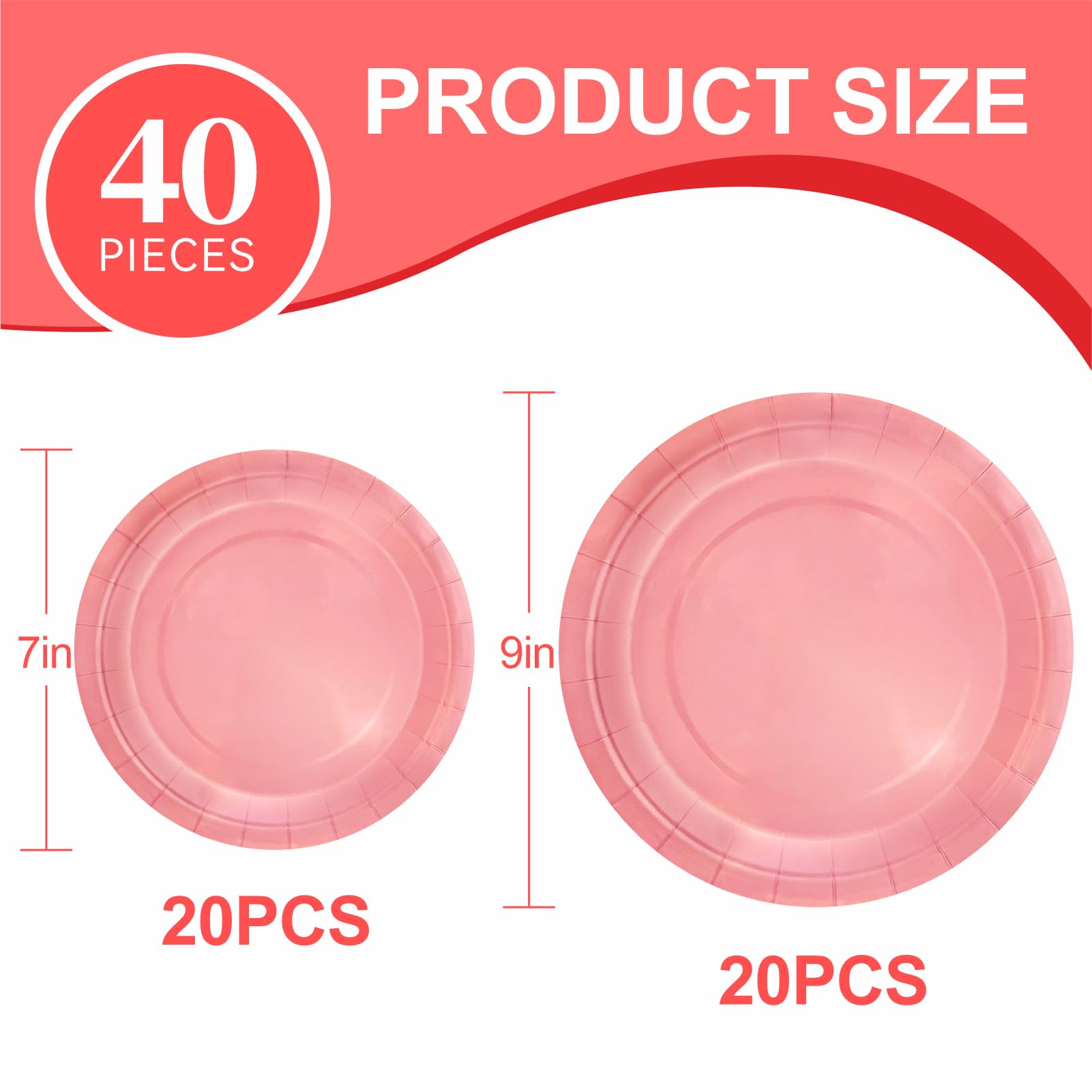 DISPOSABLE PAPER PLATES:Disposable Dinner Plate Set Included: 20pcs 9" Dinner plates, 20pcs 7" Dessert Plates.Disposable paper plates also can hold chips, salads, appetizers, desserts, breads, pastas, pizzas, and more, which will add fun to any party.