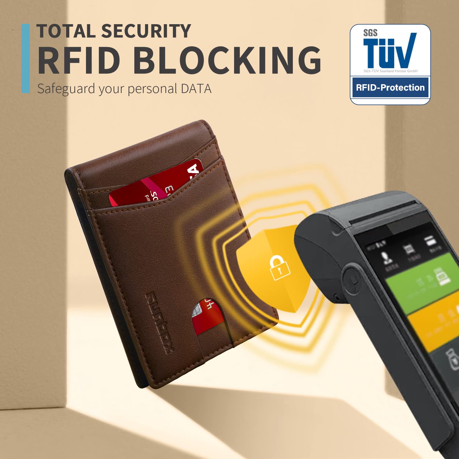 RFID Blocking - Our wallets are equipped with advanced RFID SECURE Technology, a unique metal composite, engineered specifically to block 13.56 MHz or higher RFID signals and protect the valuable information stored on RFID chips from unauthorized scans. License and ID cards will be protected effectively. Blocking the 13.56 MHz band and protect against data theft by RFID scanners