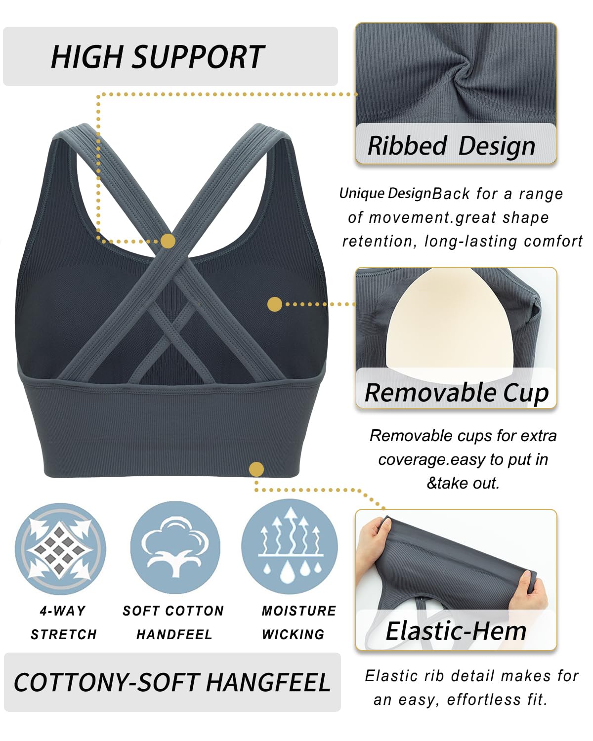 WHAT CAN WE OFFER YOU:Moisture-wicking Technology Metial Which Mean that You Can Enjoy Keeping Your Body Cool and Dry.Super Soft Elastic Band for Comfort and Movement Which Will Allow You Can Enjoy Sinking into Your Practice without Sacrificing Comfort.Built for High Support sports bras for women large bust so You Will Get Staying Fit & Focused.We Wear-tested by Our In-house Team for the Perfect Fit,Goodbye Old Bra !!