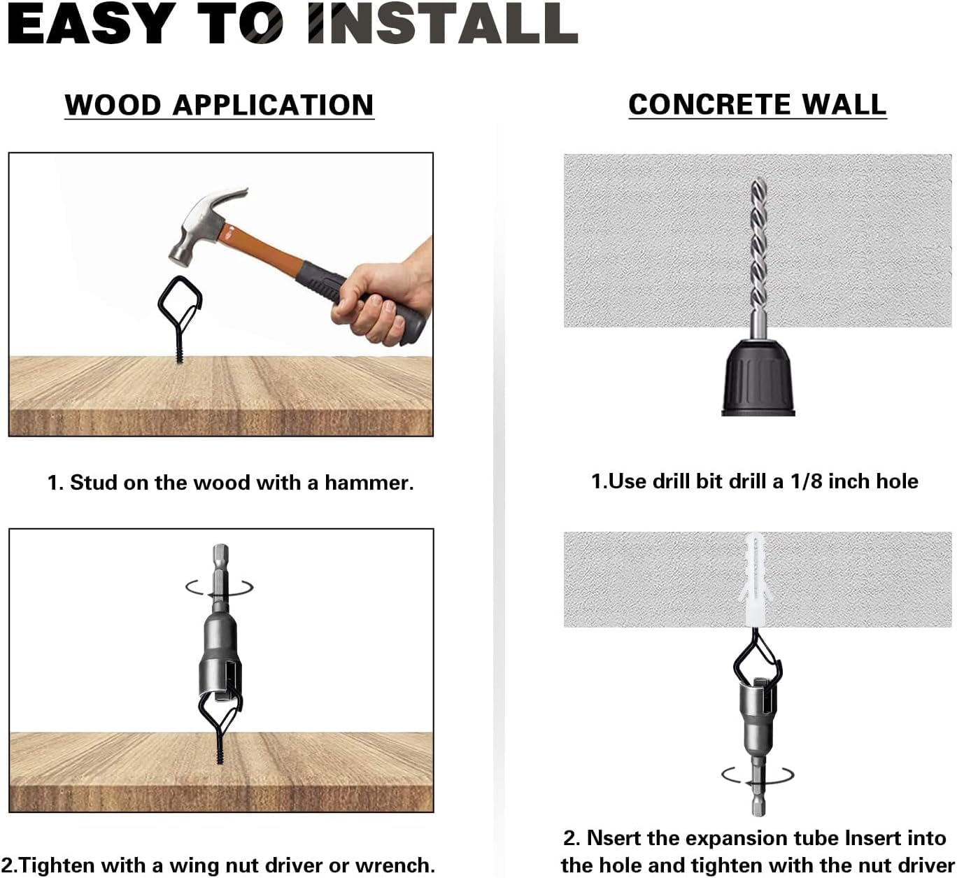 【Easy to Install】These outdoor hooks for string lights and plants are very easy to install. You can hammer it into the wood or screw it into the wood with a wing nut driver. If you want to mount to a hard wall with these ceiling cup hooks, you will need to pre-drill the holes.