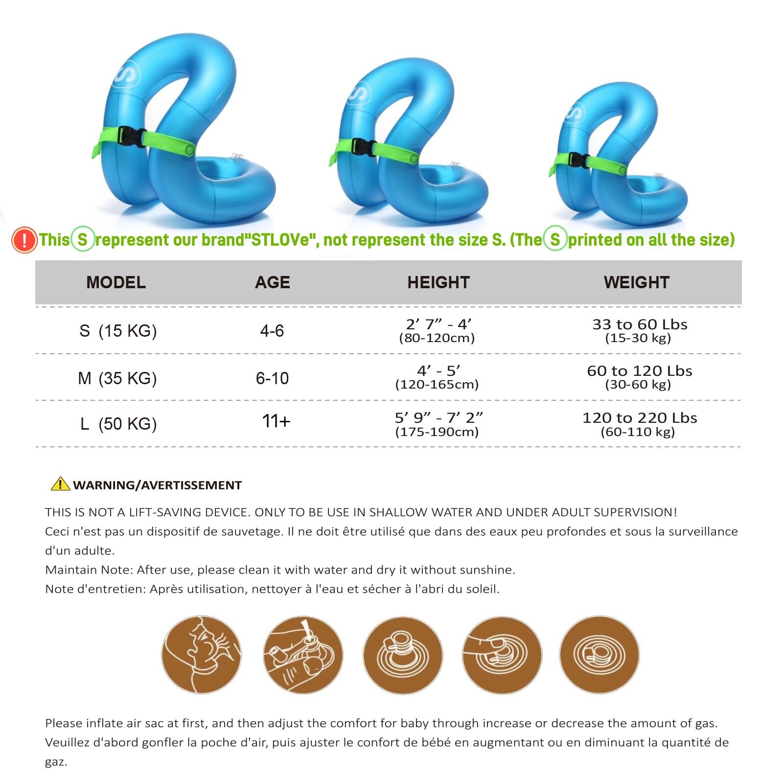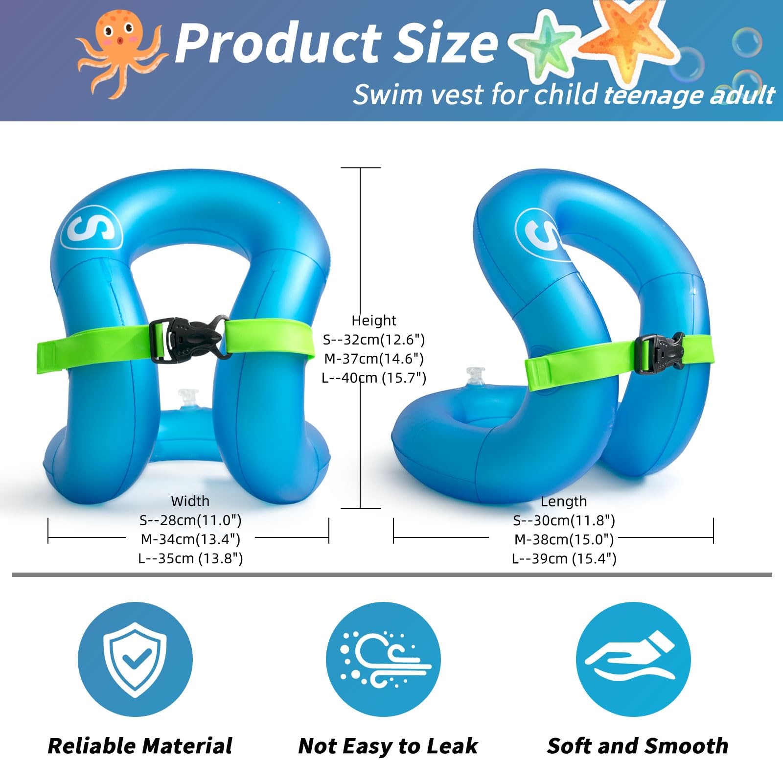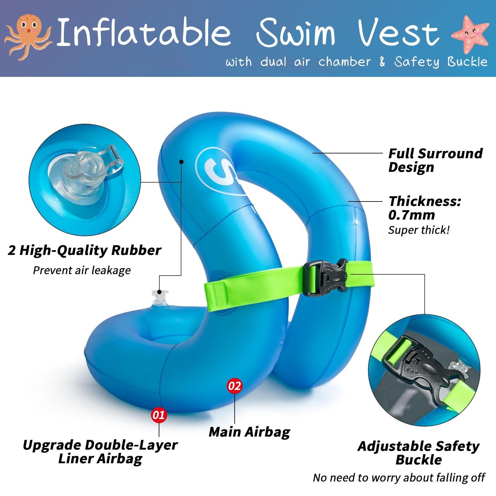🏊Dual Air Chambers & Adjustable Safety Buckle for enhanced Safety. Kids will feel secure and more confident in the water while they are learning to swim.