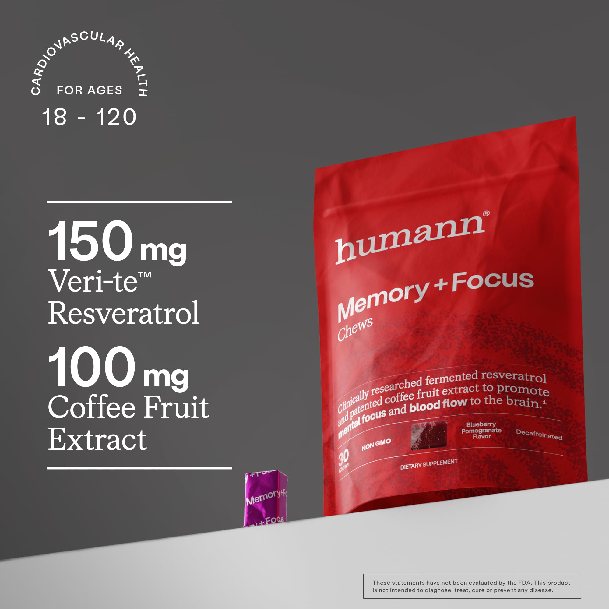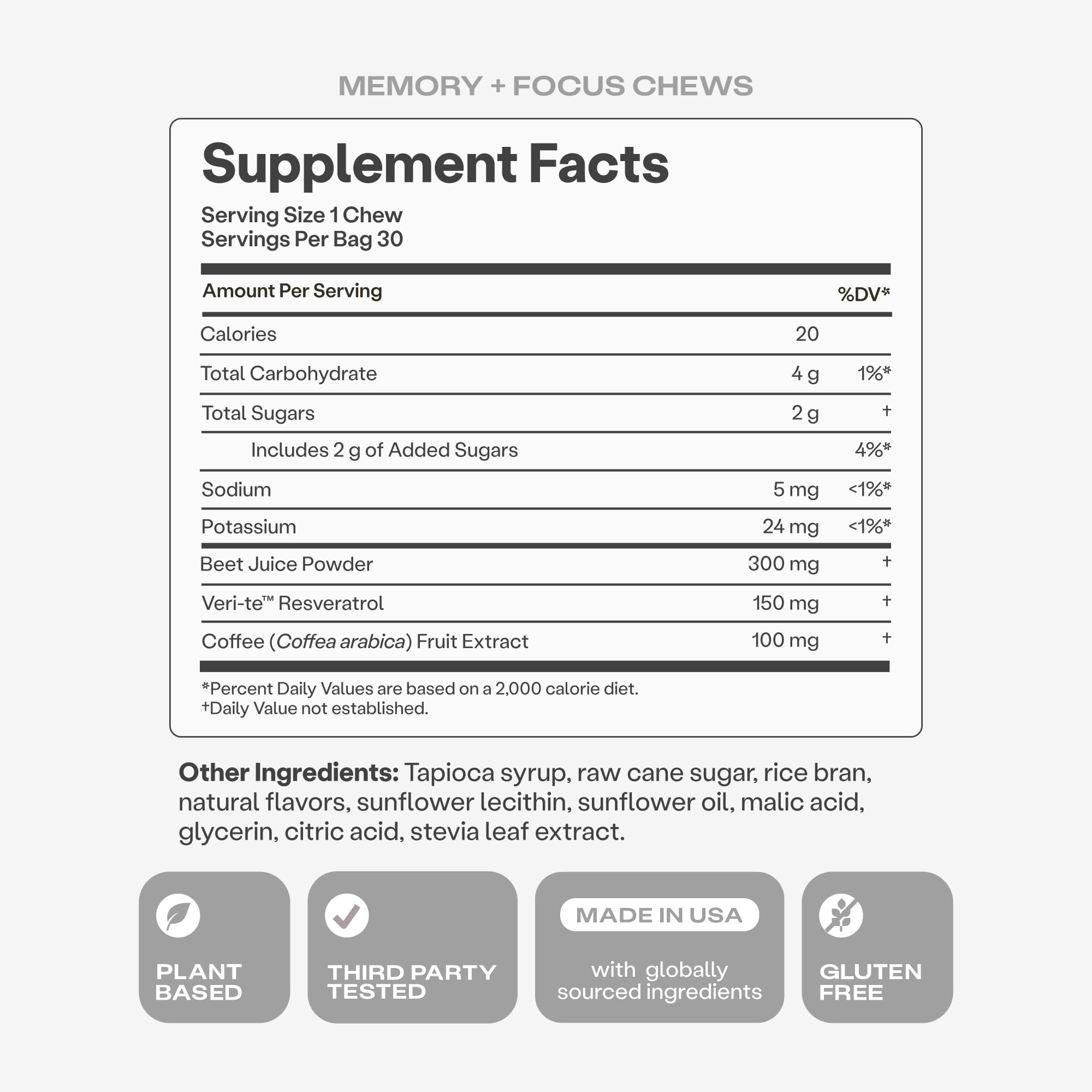 SUPPORT ALERTNESS: Each chew is uniquely formulated to deliver 150mg of clinically studied fermented Resveratrol, a nootropic, plus 100mg of patented Coffee Fruit Extract and 300mg of USA-grown Beet Root Powder without caffeine.