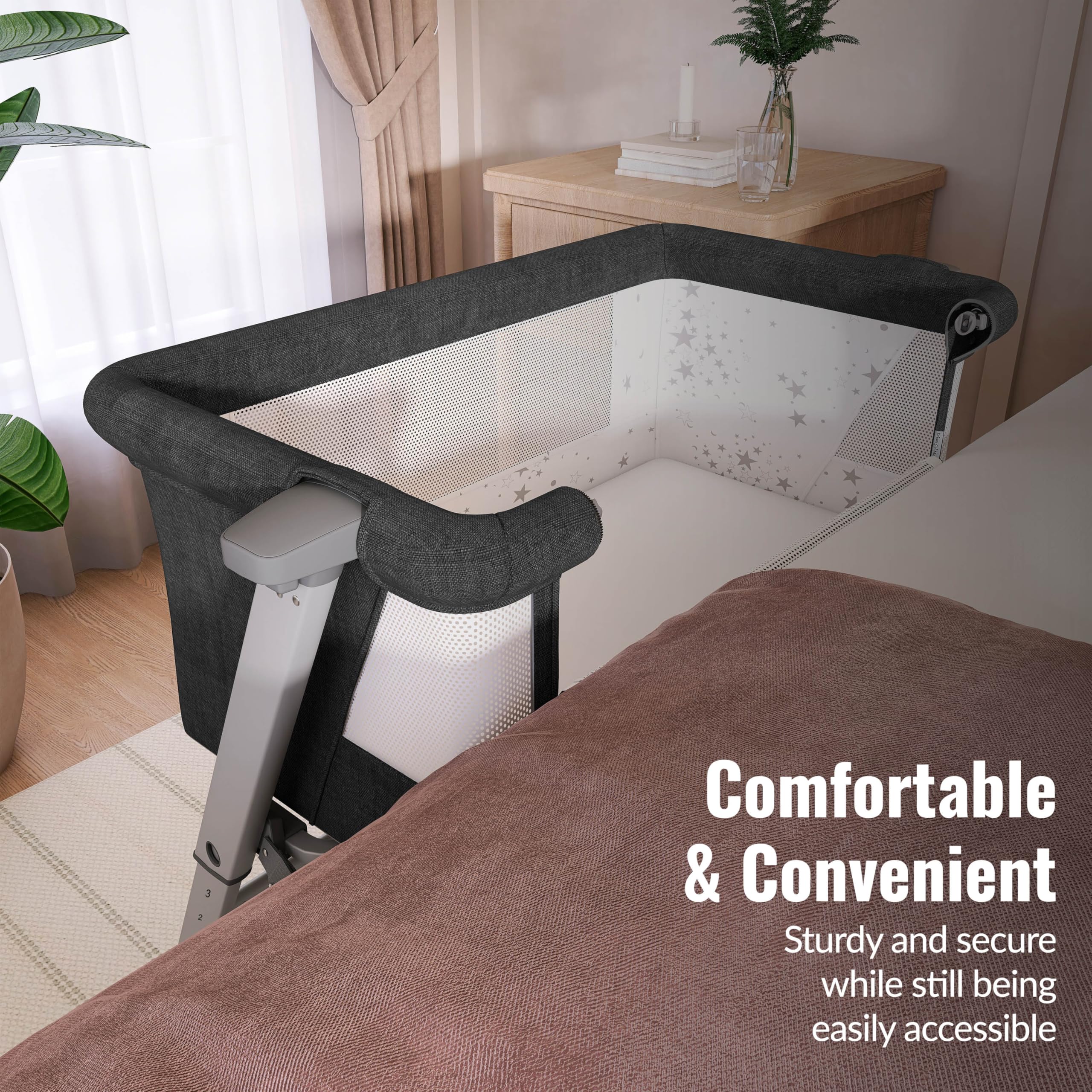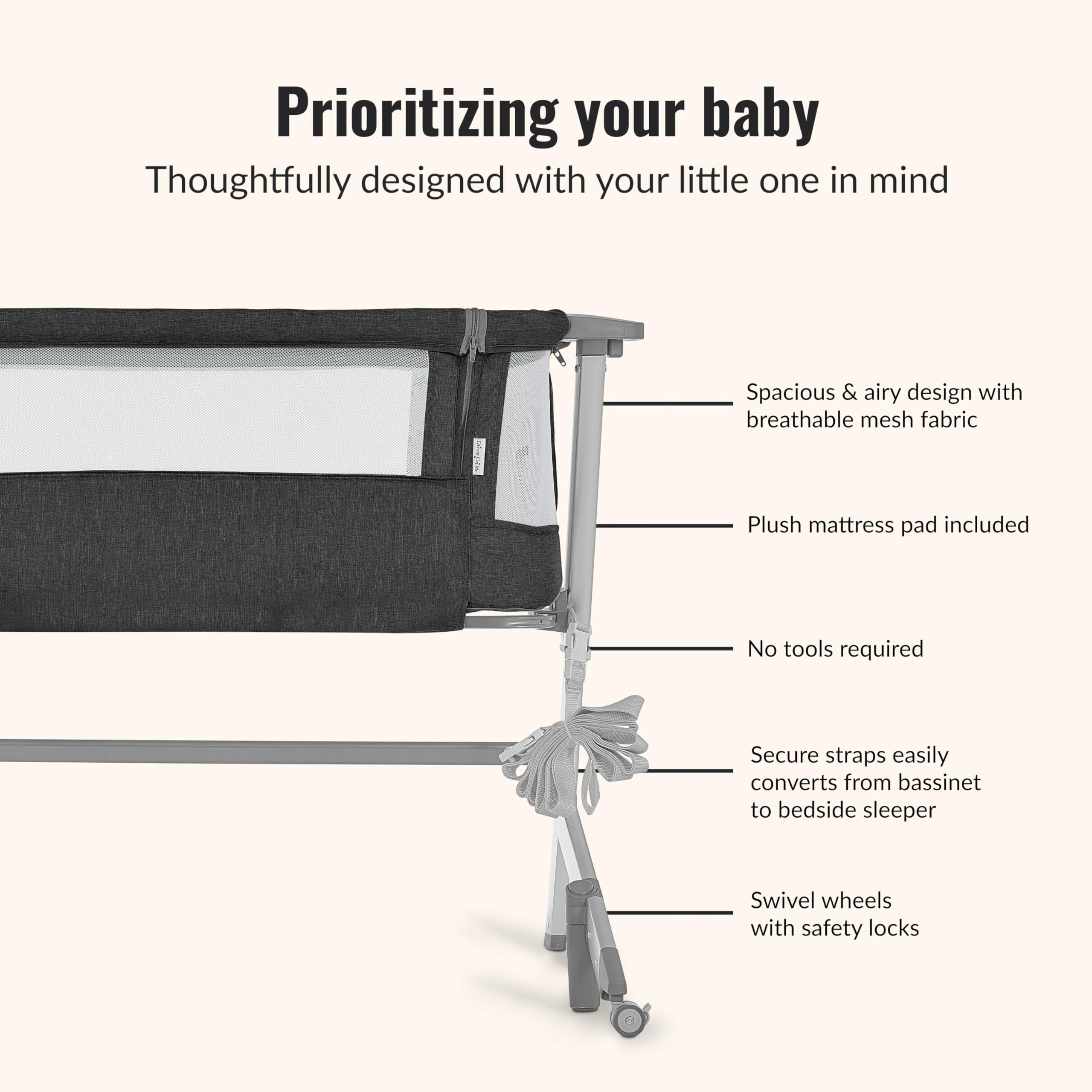 CONVENIENT FEATURES: Enjoy a quick tool-free assembly. The sturdy strap system allows you to easily secure the bassinet to your bed frame. Lightweight and mobile, enough to move from room to room for convenience