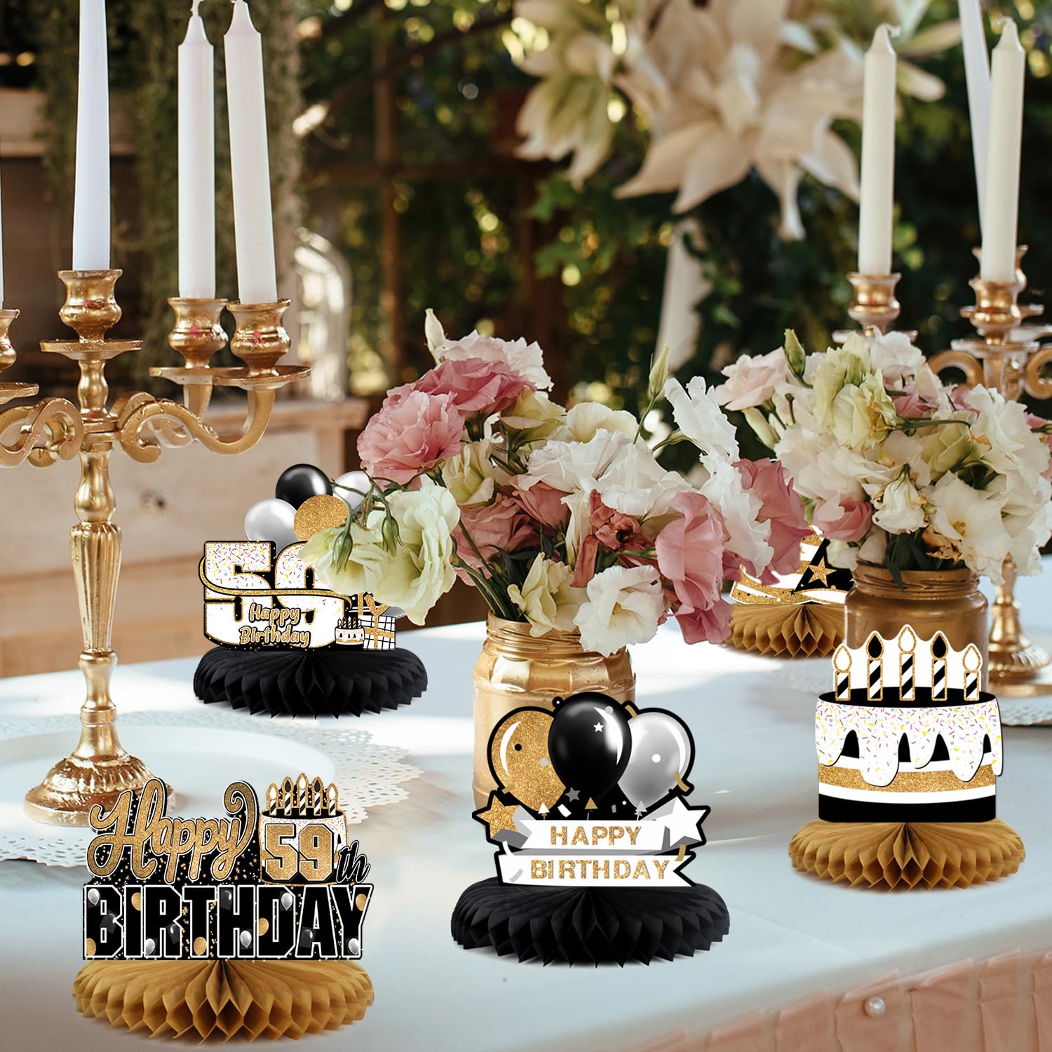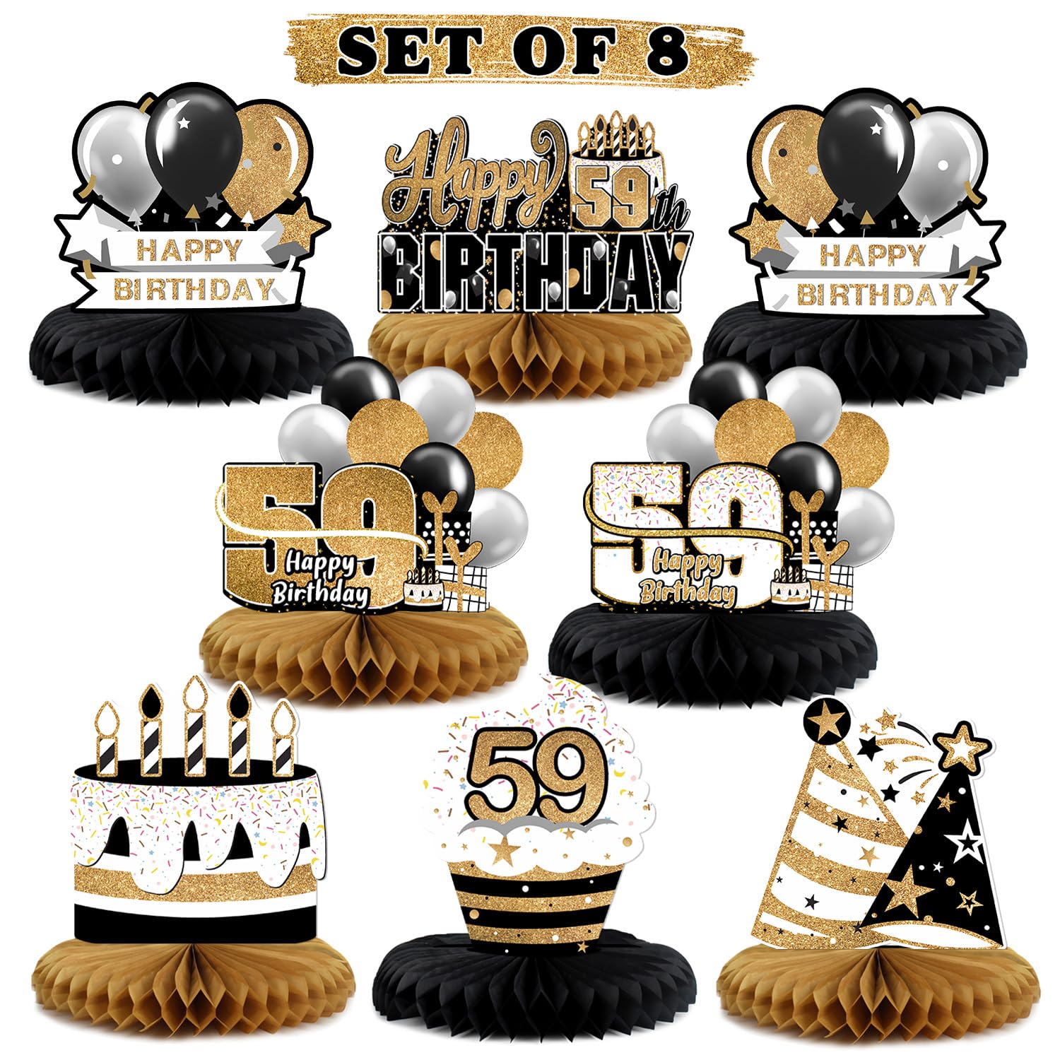 [WHAT YOU GET] Comes with 8pcs "59th Birthday" Gold cake star balloon table honeycomb ,made of thick paper and great details sign.Take pictures will very pretty !