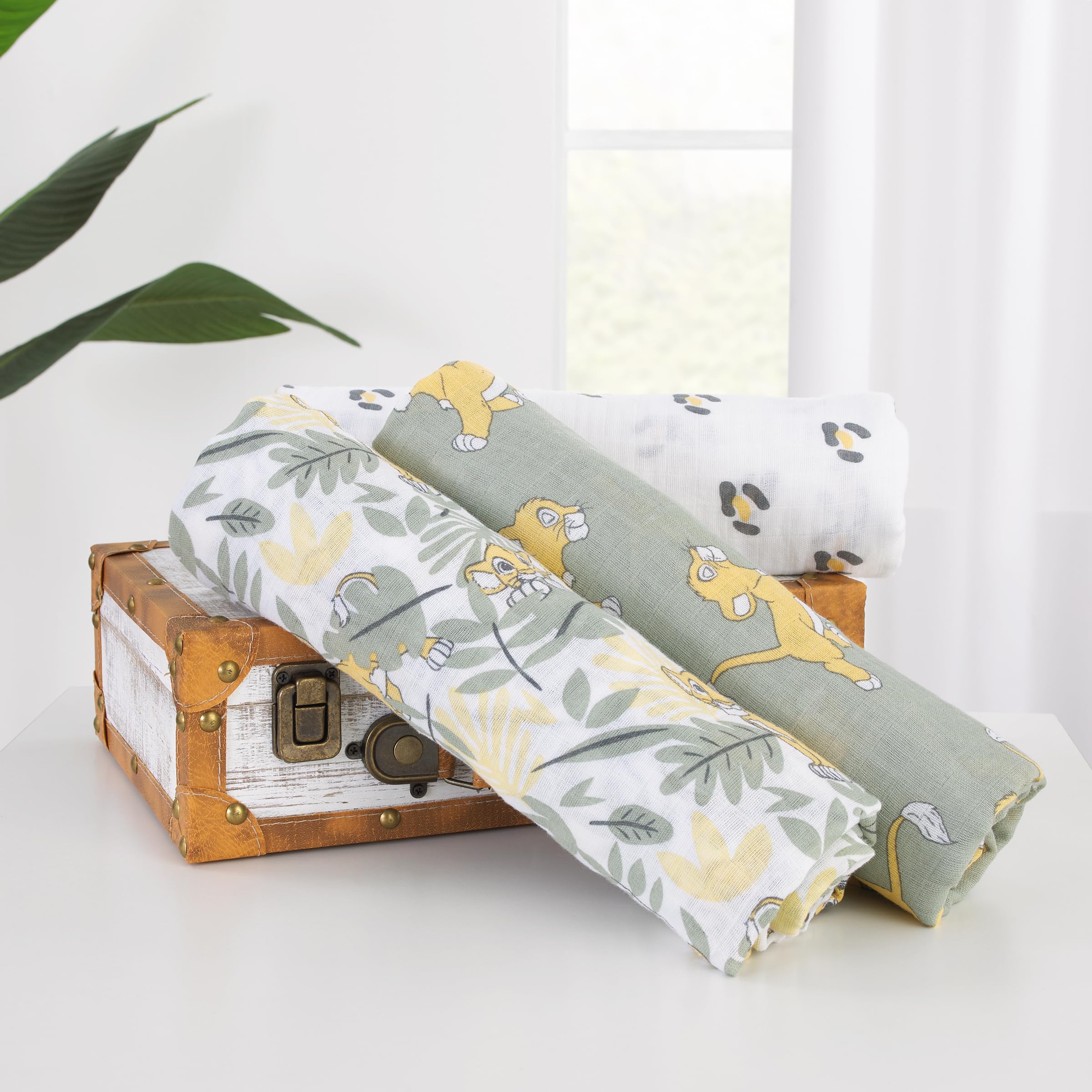 The Lion King 3pc Swaddle Set Includes a set of 3 muslin swaddle baby blankets