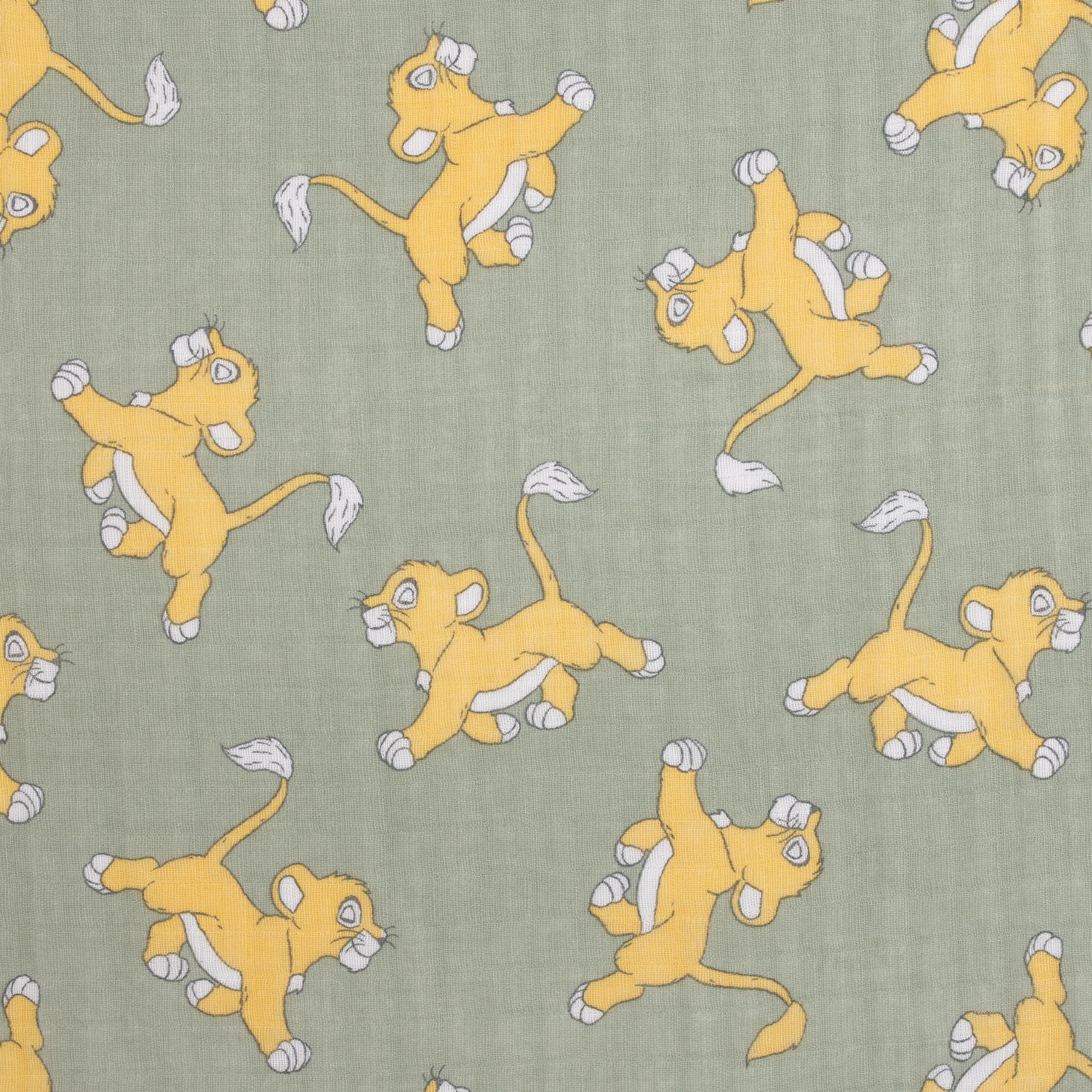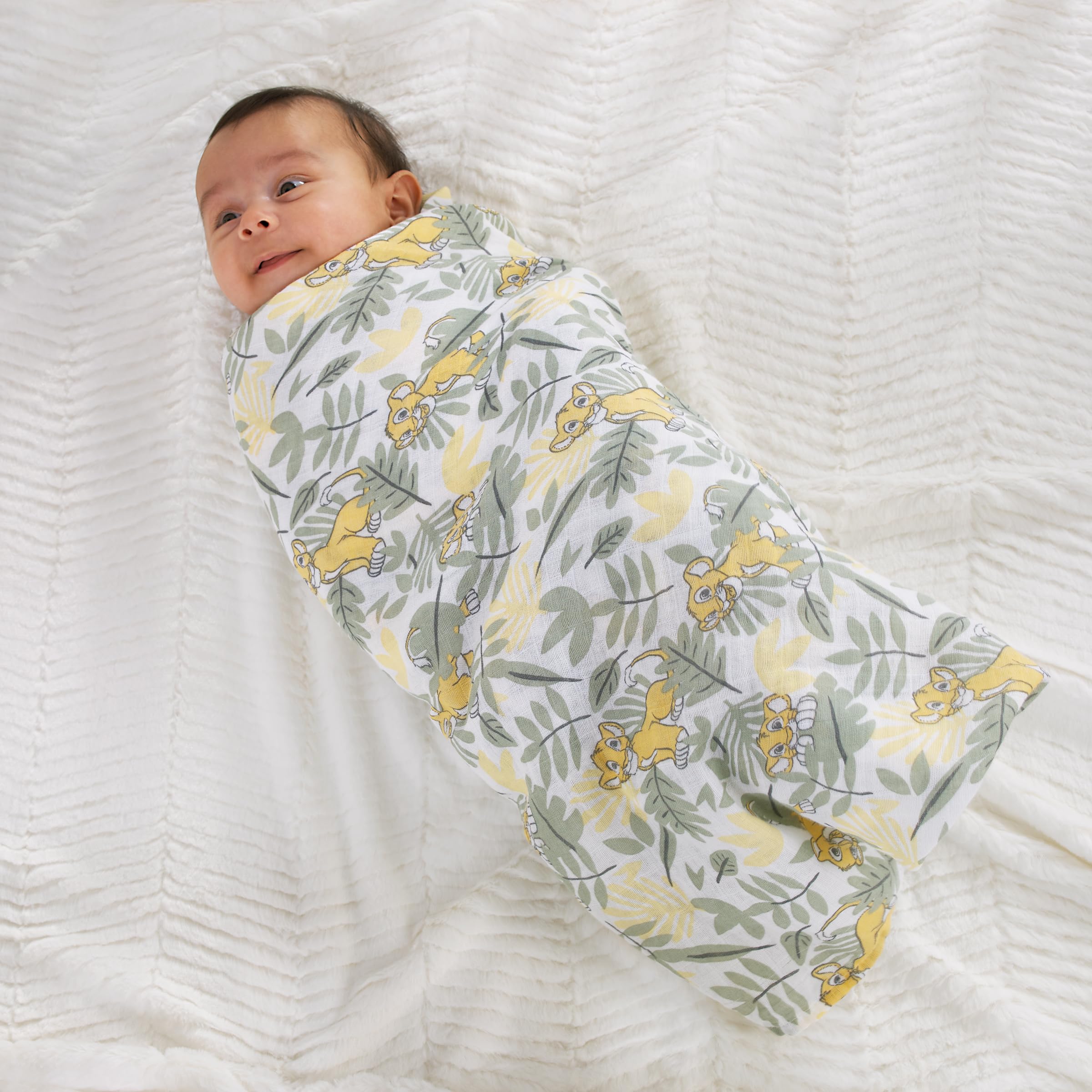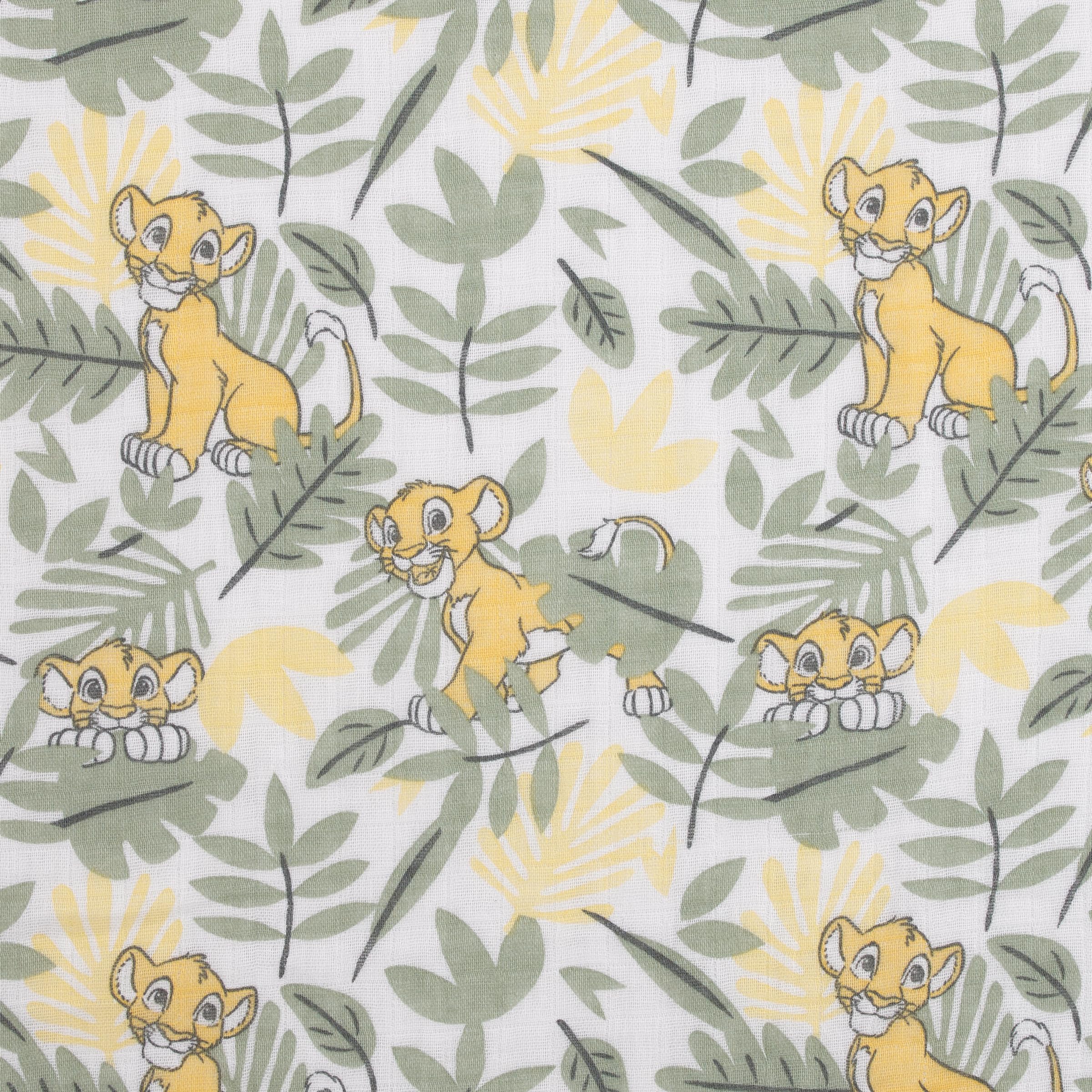 Wrap your little one in love, with the super soft Disney Lion King 3 Piece Muslin Swaddle Set! This adorable set of swaddle baby blankets measures 44" x 44" each. Features 3 prints of Simba in fun poses, one is a jungle pattern with smiling Simba peeking from behind palm leaves, another with Simba on a sage background, and one in a playful allover cheetah pattern. Designed in shades of sage, yellow, brown, and white. This blanket is made of 100% cotton muslin and is the perfect size for swaddling. Makes a wonderful gift for your little bundle of joy!
