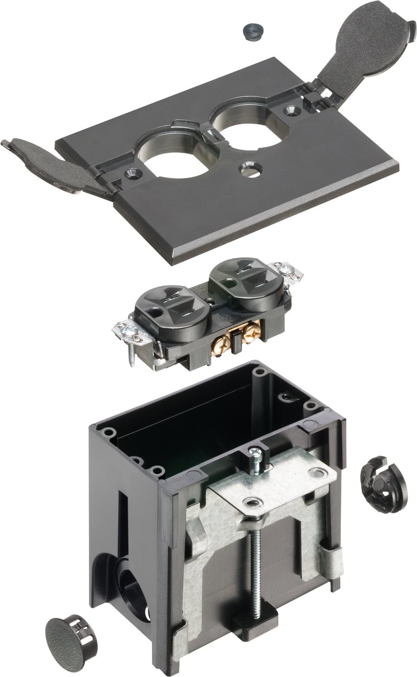 Arlington FLBAF101BL-1 Adjustable Floor Box Kit with Outlet and Flip Plate, for Installed Floors, 1-Gang, Black, 1-Pack. 1-Gang Black Adjustable Floor Box Kit with Outlet and Flip Plate for Installed Floors. Cover gasket prevents water intrusion, plate protects outlet when not being used. We have a floor box for any jobsite; this is designed for installed floors, we also make them for new concrete. Oversized covers hide miscut carpet for floor. For a neat, convenient way to put a receptacle(outlet) in the floor. Includes Adjustable Floor Box, duplex receptacle, back plate, gasketed rectangular cover plate with flip lids, (5) #6-32 cover plate screws, (2) #6 drywall screws, (1) each NM94 cable connector and NM900 plug and (1) cap for adjustable screw hole in cover plate..
