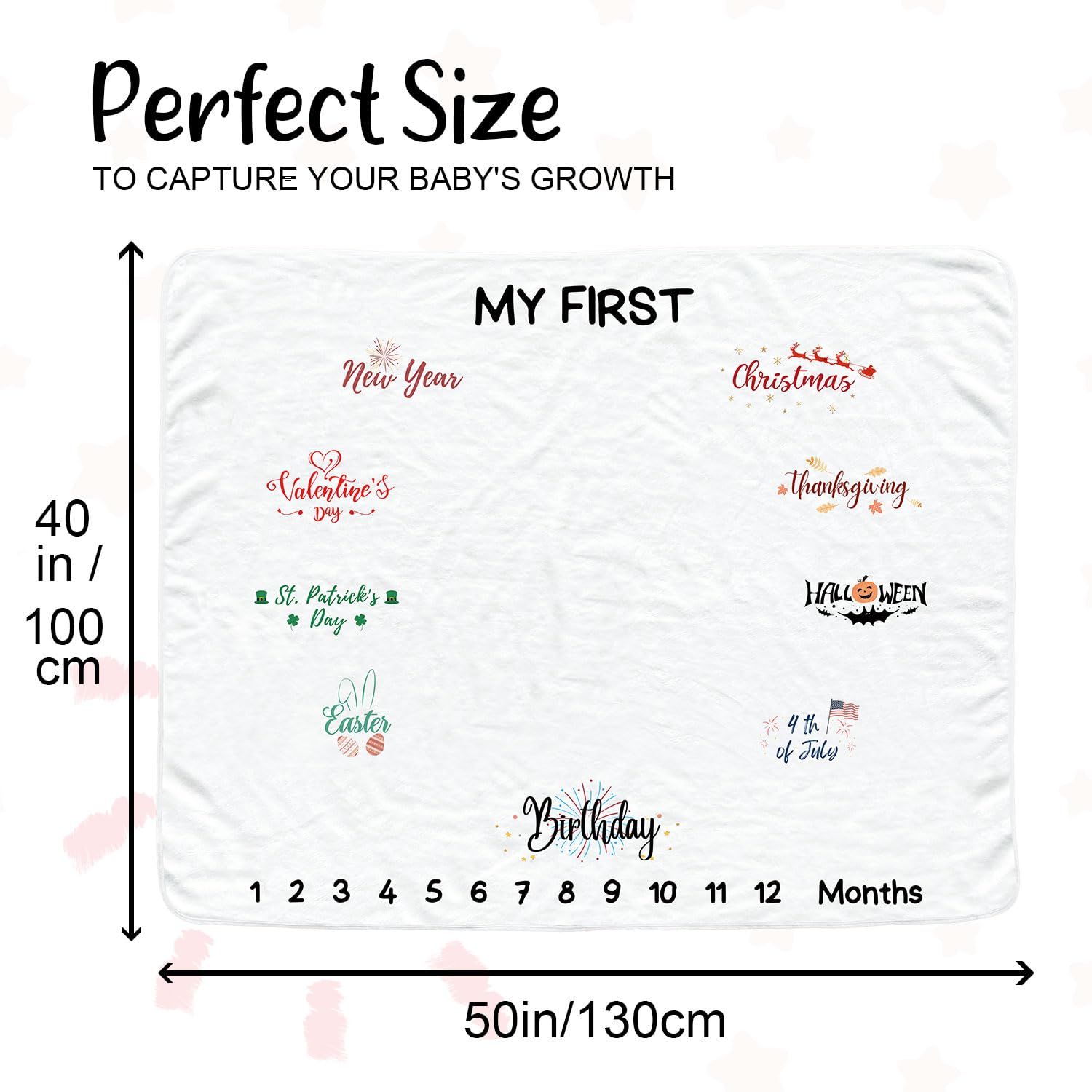 Generous Size for Monthly Memories: Measuring a spacious 40*50 inches, our monthly baby blanket provides ample room for both your adorable little one and their monthly moment.