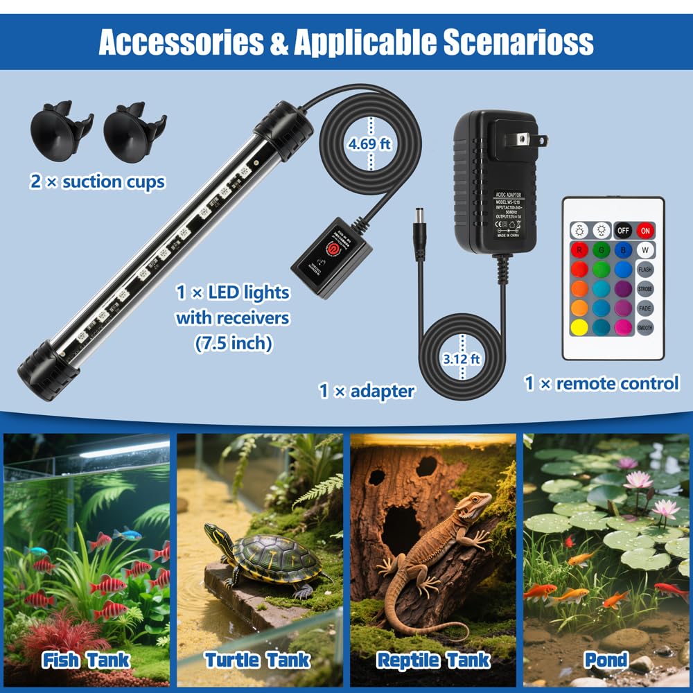 【Accessories & Applicable Scenarios & 1-Year Warranty】: Still worried about not having the right lighting for your fish tank, turtle tank, reptile tank, or pond? With Novique, simply connect the various components to create a vibrant lighting system. This system includes 1 x LED lights with receivers, 2 x suction cups, 1 x adapter,1 x remote control. We also offer a 12-month warranty, giving you peace of mind when choosing Novique.