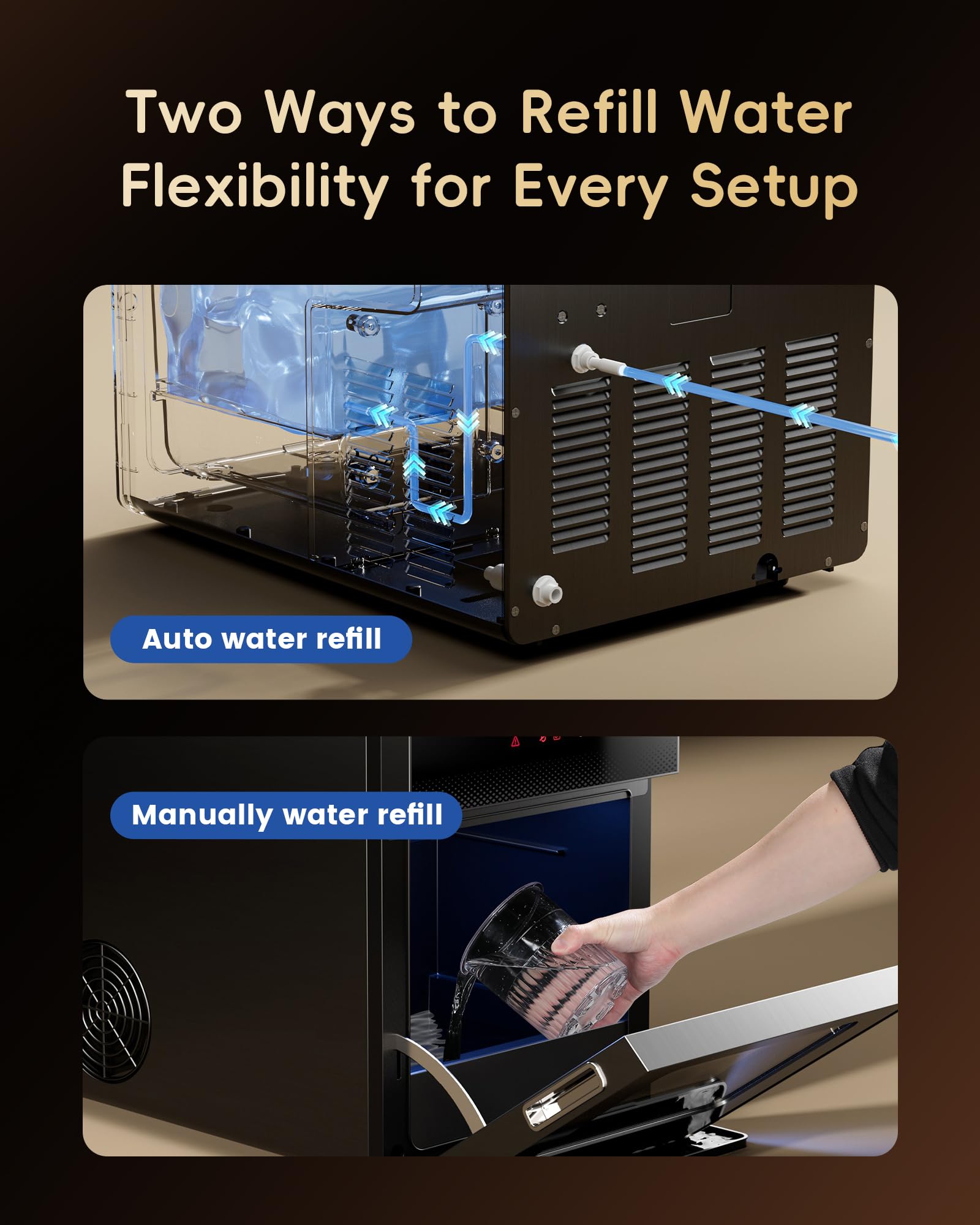 Easy Water Entry: Connect to a water line for endless ice without interruptions, saving time and effort. Or use the 0.45-gallon built-in tank for flexibility. Plus, the bottom drain design allows easy water removal when placed on a countertop