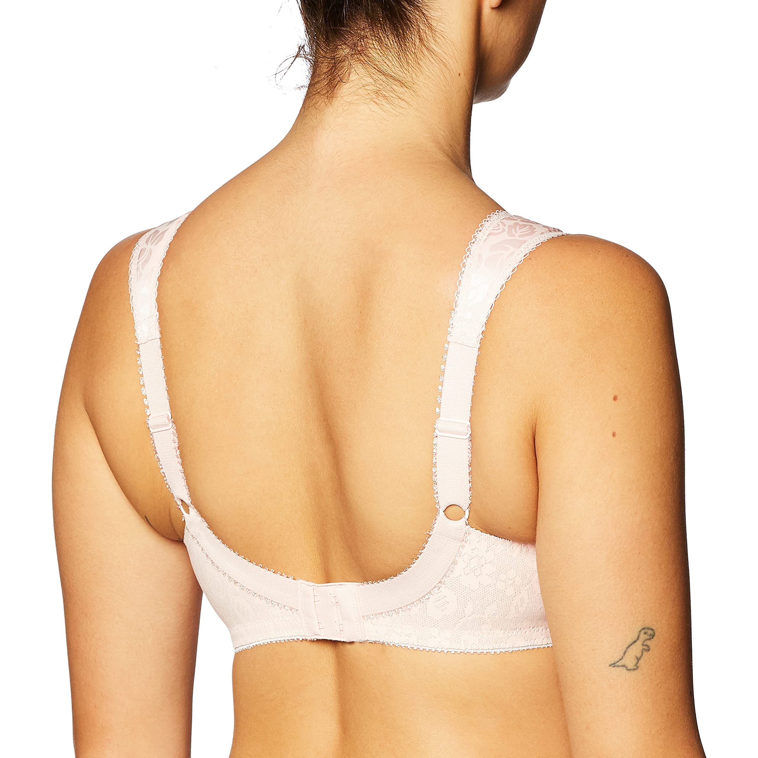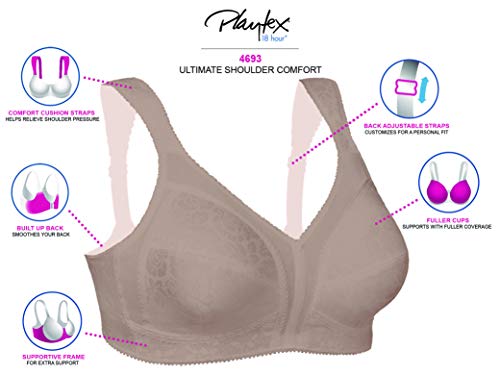 Description Here's a wireless bra for fuller figures that provides the support you need and the comfort you deserve. This wireless bra from Playtex® is part of the famous 18 Hour® collection, a go-to favorite for so many customers who value wirefree comfort but need superb support. With a convenient, easy-to-hook front close, getting dressed in the morning is effortless and faster with this wireless bra in your drawer. Brilliantly and thoughtfully designed, this everyday bra is made with the Playtex® 4-way TruSUPPORT® system that provides higher sides for bulge control, fuller, softly seamed cups for natural shaping, wider straps for all-day ease, and a smoother back for enhanced stability. In addition, this wireless bra has the Playtex Flex Back - two wide crisscross stretch bands that stretch and support for ease of movement. The straps play an important role in the comfort of this full-coverage bra, with their wider, cushioned design that helps relieve shoulder pressure for no-dig comfort. Plus, this wireless bra is fashioned around the famous Playtex M-frame that comfortably conforms to your shape. You'll also appreciate the front and side mesh insets for airy cooling. And this full-figure bra is Tagless® for itch-free comfort. Step up to the superior fit and dreamy comfort of this 18 Hour bra from Playtex in a pretty, satiny floral jacquard fabric.
