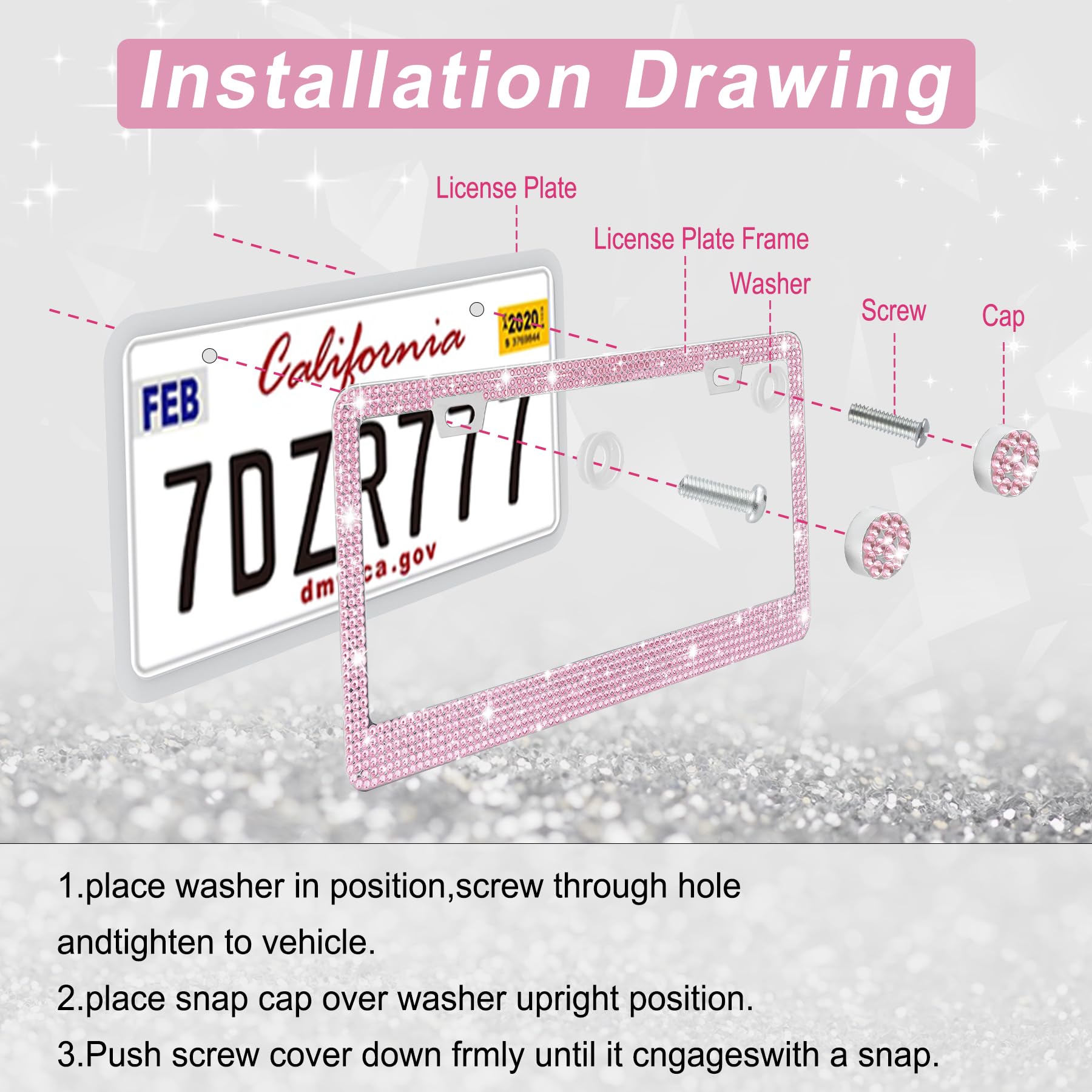 PREMIUM QUALITY: It is difficult to slip off after prolonged usage due to the stainless steel material, polygon-cut crystal rhinestones, wear-resistant, waterproof, and completely covered with exquisite handcrafted crystal. In addition, the expertly polished license plate frame won't harm your hands or your automobile.