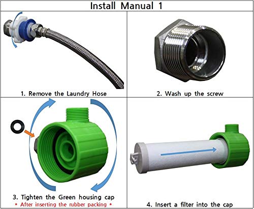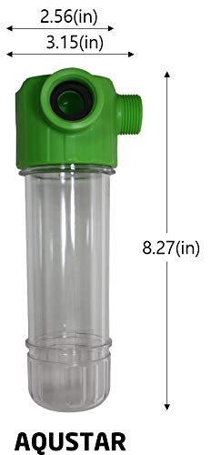 PURIFIES YOUR WATER AQUSTAR Laundry Filter Housing System guaranteed to purify your water at any temperature. It removes harmful impurities, heavy metals and dust. This is perfect for your clothes and underwear. And It not only save your clothes and underwear but also save your laundry machine. WATCHING FILTER CONDITION This Housing body is transparency. So you can check out filter condition everyday. So filter colour too dark or too red that mean is filter changing time. EASY TO INSTALL AND REPLACE FILTER. (No tools required) AQUSTAR Laundry Filter Housing System has 3/4" PT thread that easily and securely connects to your laundry machine. (If it isn't fit your machine because 3/4" NPT. Use a teflon tape.) For changing filter. You don't need to disassemble whole system. Just open housing body enough for replacing filter. PACKAGE Laundry Filter Housing : 1ea Sediment filter : 1ea
