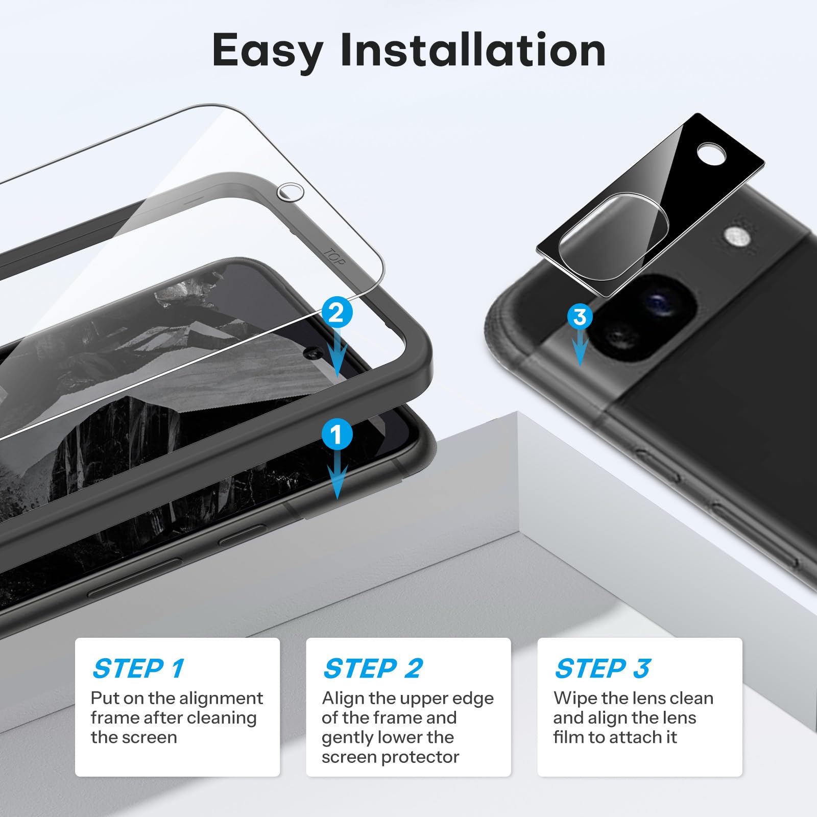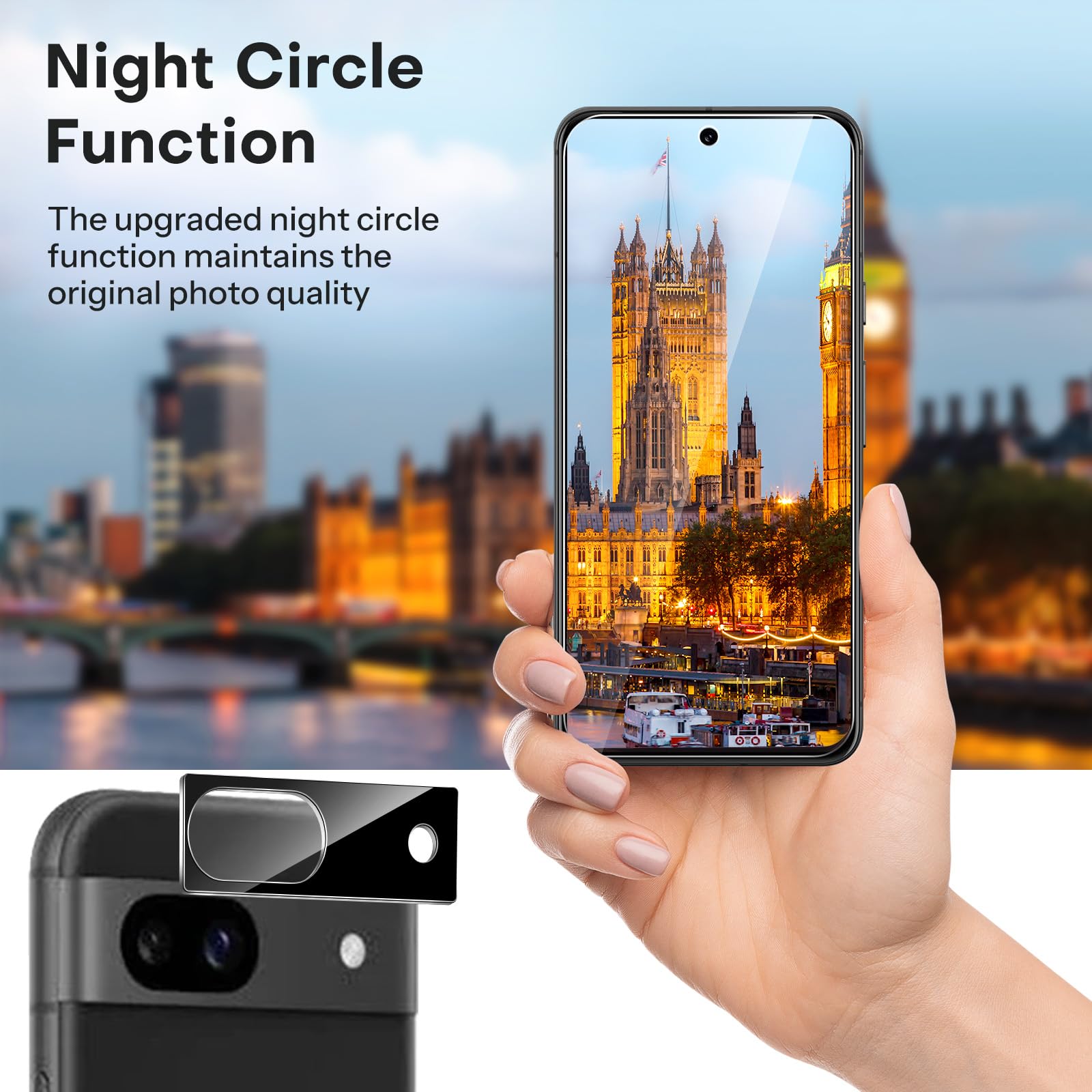 Double Protection: 9H hardness tempered glass screen protector protects the Google Pixel 8a from scratches and abrasions. Special-designed camera lens protector keeps the phone camera free from smudge and fingerprints