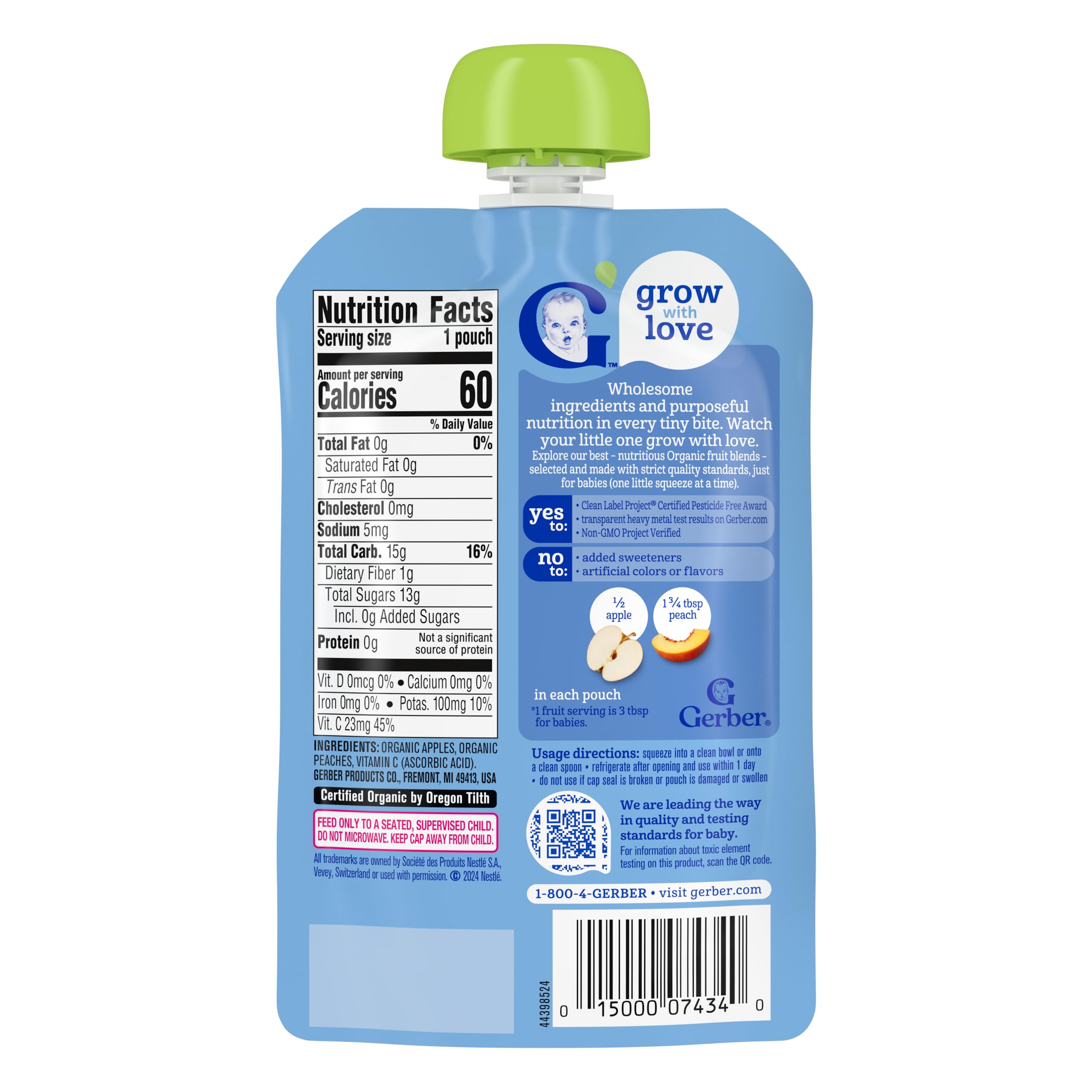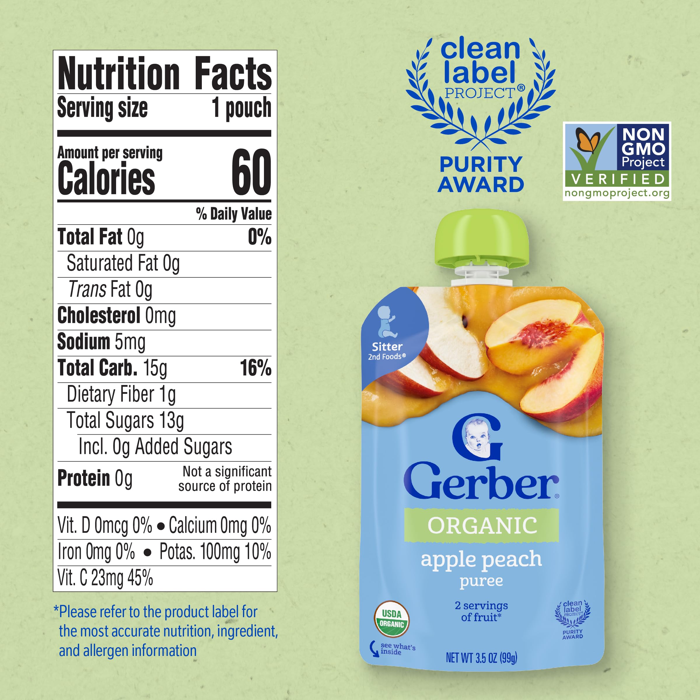 PUREED FRUIT: With your child in mind, our Gerber baby food offers a delightful organic blend of half an apple and 1 ¾ tablespoons of peach in each pouch