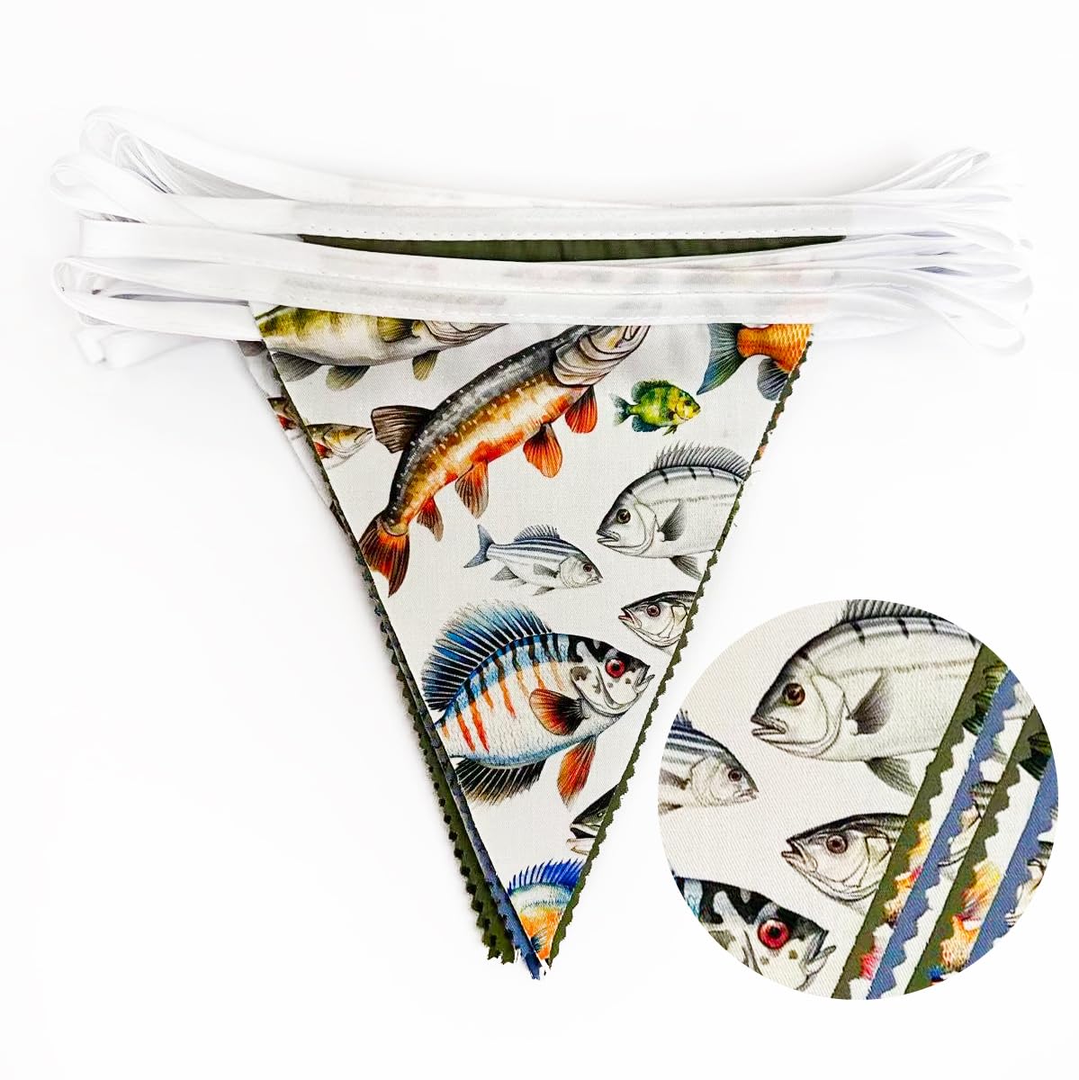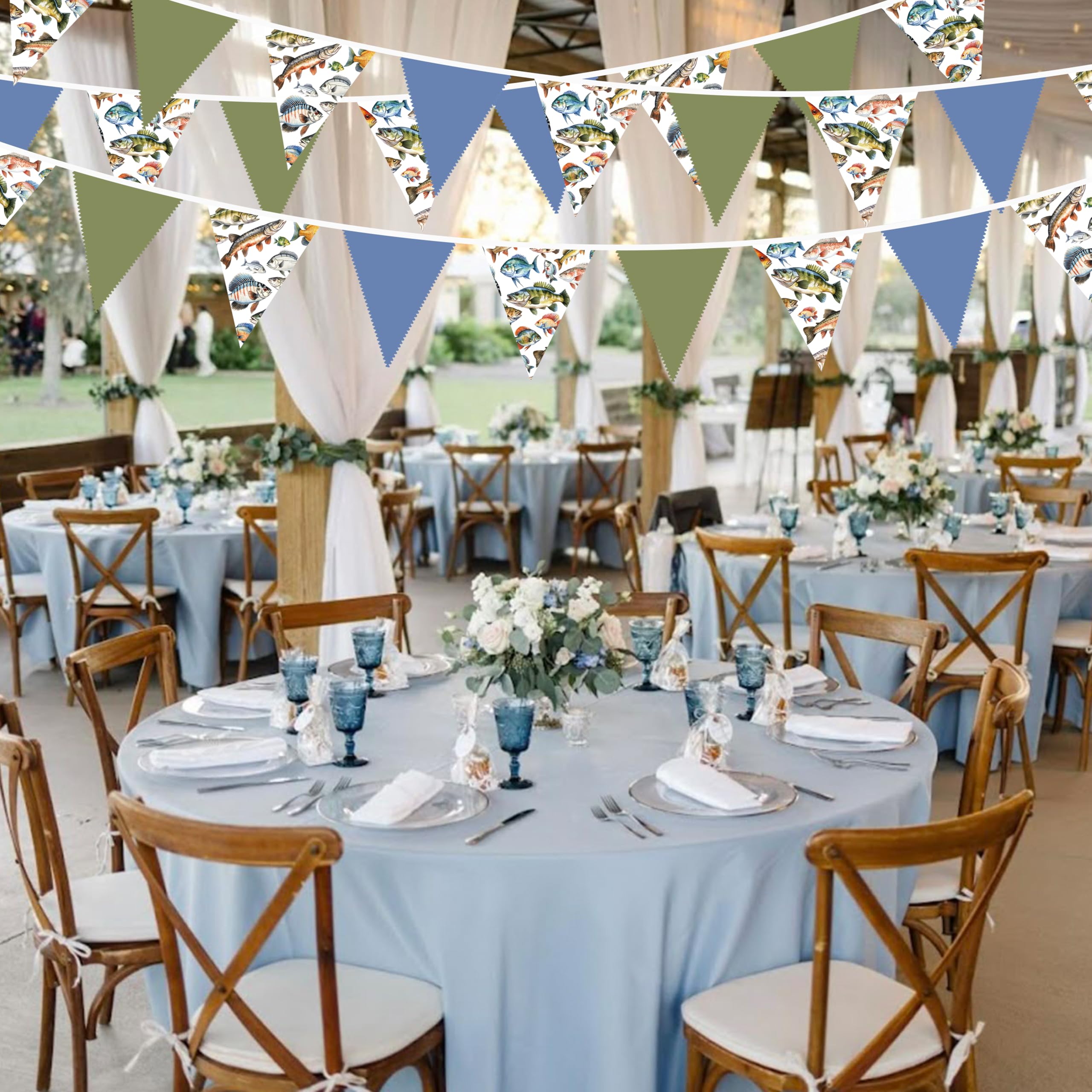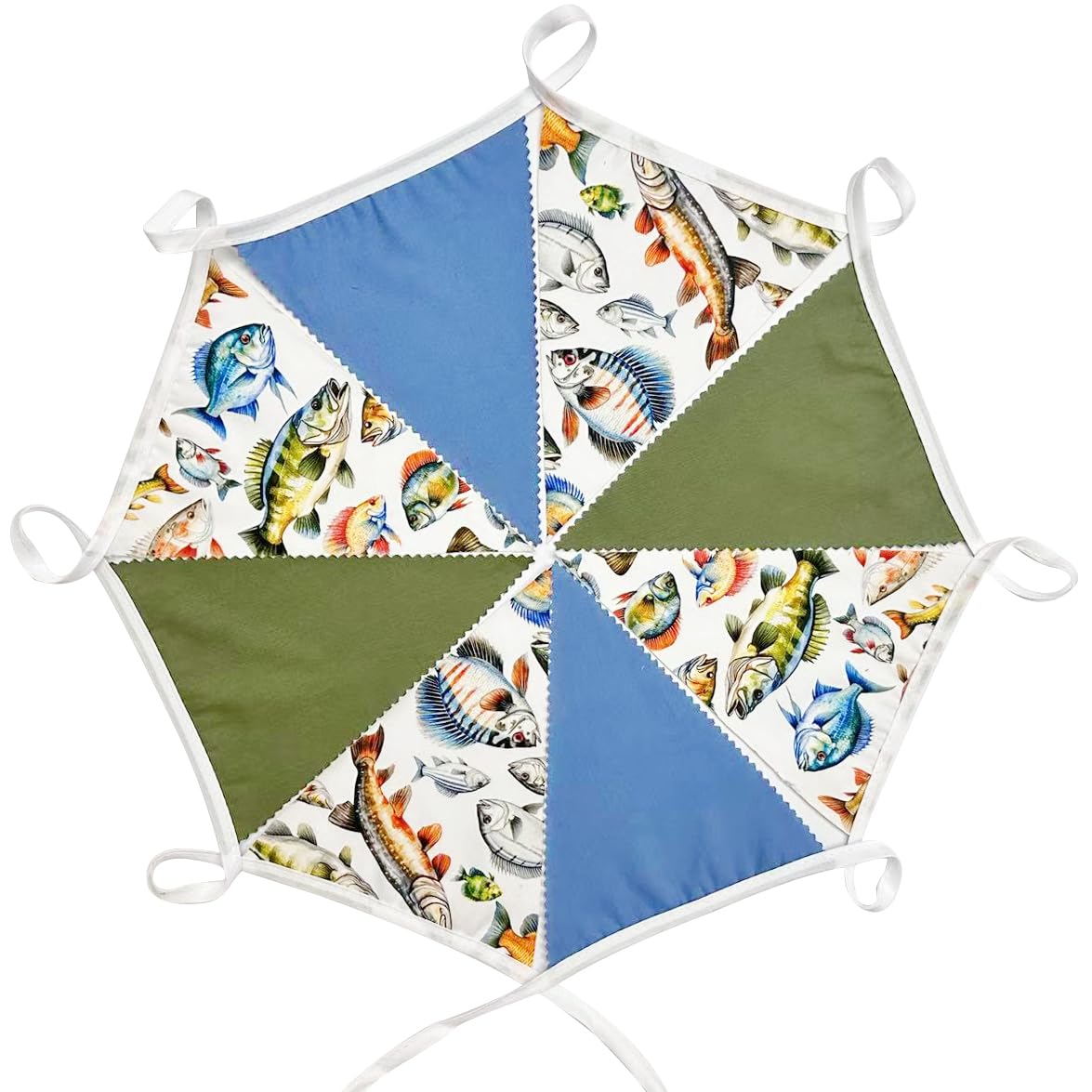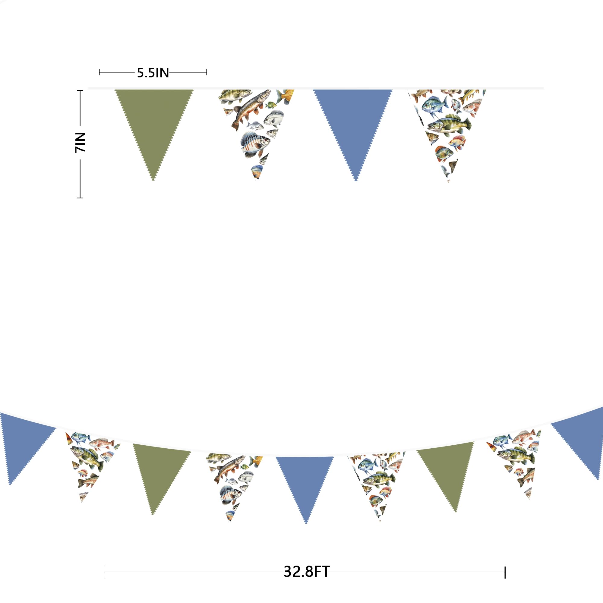 Package Including:1 pack blue green fishing theme fabric bunting banner garland in dusty blue, sage green and fish print colors, with 36pcs flags in 10M/32.8Feet. Flag Size: 5.5in width x 7in height.
