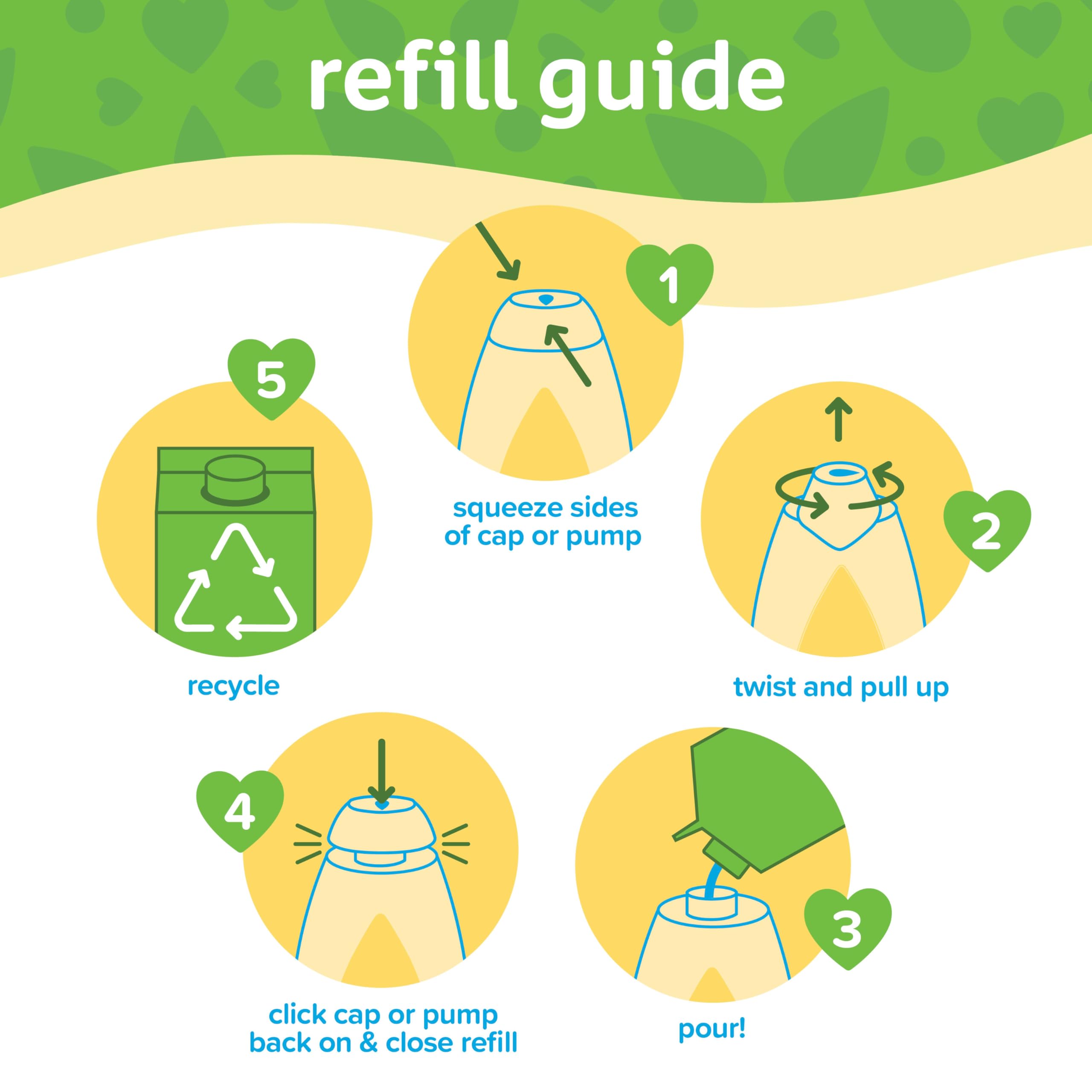 To refill your Johnson's Head-to-Toe bottles, squeeze the sides of the cap or pump, twist & pull up to remove. Pour the baby wash & shampoo into the empty bottle & click cap or pump back on & close the refill. Recycle the refill carton when empty