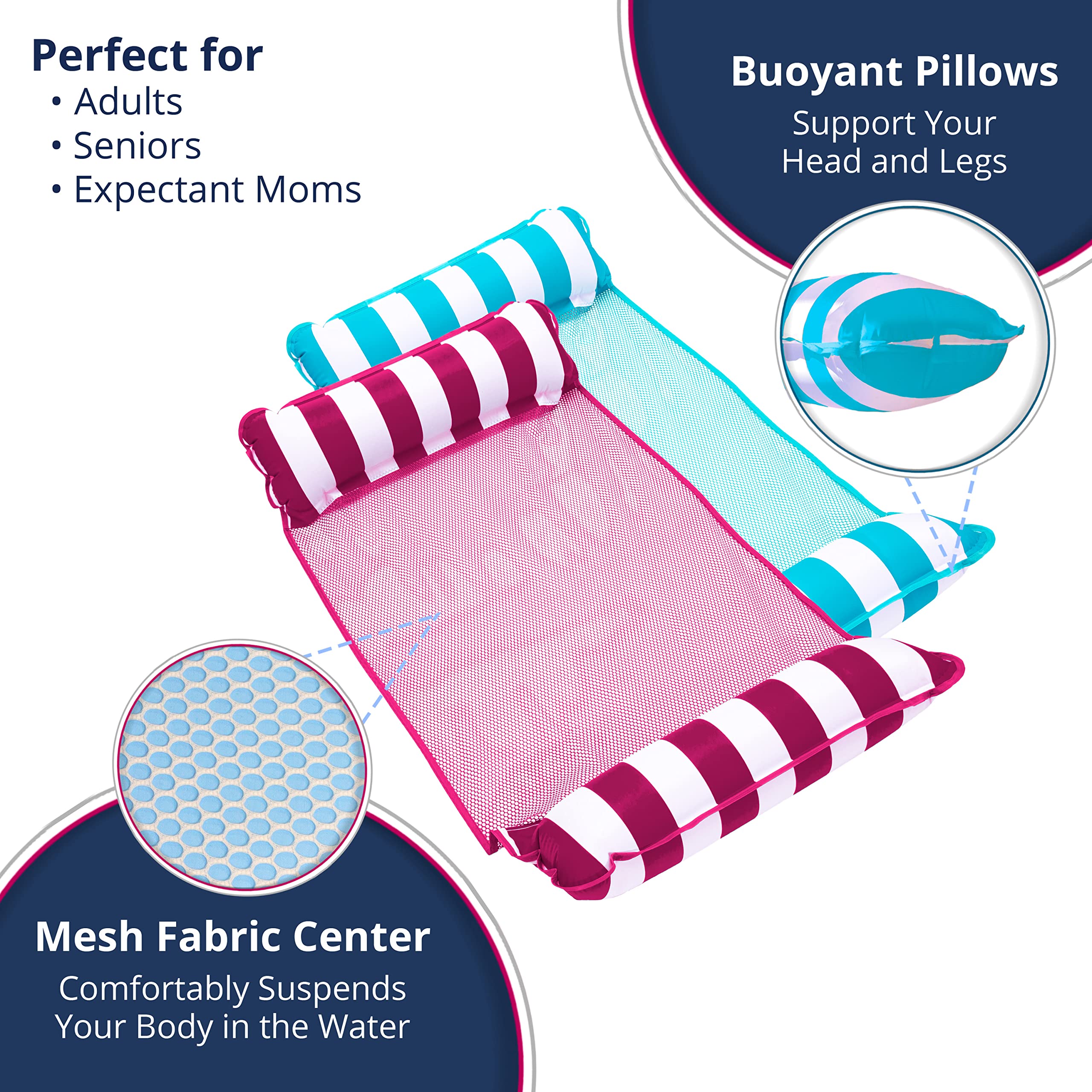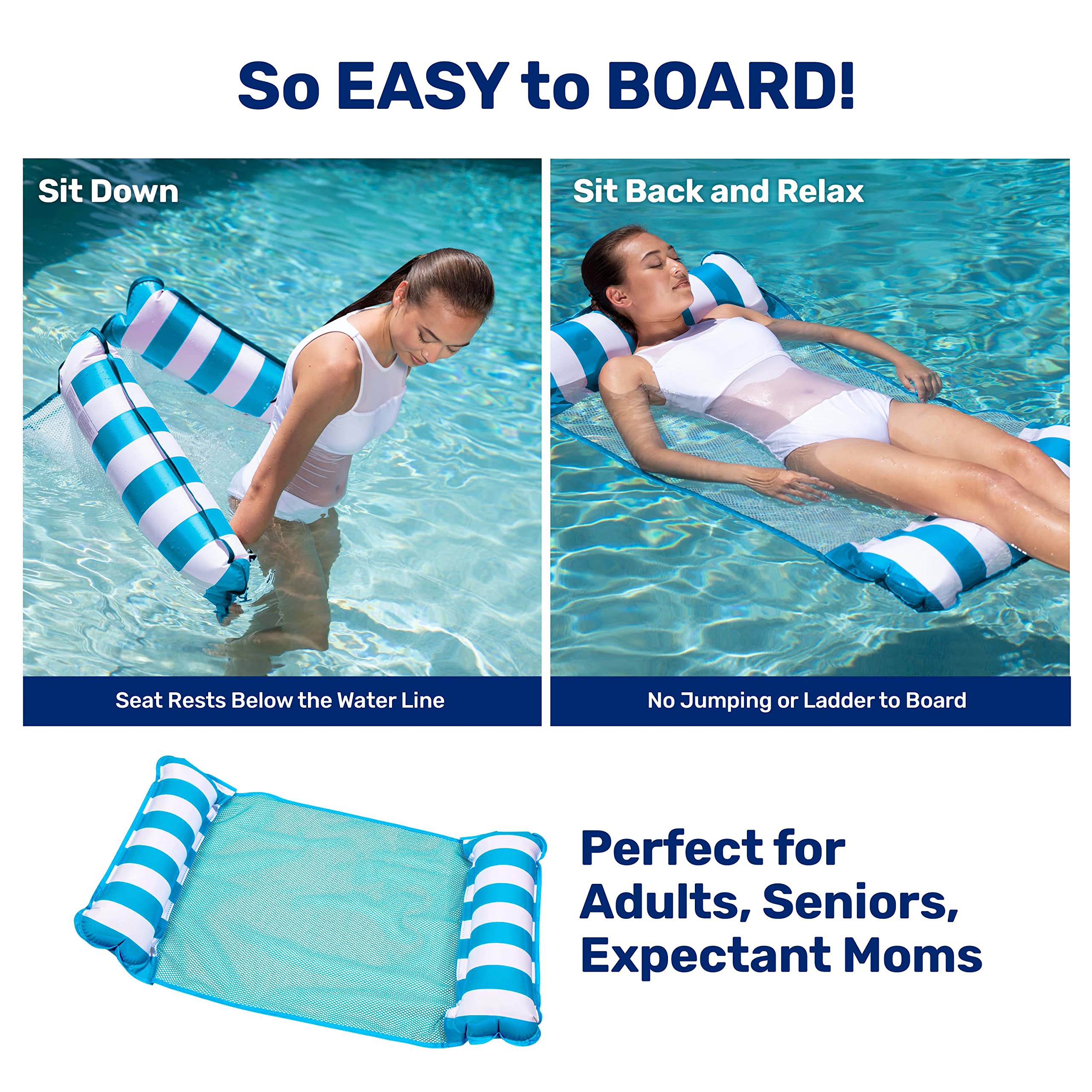 3-Pack #1 Selling Pool Hammocks: Easy on-off pool floatie: Seat rests in water - no jumping, ladders, or flopping needed; best for people 4 – 6 feet tall; great for seniors and expectant mothers