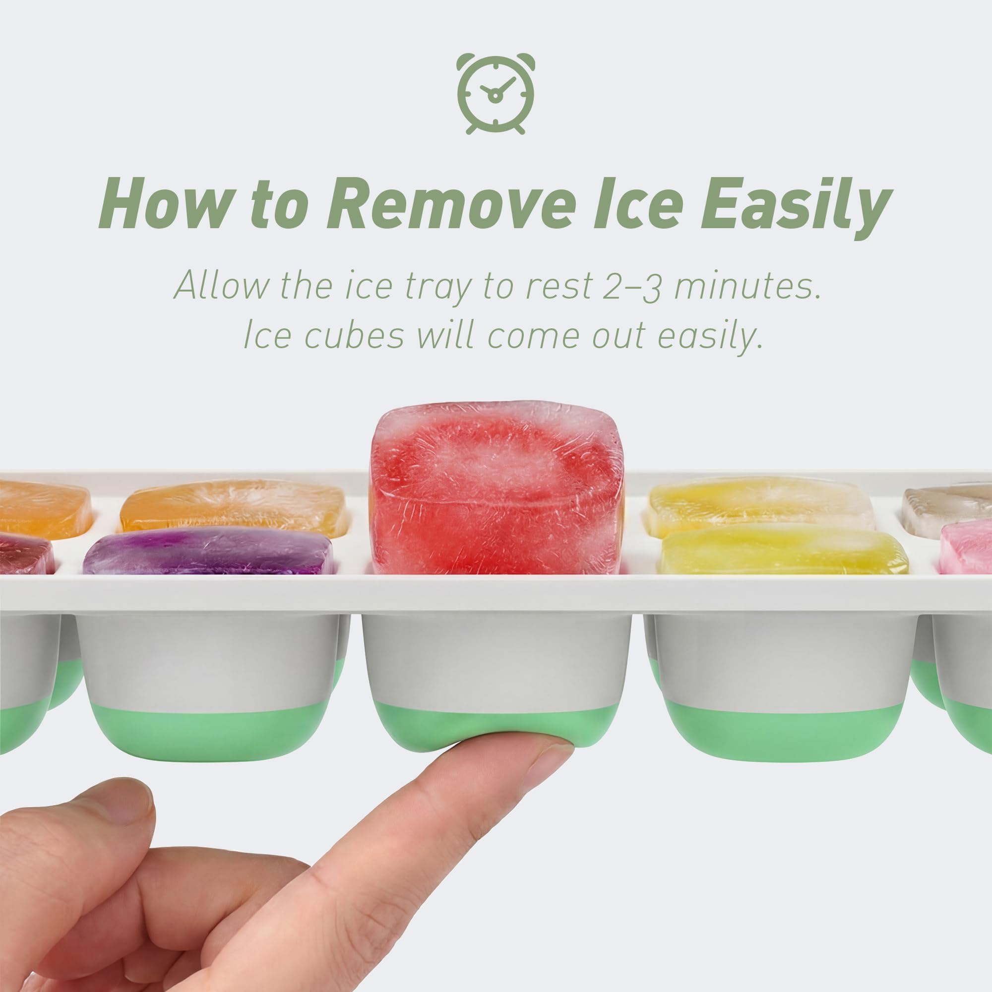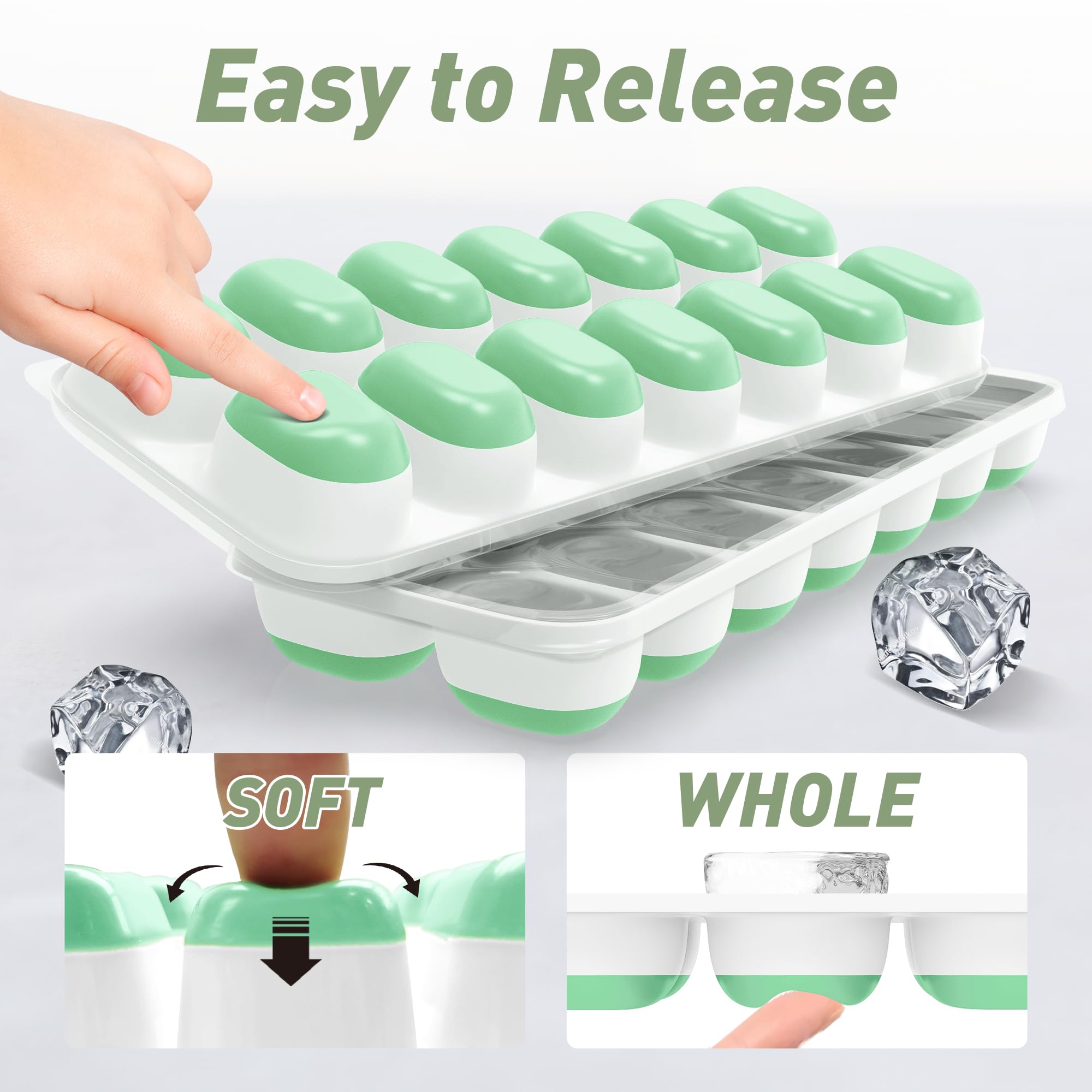 Sturdy and Durable: Made of silicone and PP material, our ice cube trays for freezer are sturdy enough to withstand long-term low-temperature storage without breaking. No longer worry about breaking easily. Besides, our silicone bottom is soft enough to release the ice easily, so twisting is no longer needed, which makes the ice trays even more durable