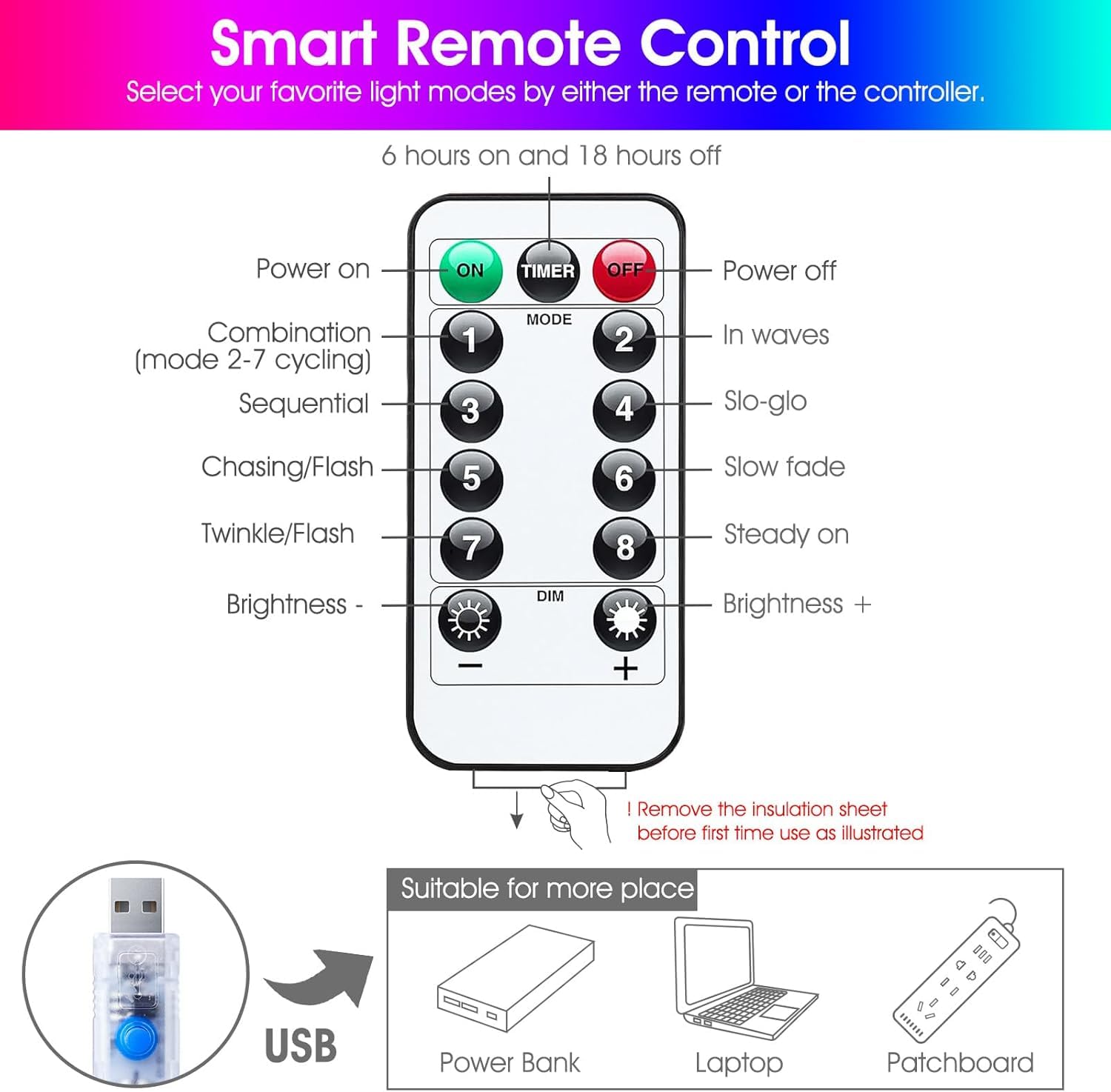 ✨8 Modes & Memory Function - The string lights have 8 lighting modes: Combination, in waves, sequential, slogs, chasing, slow fade, twinkle, steady on. With a memory function, the mode that is turned on again after being turned off is that before turning off.