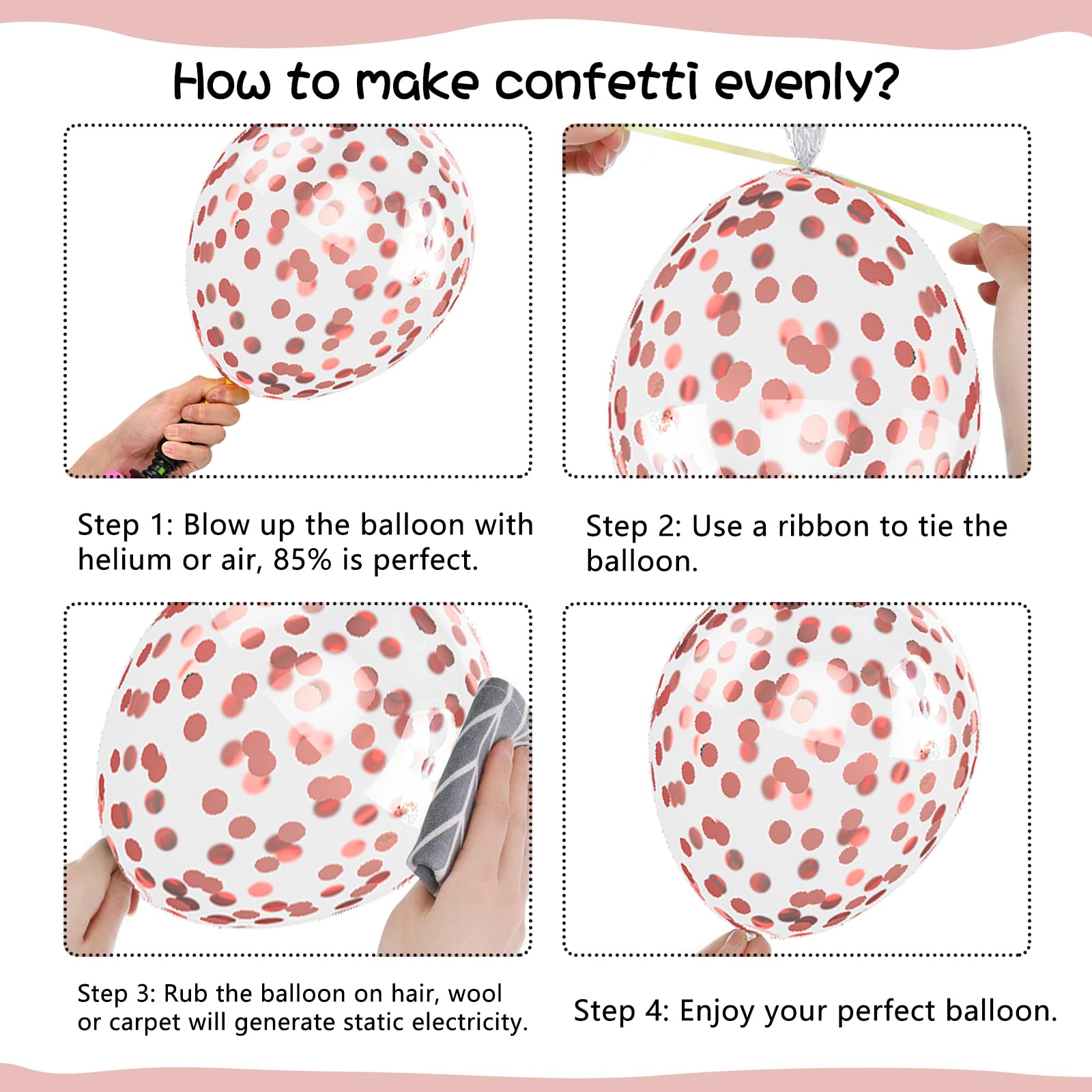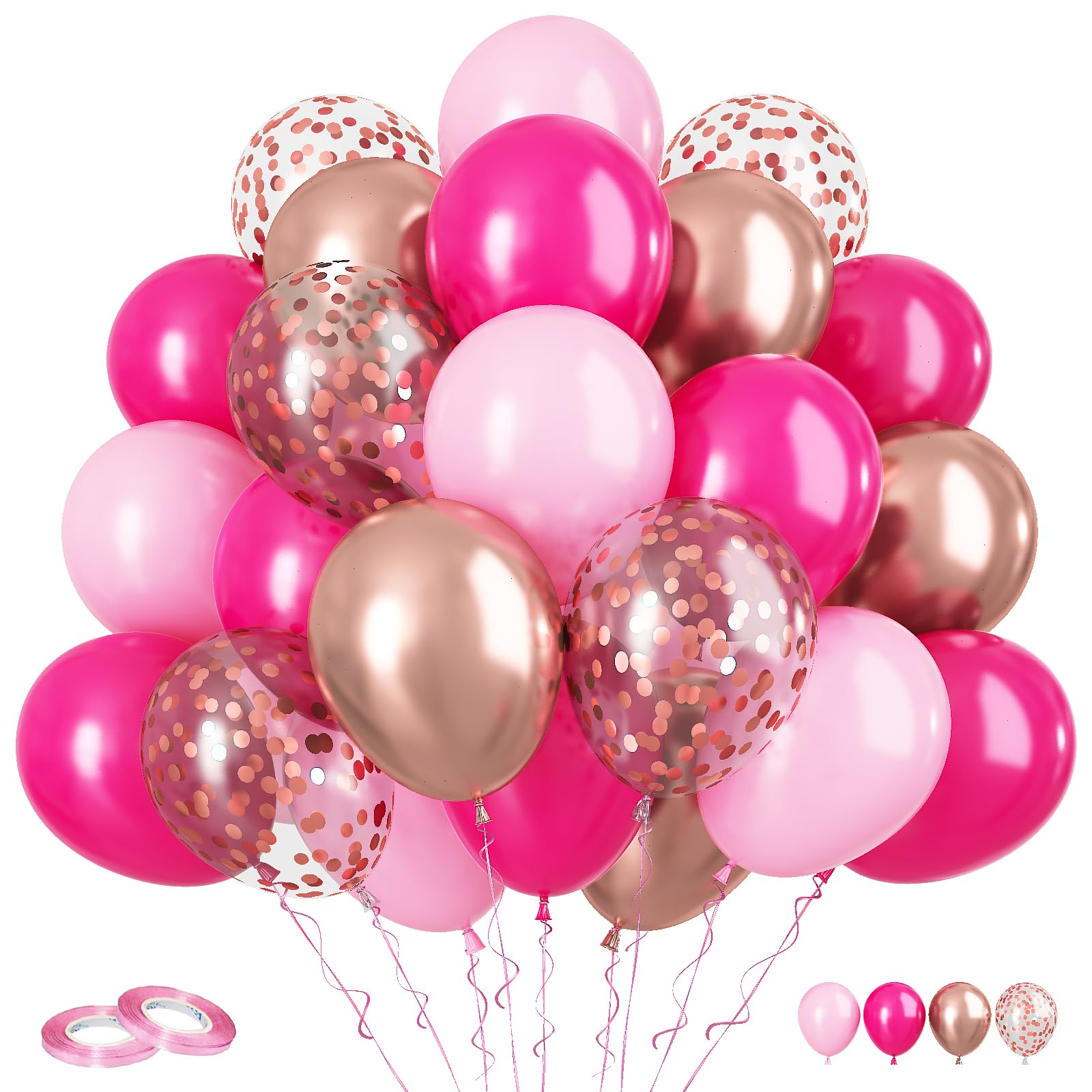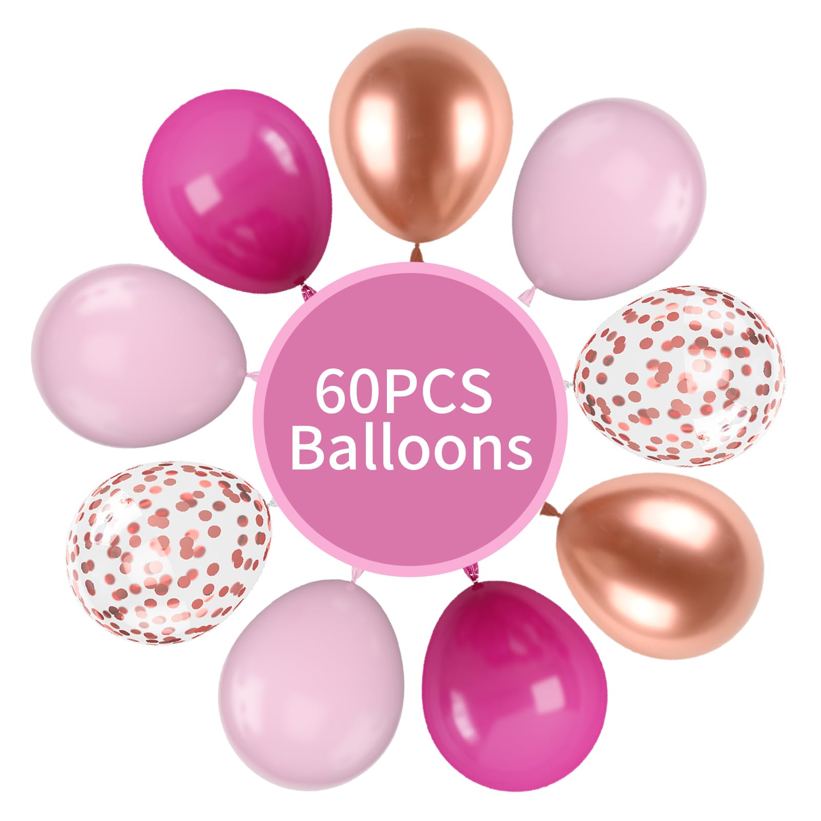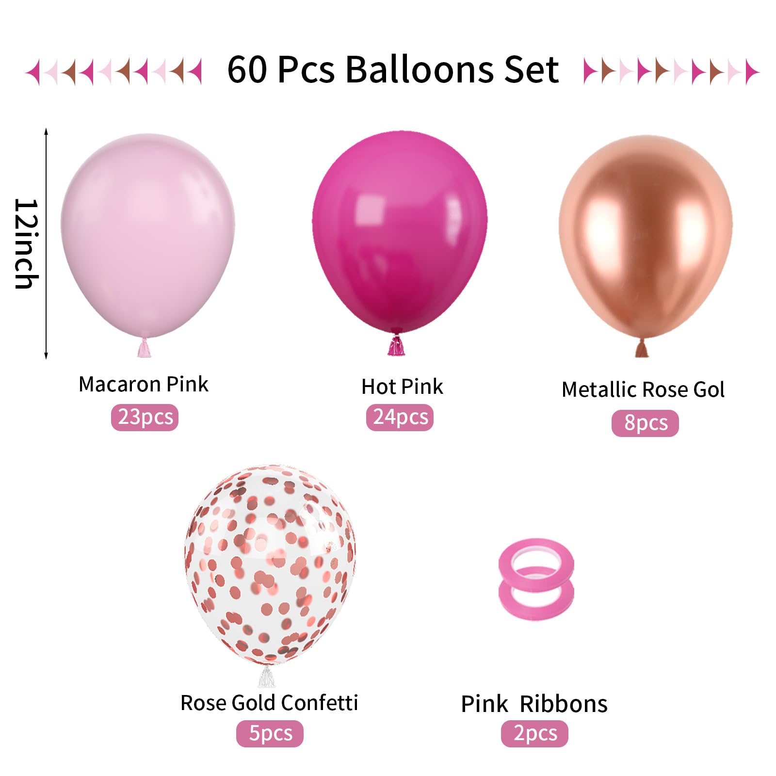 Package Included : Our hot pink and rose gold birthday balloons set includes 60 pcs 12 inch latex balloons. 24 pcs hot pink balloons, 23 pcs macaron pink balloons, 8 pcs metallic rose gold balloons, 5 pcs rose gold confetti balloons and 2 pcs pink ribbons