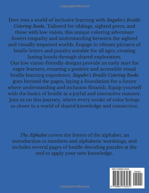 The first paperback book in this series, “The Alphabet” includes open dot images of all 26 letters, the capital indicator, the comma, the period, an introduction to numbers, and the 23 alphabetic wordsigns. Adding your own touch to the playful images gives time to enhance long term learning. Alphabetic wordsigns are the first family of contractions, a form of shorthand used in braille. Instructional pages are interspersed throughout, and contractions are repeated on letter pages. Color the dots of every braille letter in the book to help cement them in memory, and find you’ll be able to easily decode secret braille sentences pictured by the end of the book. Blanks are provided to write each letter of the brailled words above the puzzle pages for errorless learning. Inclusive Learning: Tailored for siblings of blind children, sighted classmates, and those with low vision who may need braille in the future, Baguhn's Braille Coloring Books create a parallel learning experience for sighted children, fostering curiosity and appreciation. This coloring book is flat, does not contain any embossed braille or tactile components.