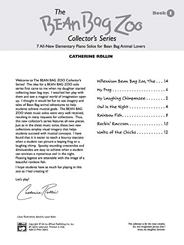Young piano students will easily find an entry point into expressive playing with the animal adventures featured in The Bean Bag Zoo Collector's Series Book 1. Inspired by the imaginative world of beanbag toys, this elementary level volume helps students master musical concepts such as learning to play bouncy staccatos by picturing a leaping frog or a laughing chimp, or attaining floating legatos with the image of a beautiful rainbow fish. A Federation Festivals 2024-2028 selection.