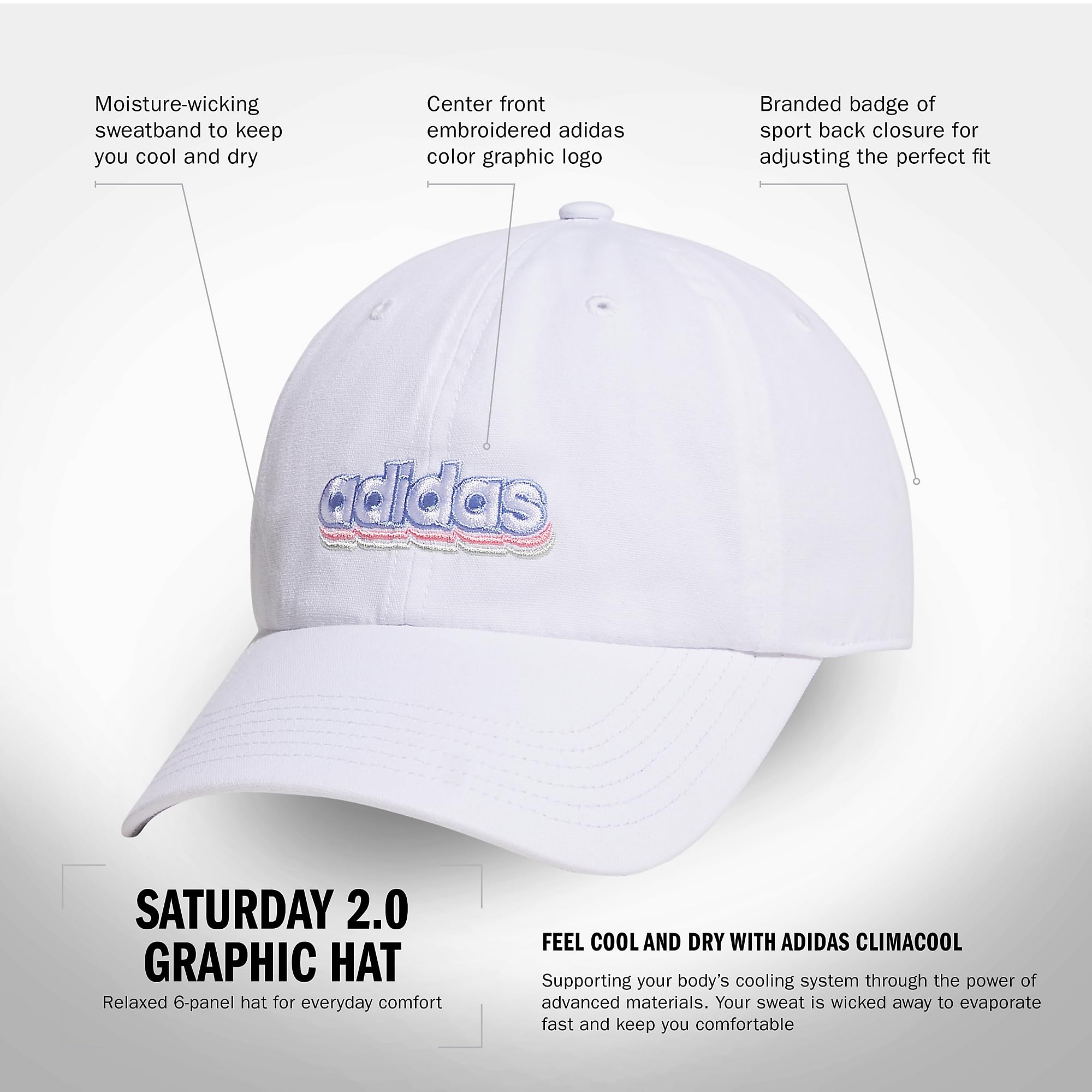 Description Put the finishing touch on your look in this sporty yet versatile hat for women. Made with sweat-wicking, quick-drying material and adidas Climacool, it keeps your head feeling cool and dry when you're on the go. It has a relaxed six-panel crown and an adjustable strap for locking in the perfect fit.
