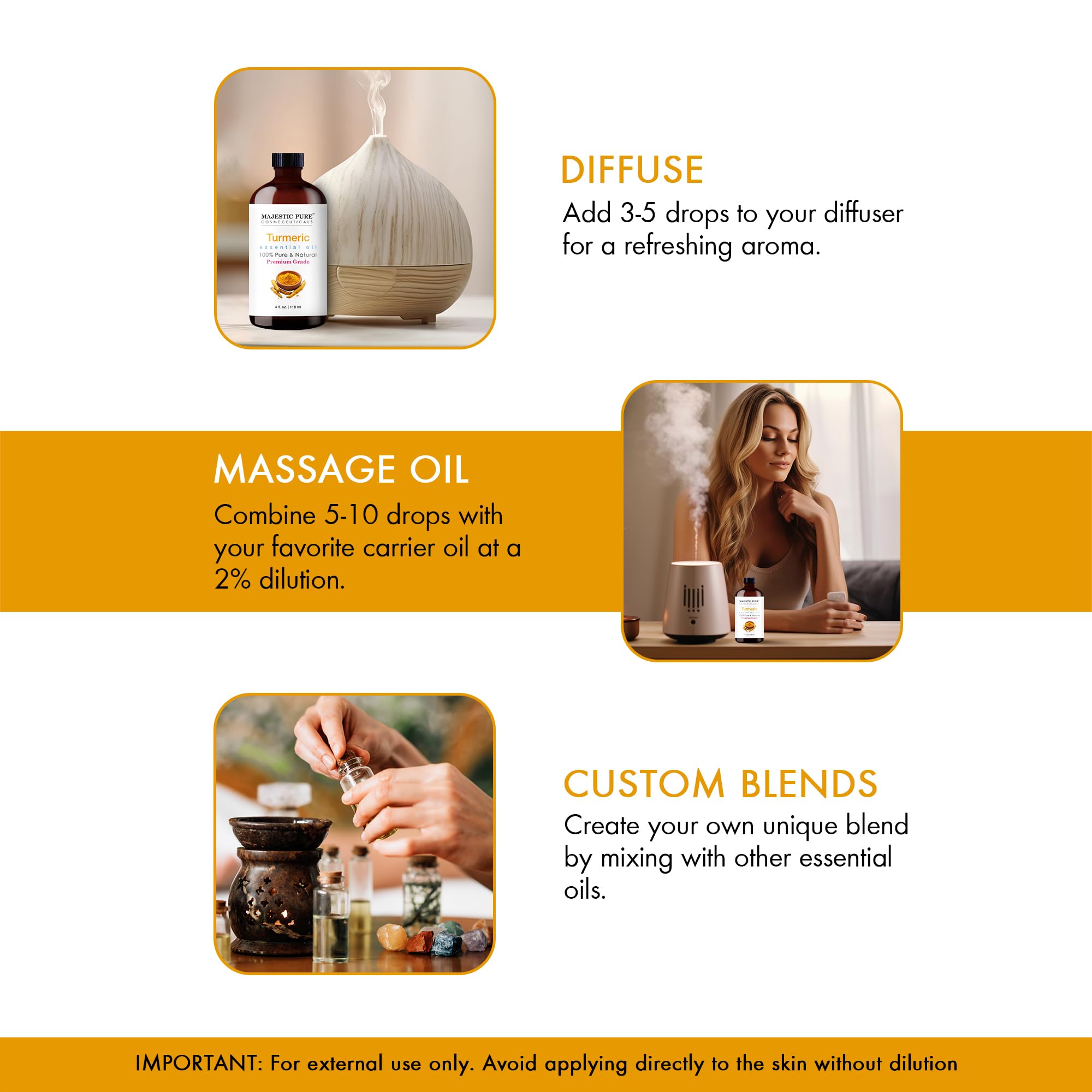 Skin Care & Brightening – Widely used as turmeric oil for skin and turmeric face oil to help improve natural glow, making it a must-have in your essential oils for skin routine.