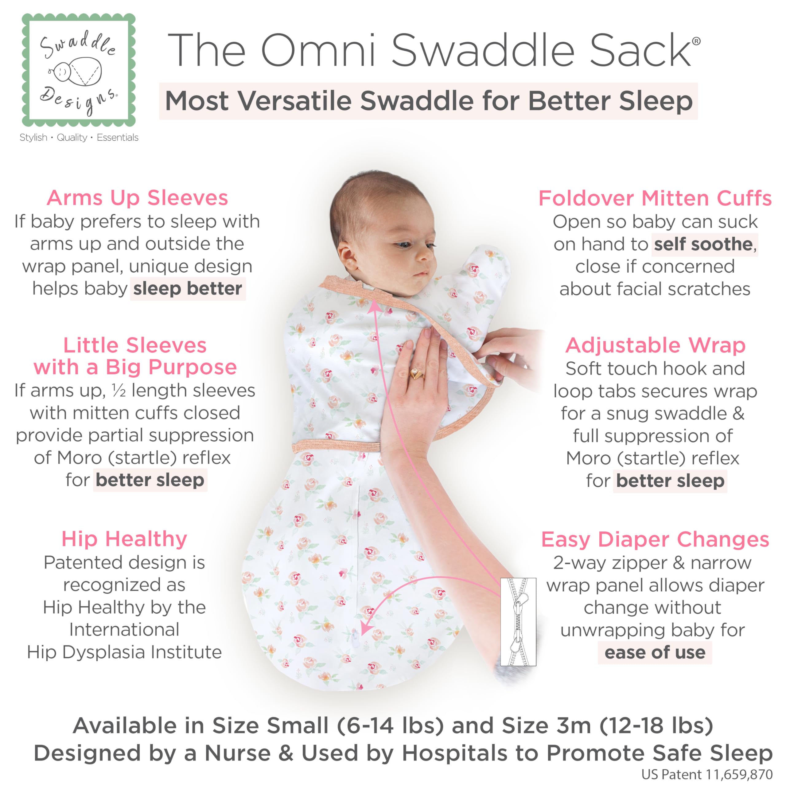 Description The 6-way Omni Swaddle Sack with Adjustable Wrap and uniquely shaped 1/2 length sleeves with mitten cuffs is the ideal swaddle designed by a nurse. The ergonomic and convertible design supports more natural hand and arm positions, and provides parents with more options when preparing baby for safe sleep. The design allows parents to swaddle with (1) arms on chest under the wrap (2) one or both hands up, and (3) both arms up and out from under the wrap. The sleeves with mitten cuffs keep baby's arms warm. Foldover mitten cuffs may be worn open or closed, parents can open the cuffs, so baby can self-soothe by sucking on hands or close the cuffs to protect baby from facial scratches. Many experts recommend parents to swaddle baby with hands within reach of mouth, so baby can self-soothe. Babies who can self-soothe sleep longer and better. When baby is swaddled with hands up or arms up, baby can self-soothe by sucking on hands. The ergonomic, patented design with 2-way zipper is easy to use. The adjustable wrap is narrow and does not interfere with baby's hips and the soft hook-and-loop fasteners make it easy to swaddle baby. The 2-way zipper allows parents to unzip from the foot to check baby's diaper without unwrapping the swaddle. The 2-way zipper makes it easy to place baby in the sack by unzipping from the top. Size Small 6-14 lbs, 0-3m. Size 3m 12-18 lbs for bigger baby. When baby shows signs of attempting to rollover, the AAP recommends that parents stop restraining baby's arms with a swaddle or wrap. Parents can use the Omni as a transition swaddle with arms up and wrap secured around tummy and chest. When baby outgrows the Omni Swaddle Sack, we recommend a SwaddleDesigns Transitional Swaddle Sack® or a zzZipMe Sleeping Sack wearable blanket. Super soft, premium cotton knit is breathable, stretchy, and natural. 100% Cotton. Machine wash. Tumble dry. US Patents 11,659,870 & D924,539. Int’l patents EU, UK, Canada and others online