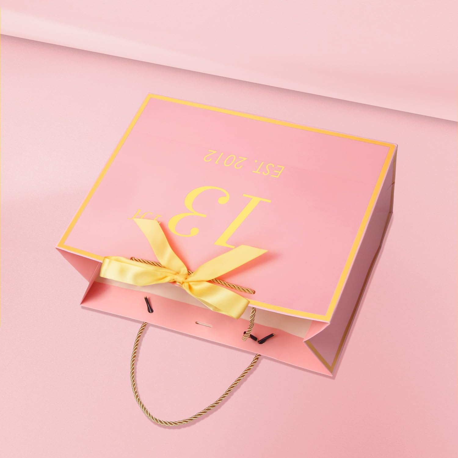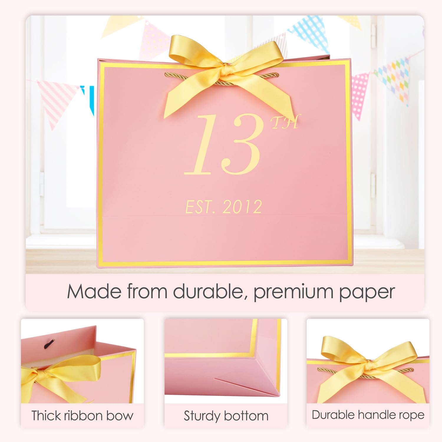 momoake 13th Birthday Gift Bag with Card and Tissue Paper for Girls/Her, 2012 13 Year Old 13" Elegant Pink Gold Anniversary Keepsake Party Present Shopping Paper Bags for 13th Birthday Decorations