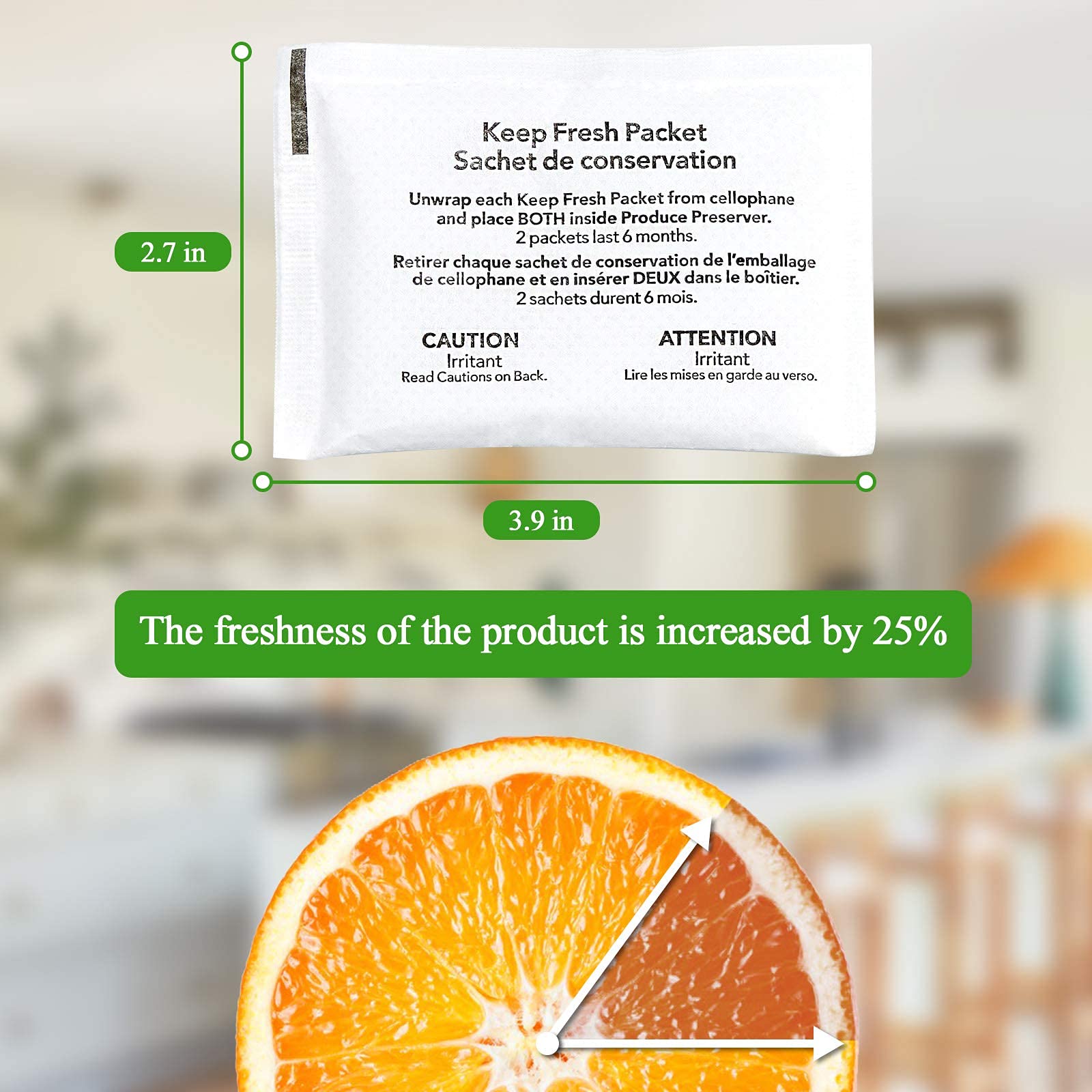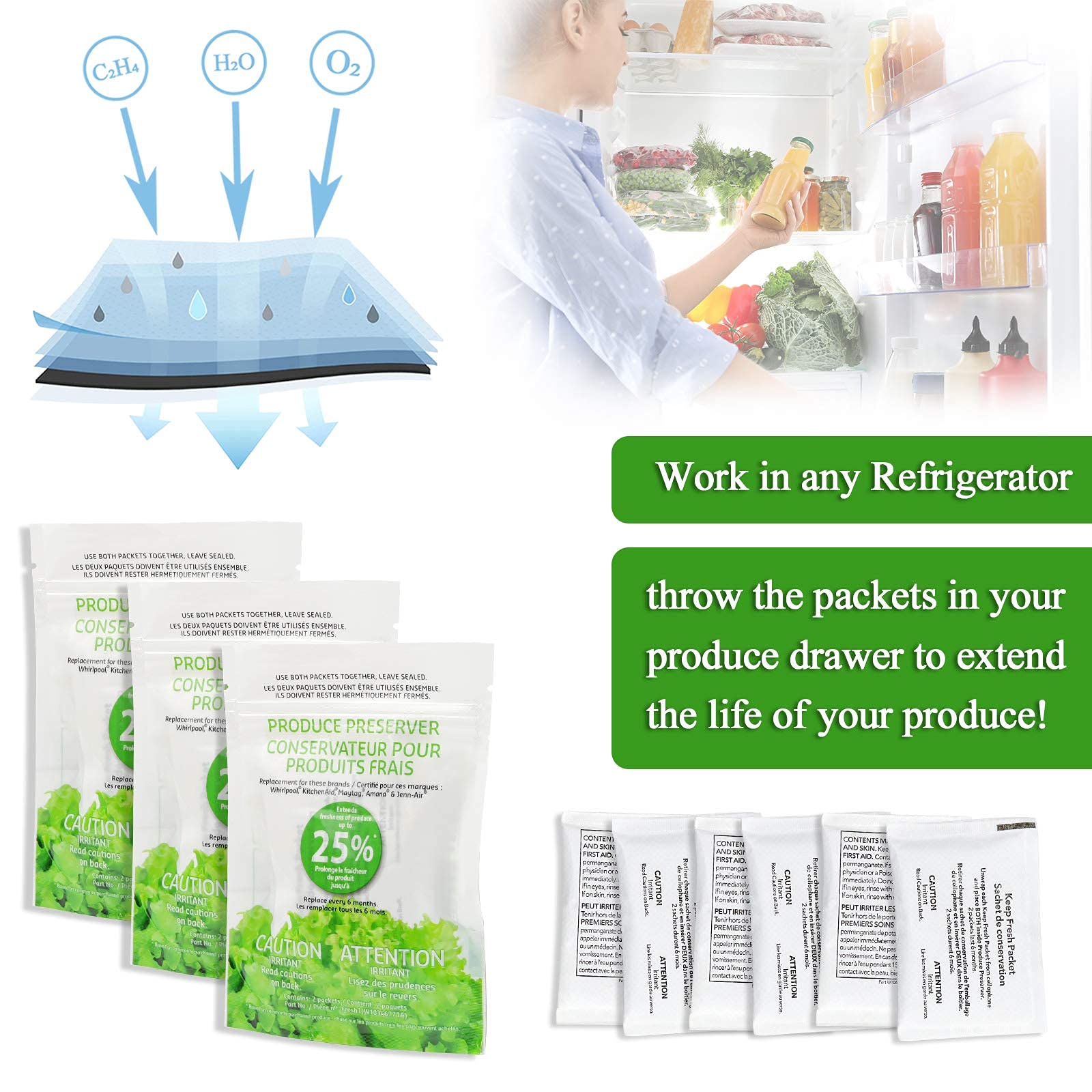 Produce preserver absorbs ethylene allowing the ripening process of many produce items to slow down. As a result, certain produce items will stay fresh longer that are kept in your crisper drawer extending freshness of produce up to 25%