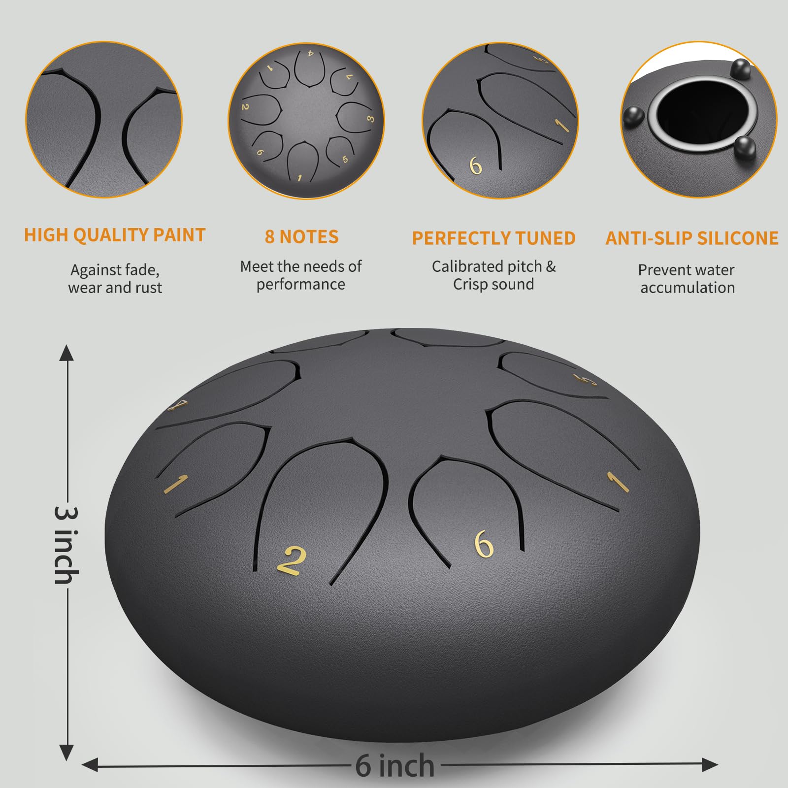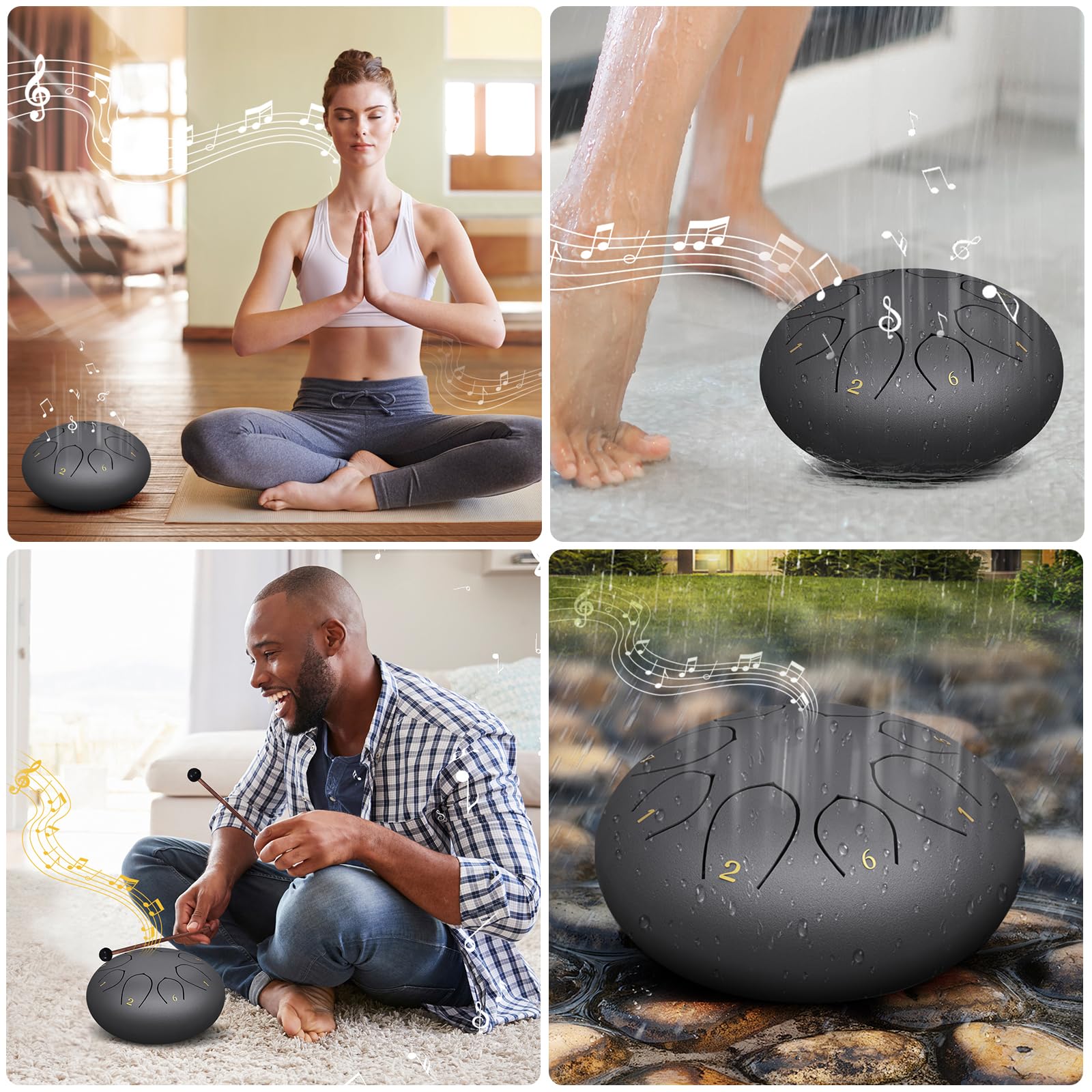 HIGH-QUALITY CRAFTSMANSHIP: Expertly crafted, this 6-inch chakra drum for rain is made from titanium alloy and coated with paint for exceptional corrosion and rust resistance, and can withstand various weather conditions. Each steel tongue drum is hand-tuned and precisely cut to ensure achieve accurate tones and harmonies.