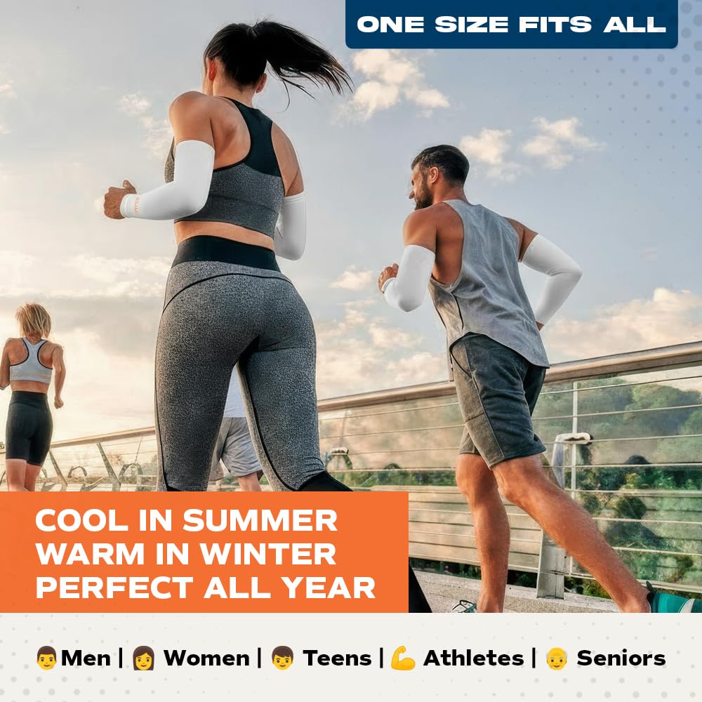 PROTECTION: Each compression sleeve arm protector is made from UV resistant material, our arm sleeves for women or men offer sun UV protection from over 98 percent of harmful rays; in colder months they make fantastic arm warmers