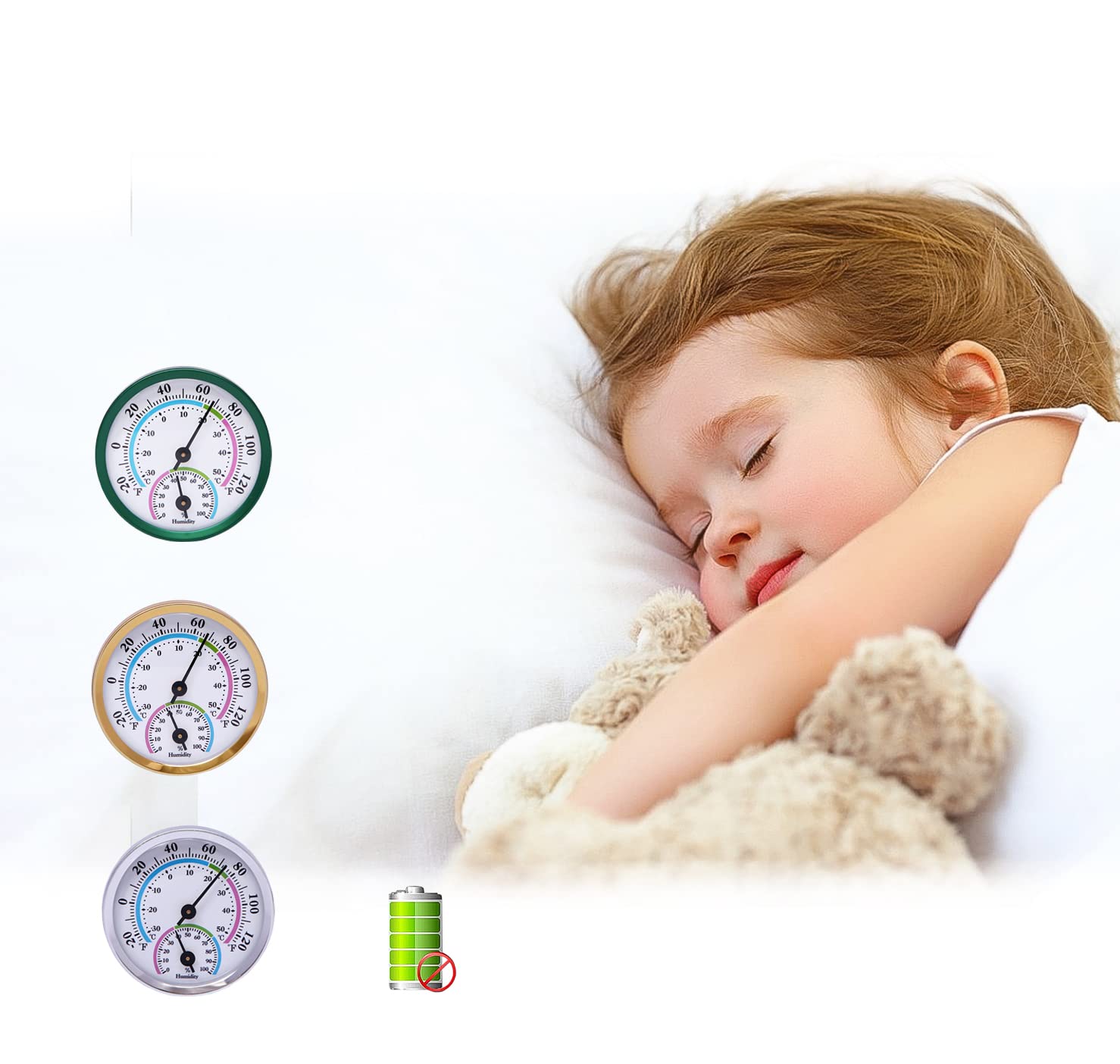 【NO BATTERY REQUIRED】 Mechanical thermometer and hygrometer has a longer life expectancy in use, no battery required. Avoid violent vibration and hitting, and do not disassemble by yourself.
