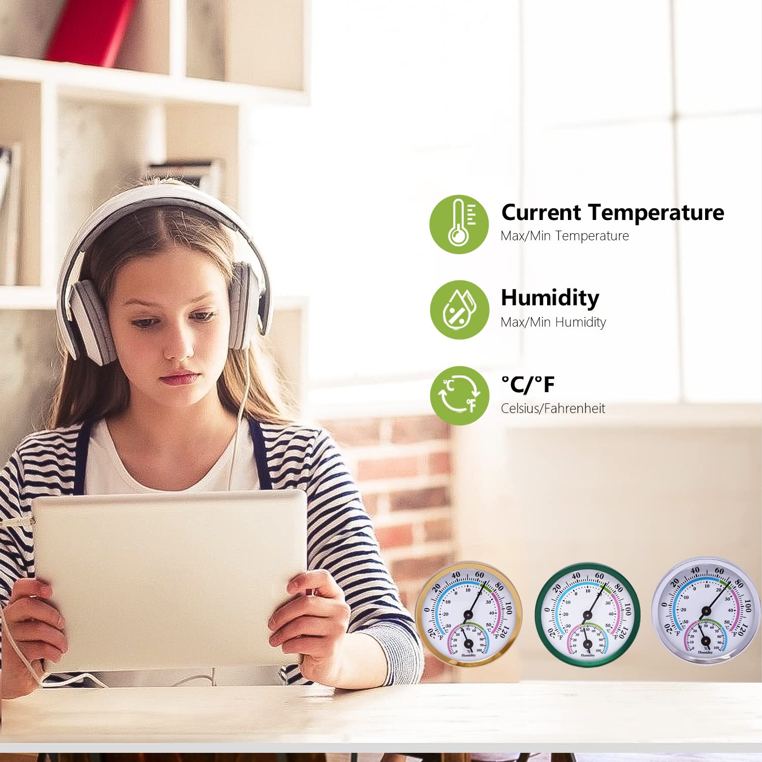 【EASY TO READ】 The Humidity Gauge is handcrafted from solid aluminum alloy with fine and clear dial, easy to read the scale. It is easily readable from a distance because of the large display. The temperature shows both °C and °F readings.