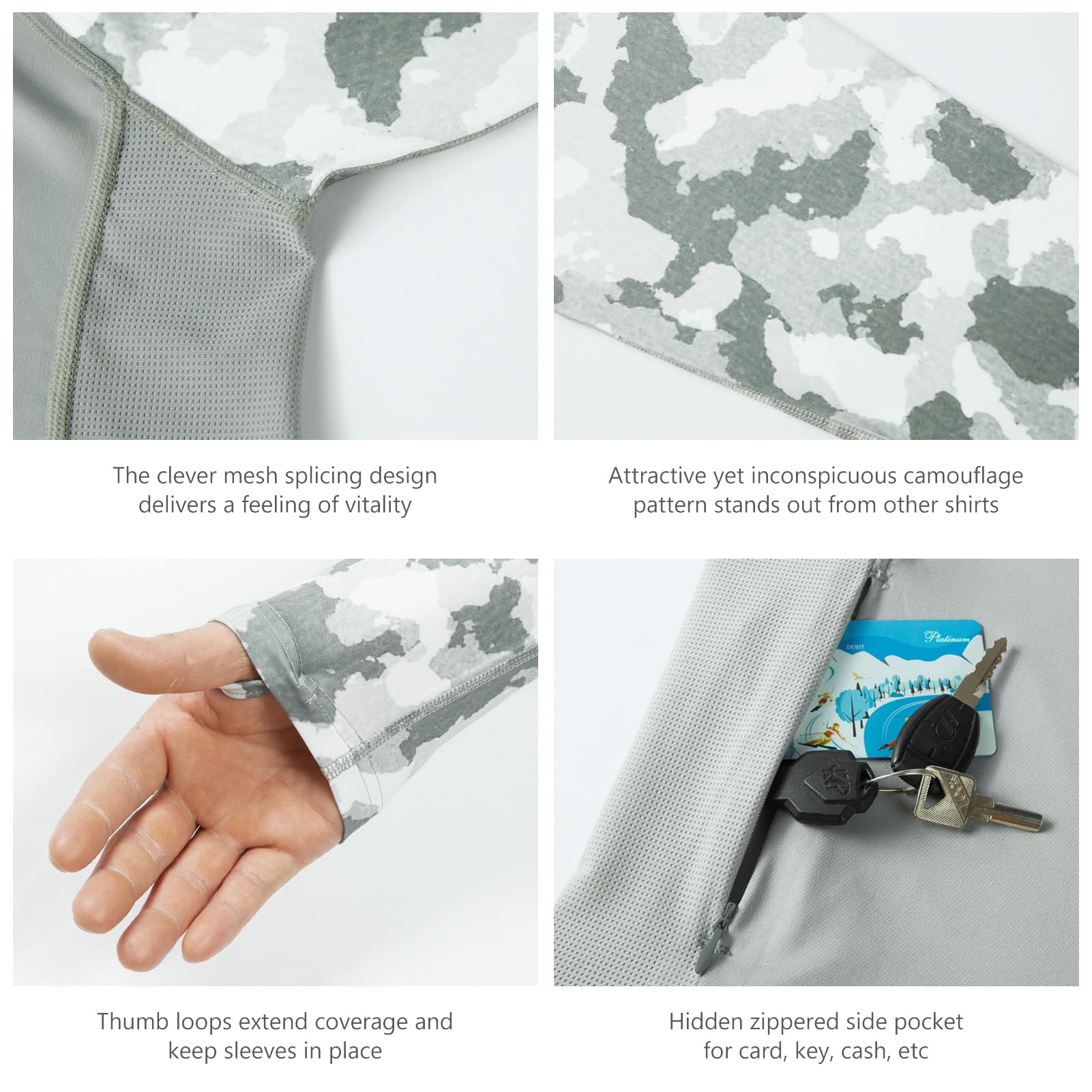 The streamlined hood provides greater sun protection over your neck and ears; The built-in thumbholes are designed to keep the sleeves in place; Hidden zippered side pocket for keeping your personal belongings like card, key, cash, etc