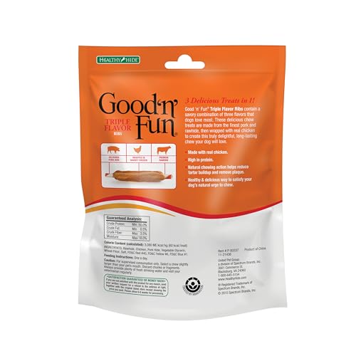 Treat your pup to a fun ‘n’ flavorful chew! Good ‘n’ Fun® Triple Flavor Ribs contain a savory combination of three tasty flavors that dogs crave. These scrumptious chews are made with long-lasting beef hide, premium chicken and delicious pork hide to create a truly delightful treat your dog is sure to love. Wrapped with premium cuts of real chicken, these chews are high in protein. Plus, they're a fun and delicious way to satisfy your dog’s urge to chew, while the natural chewing action helps reduce tartar buildup and remove plaque. Feed one a day. For supervised consumption only. Select a chew slightly larger than your pet’s mouth. Discard chunks or fragments. Always provide plenty of fresh drinking water and visit your veterinarian regularly.