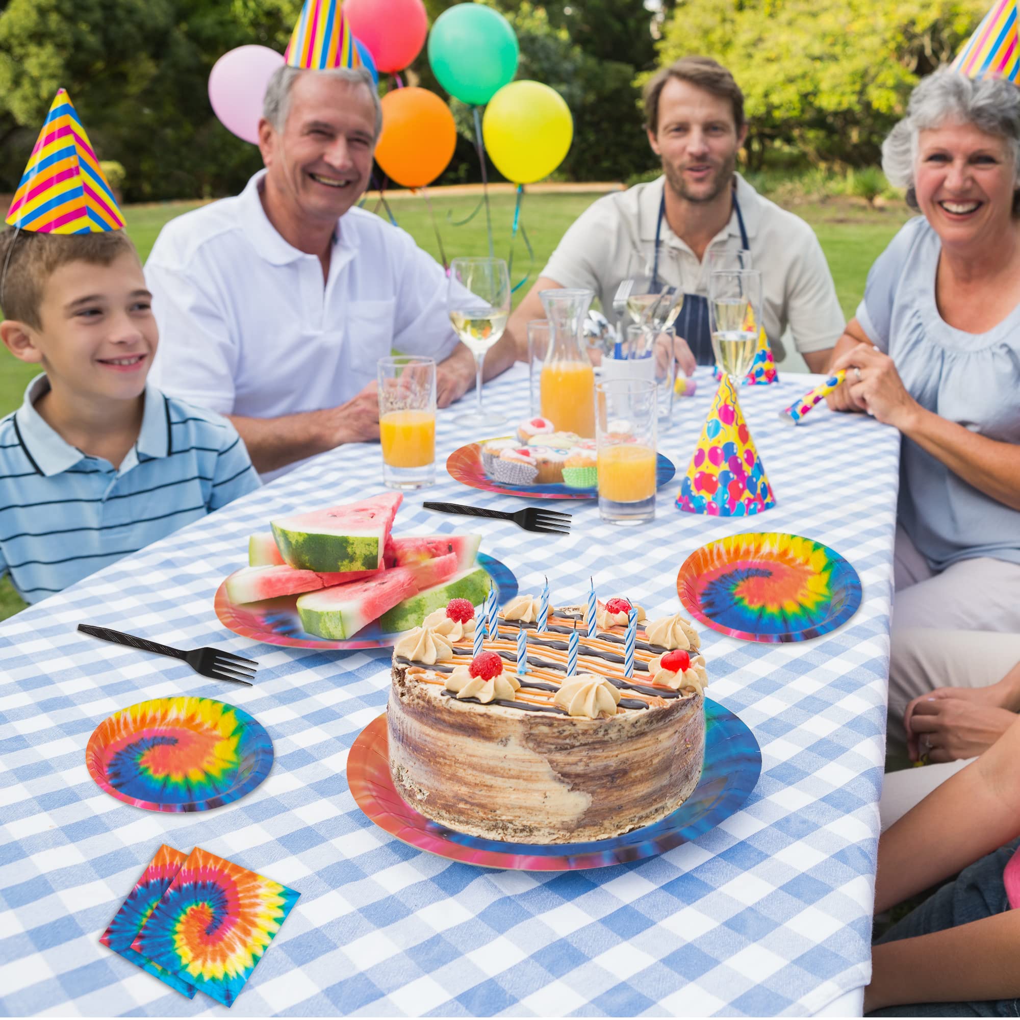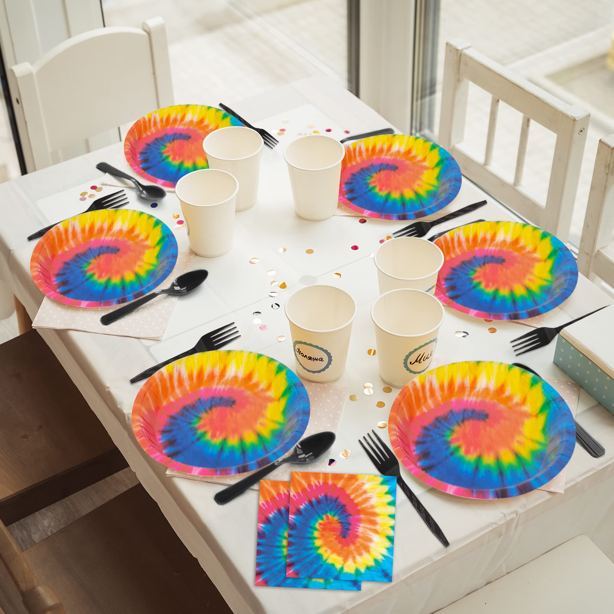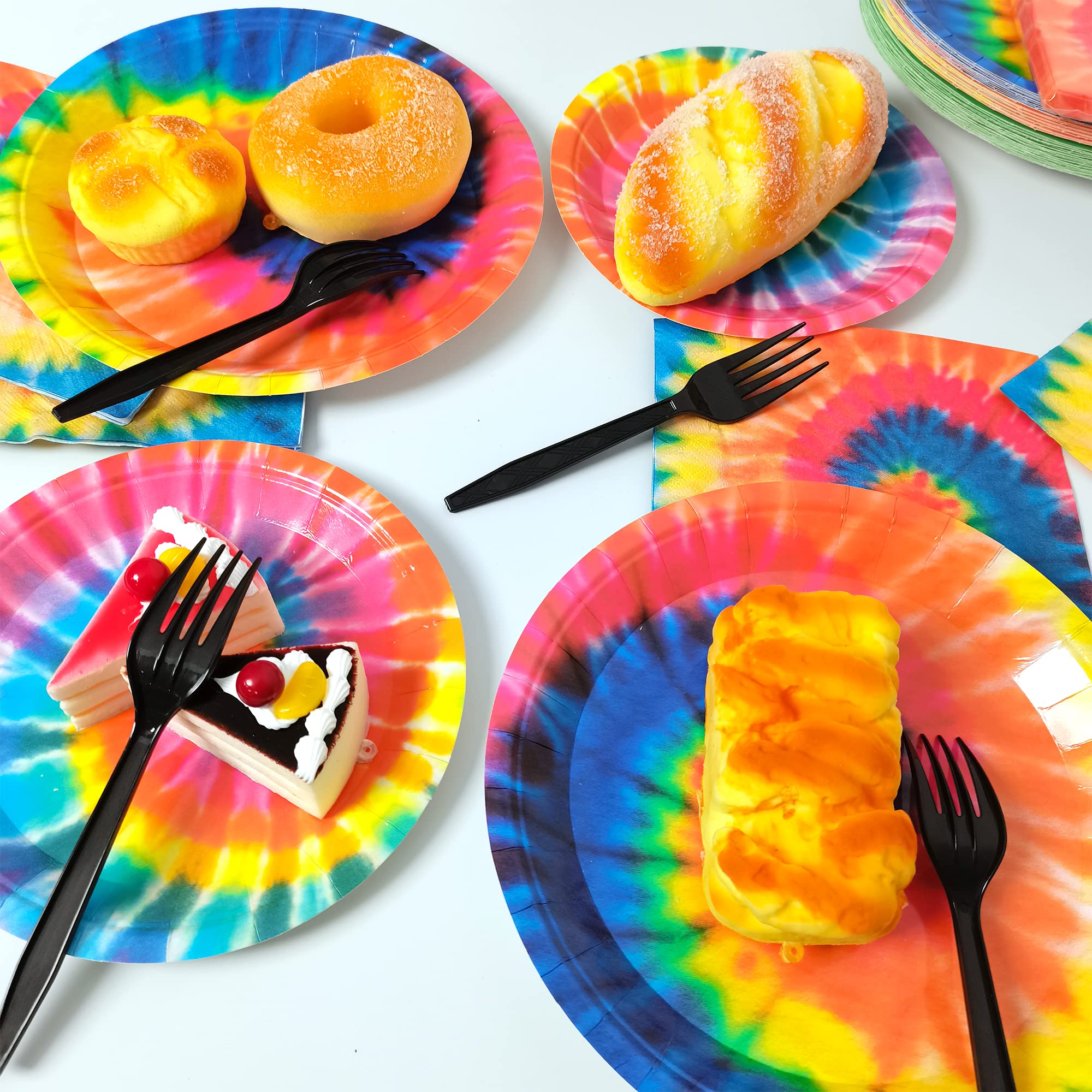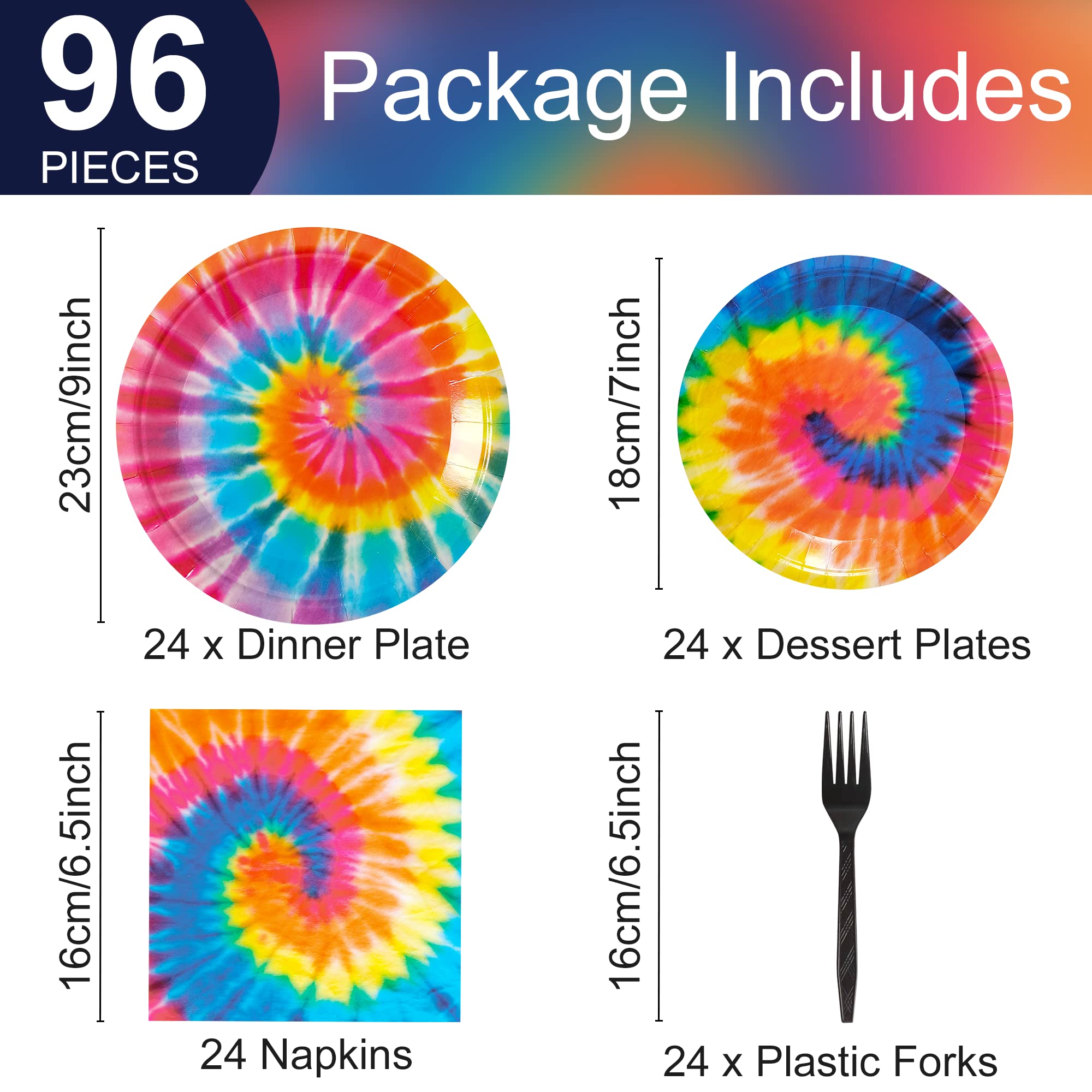 Package includes: You will get 24pcs of 9in Tie Dye party paper plates, 24pcs of 7in Tie Dye party paper plates, 24pcs of 6.5in napkins and 24pcs of plastic forks, each set can hold 24 guests.