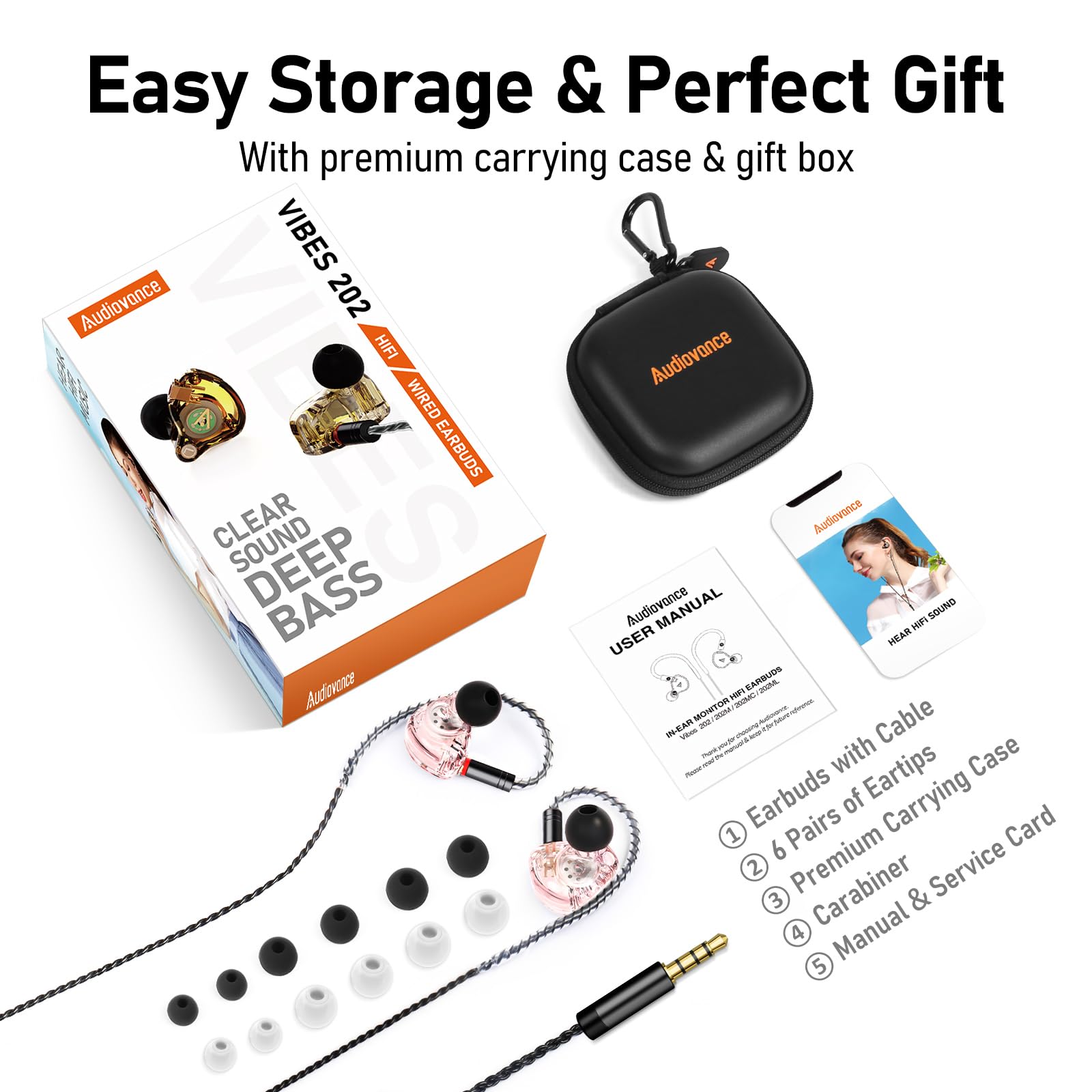 COMFORTABLE FIT & NOISE ISOLATION - Ergonomically designed to fit the ear canal, Vibes 202 IEM headphones feature preformed over-ear earhooks for a secure fit and keep cables out of the way. With 6 pairs of soft, breathable eartips (in 2 colors and 3 sizes), they ensure optimal comfort and stability while effectively blocking ambient noise for immersive listening.