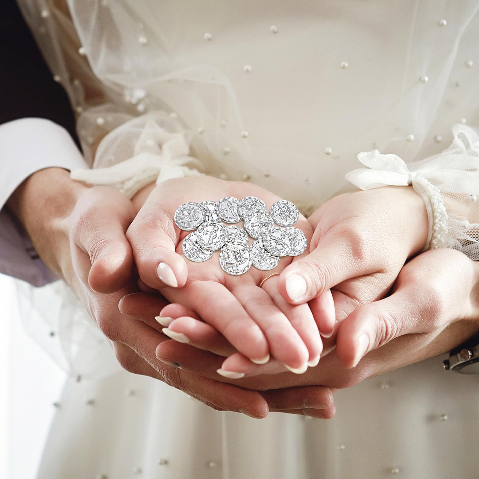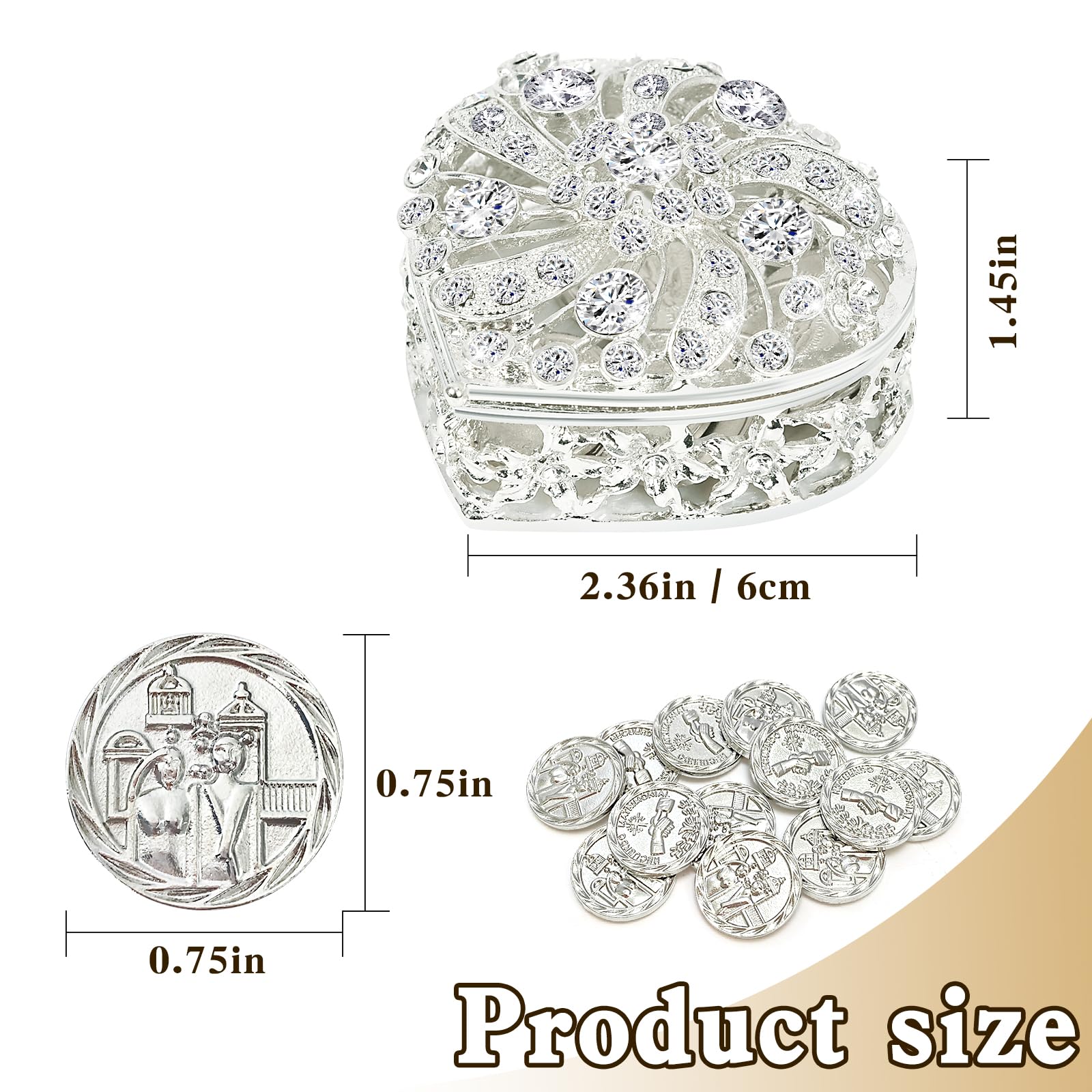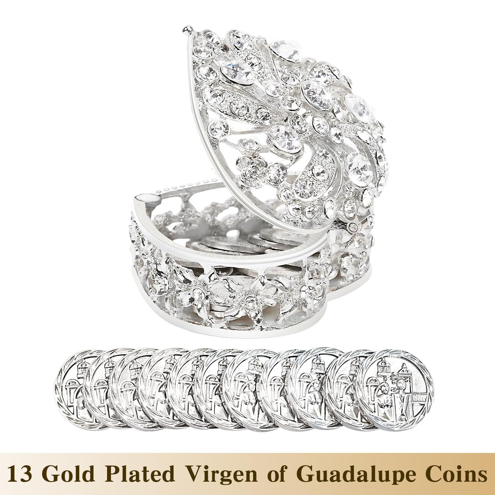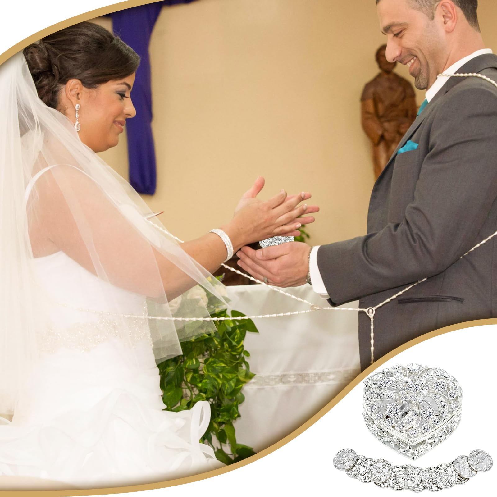 Wedding Arras Set:Enhance your Catholic wedding ceremony with this beautiful silver box. It comes with 13 elegant silver coins, symbolizing blessings for your lifelong journey. Adorned with rhinestones and crystals, it adds a touch of elegance to your special day. Seal your commitment to love, unity, and prosperity as you exchange these coins.