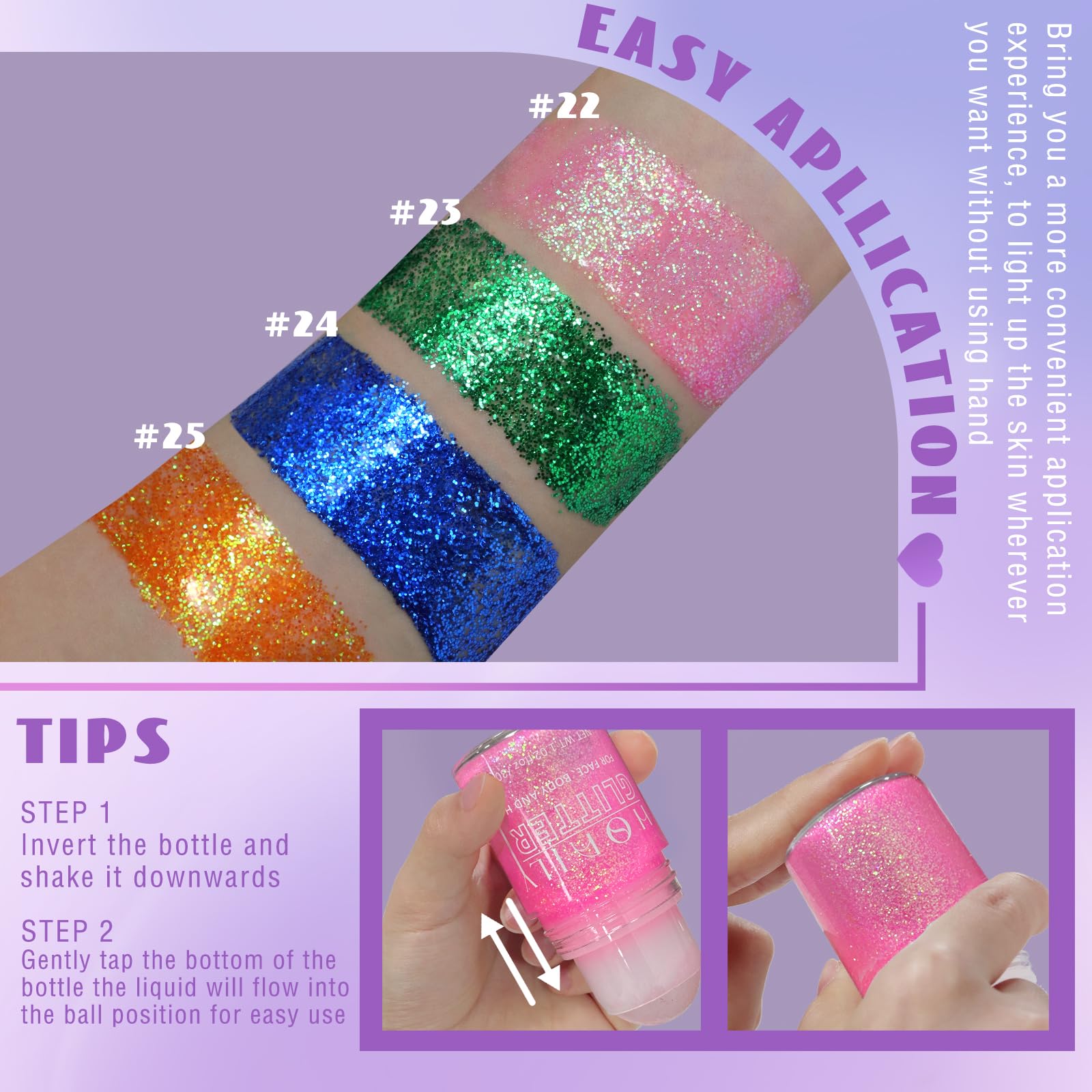 Roll On Body Glitter Gel: Our body glitter is convenient for using, roll-on design can make the glitter apply evenly to your face and body. When the ball rolling on your skin, you will feel comfortable and great touch, give you good experience without using hands