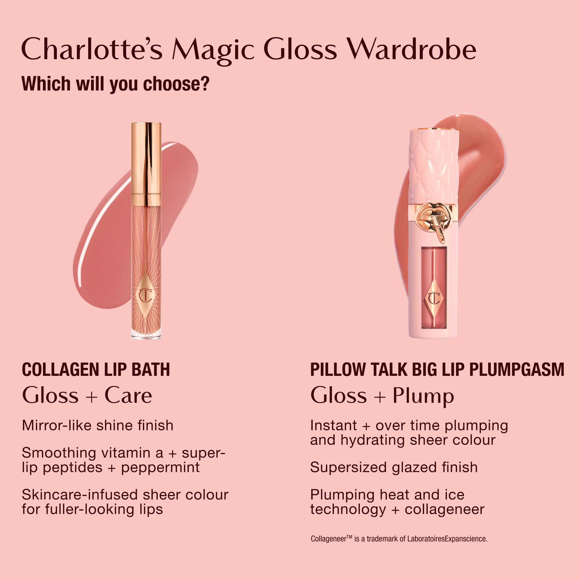 Darlings, discover my Pillow Talk Big Lip Plumpgasm, a lip-plumping lip gloss to supersize + maximise! Just pump, plump + pout for big lips, wow! Lips look 93% plumper instantly!* Plumps the look of natural lips by 25% in 2 weeks!** Available in 2 universally-flattering shades! Fair/medium is a pink nude and medium/deep is a brown berry-pink! Glide on and feel the sensation of Plumpgasm work its magic, giving you fullness from the first touch! Itβs my lip-amplifying secret for a juicy, plumped up pout in seconds! And darlings, the plumping effect does not stop there! The more you wear it, the more your natural lips look plumper + smoother! Enriched with plumpgasm heat + ice technology, plump-effect collageneer* and hydrating hyaluronic acid, the formula combines the hydrating comfort of a balm + the amplifying power of a lip plumper with the beautifying pretty pink pillow talk effect so your lips look plumper + smoother! One pillow talk product sold every 2 seconds!* **tested on 30 people. **tested on 33 people with twice daily application ***market rankings based on circana npd prestige beauty data fy 2023 value sales *Collageneer, is a trademark of laboratories expanscience