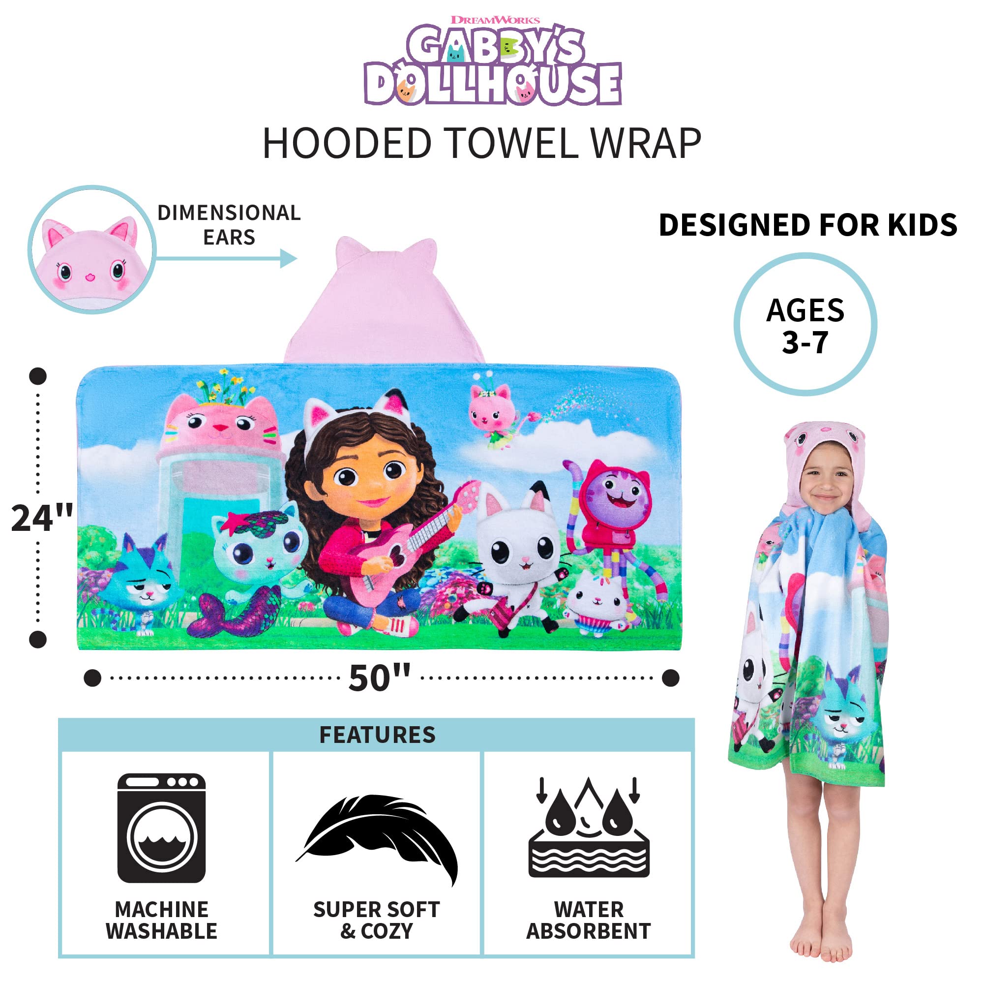 GABBY'S DOLLHOUSE DESIGN: Bring the "Gabdorable" world of Gabby’s Dollhouse to your bathing & swimming routines with this cute hooded towel. Featuring Gabby, DJ Catnip, CatRat, MerCat, Pandy, Cakey & Kitty Fairy from the popular DreamWorks animated series