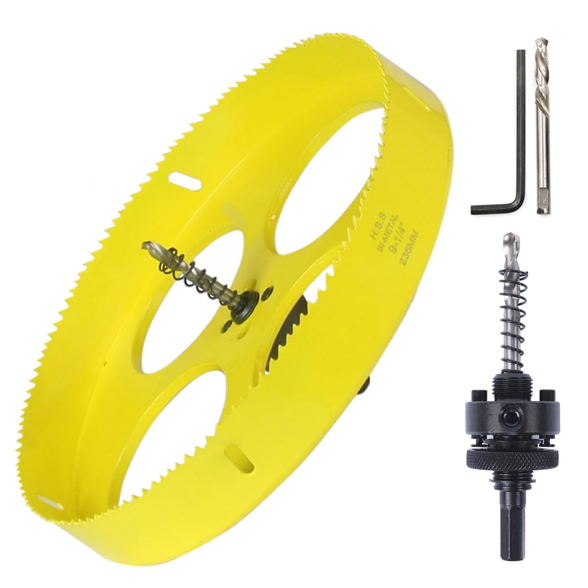 HSS M42 Bi-metal 9-1/4 Inch Hole saw : 1.diameter 9-1/4" (235mm) 2.Cutting depth 1.24 inch (32mm) 3.include 1pcs bimetal hole saw 9-1/4 inch,1pcs mandrel with pilot drill bit and spring,1pcs extra pilot drill bit,1pcs wrench. 4.This hole saw of 9-1/4 inch is good for wood working, also can make some holes on thin soft steels. and the big mandrel is better for fixing the hole saw, so that it is more stable and efficient when drilling,and the service life for hole saw is longer 5.please use low rotation speed for these big hole saws in first, and later with higher speed. 6.It is useful to make 9-1/4 inch holes for cornhole boards, air ducts, ceiling lights, speakers and more