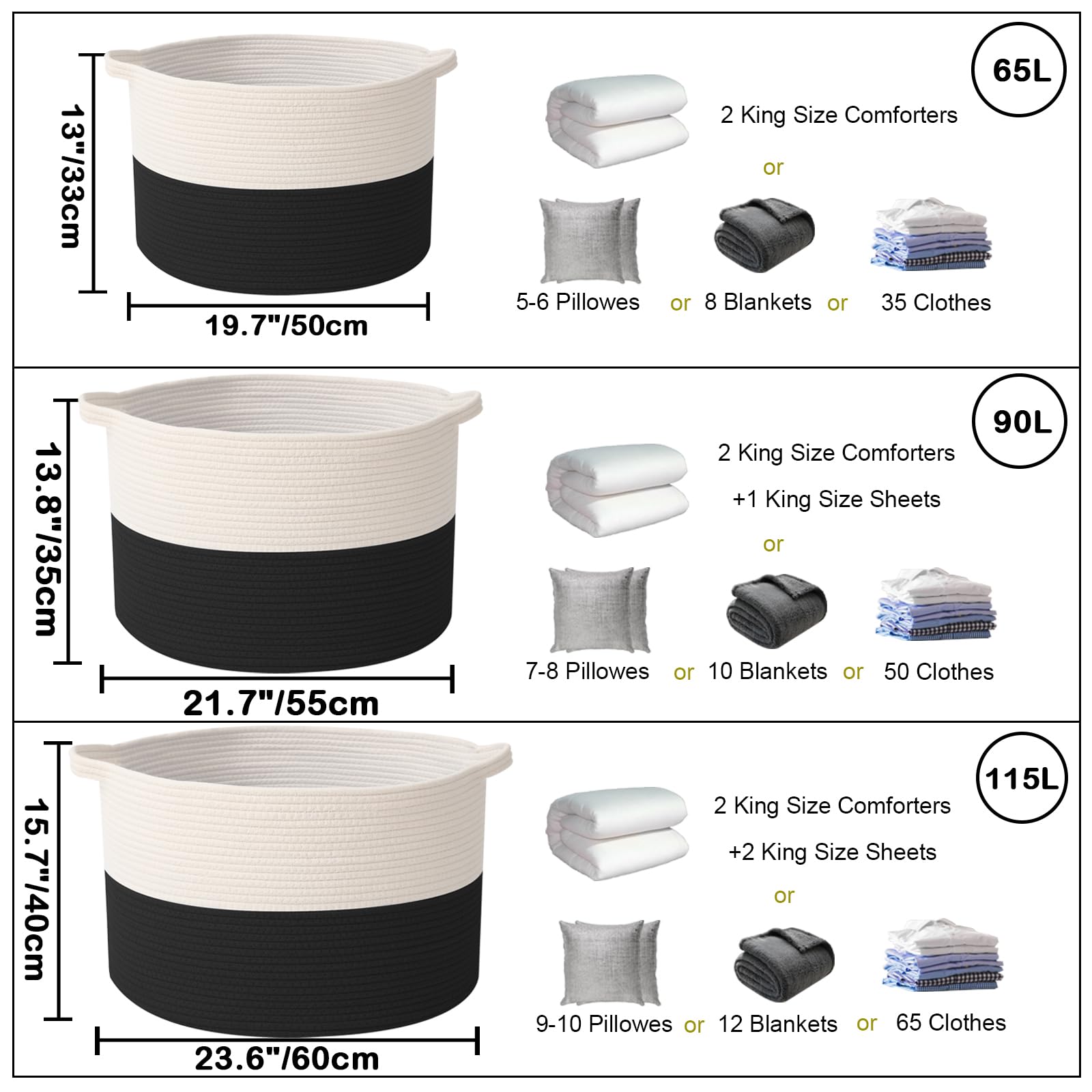 HZFTJOY 90L Large Blanket Basket,21.7"L x 21.7"W x 13.8"H Rope Woven Baskets with Handles, Toys Storage Bins,Laundry Basket Perfect for Living Room, Nursery,Bedroom,Home Organization,White&Black