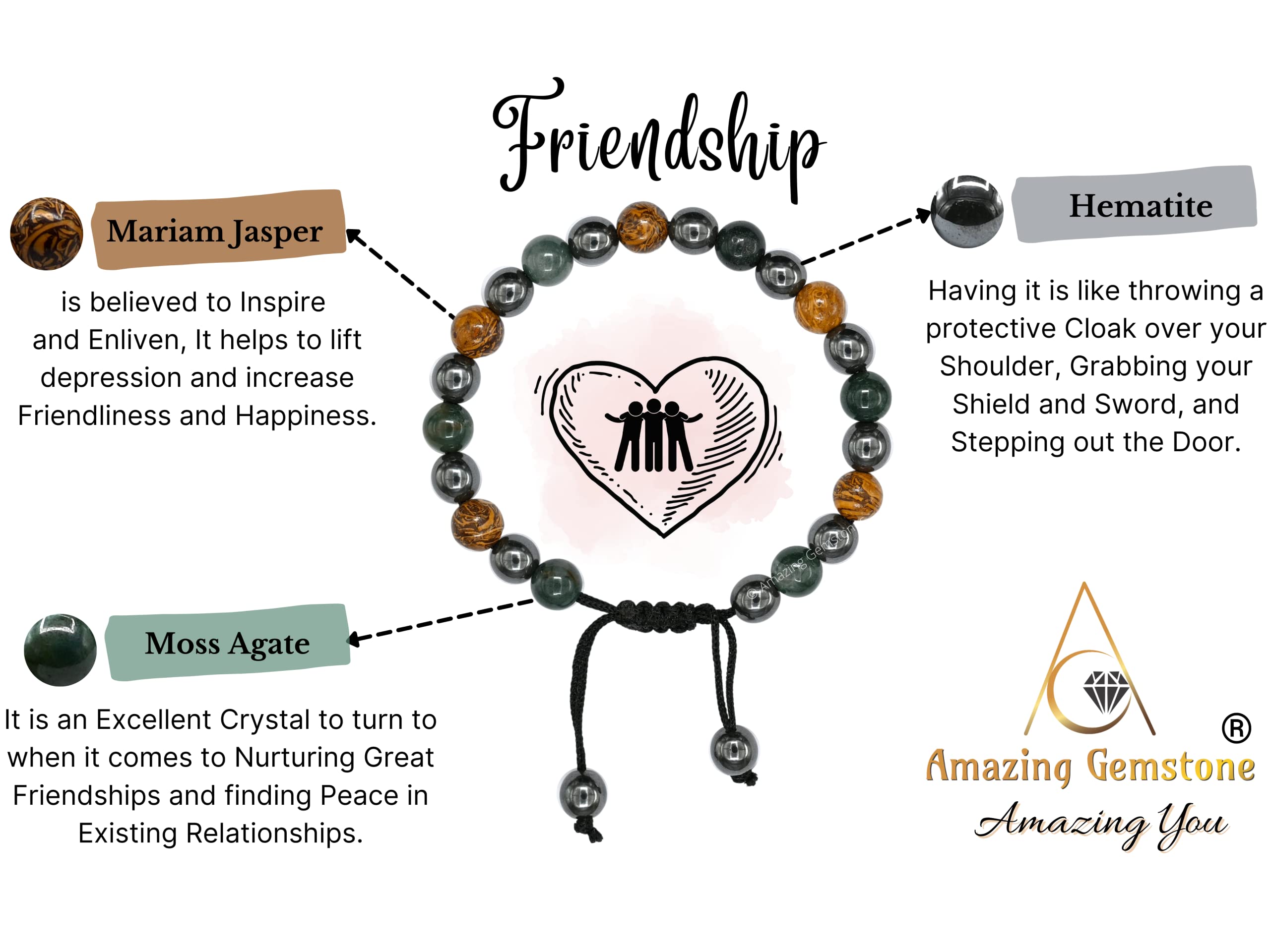 Bracelet for Friendship contains real crystal beads Moss Agate, Mariyam Jasper and Hematite. Moss Agate to nurture friendship, Mariyam Jasper to increase friendliness & Hematite as protection shield.