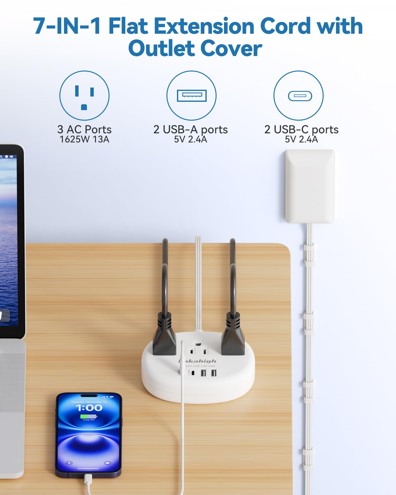 【7-in-1 Flat Face Extension Cord】The hider extension cord with 3 outlets + 4 USB ports can safely charge up to 7 devices from a single small wall charging unit. Max Capacity Up to 1625 Watt(Max 125 Volt, 13 A). Compatible with cellphone, laptop, tablet, earphone or cameras without a variety of converters,keep your desktop organized, a must have accessories for college dorm room, travel and etc.